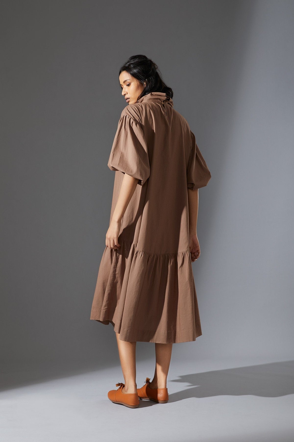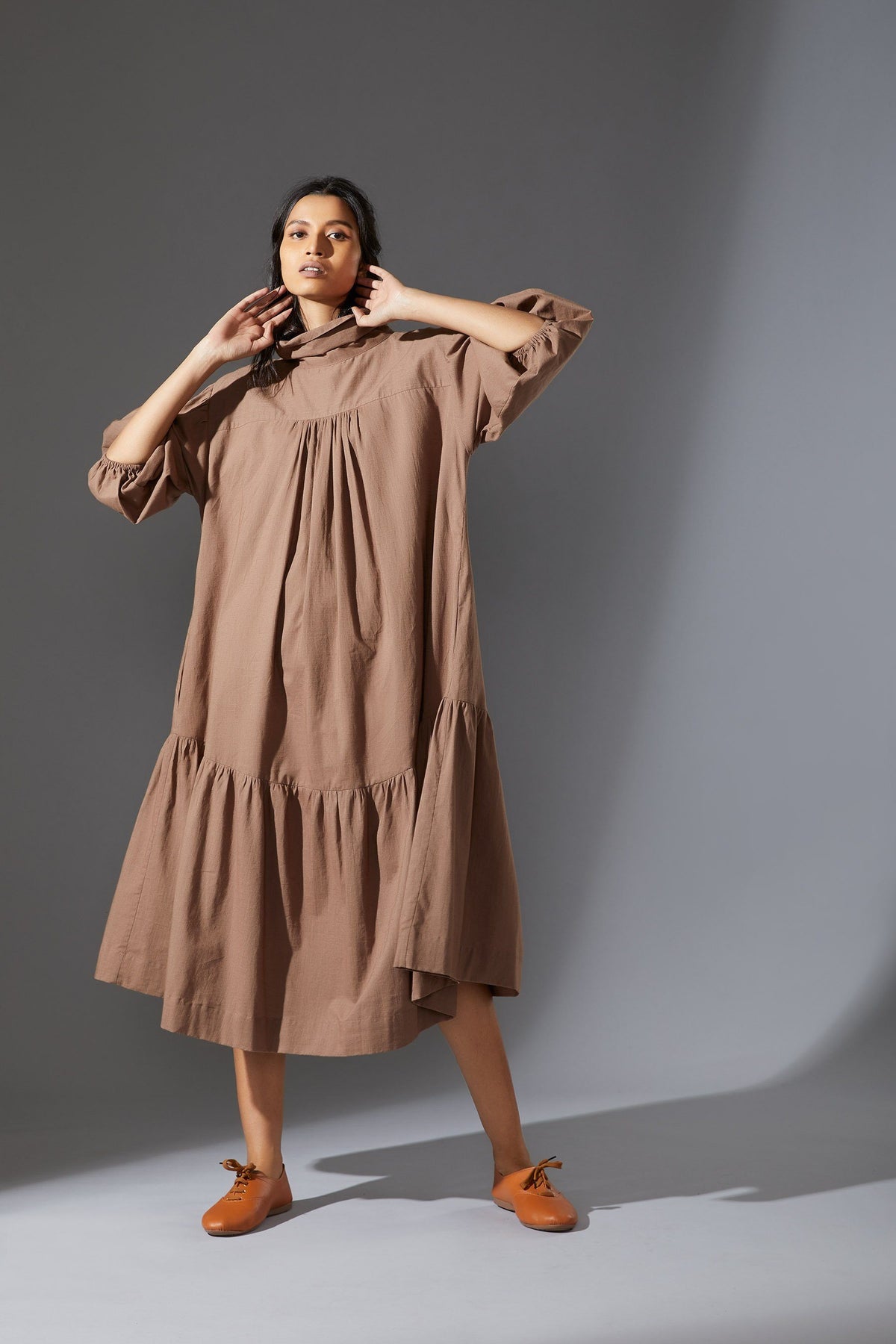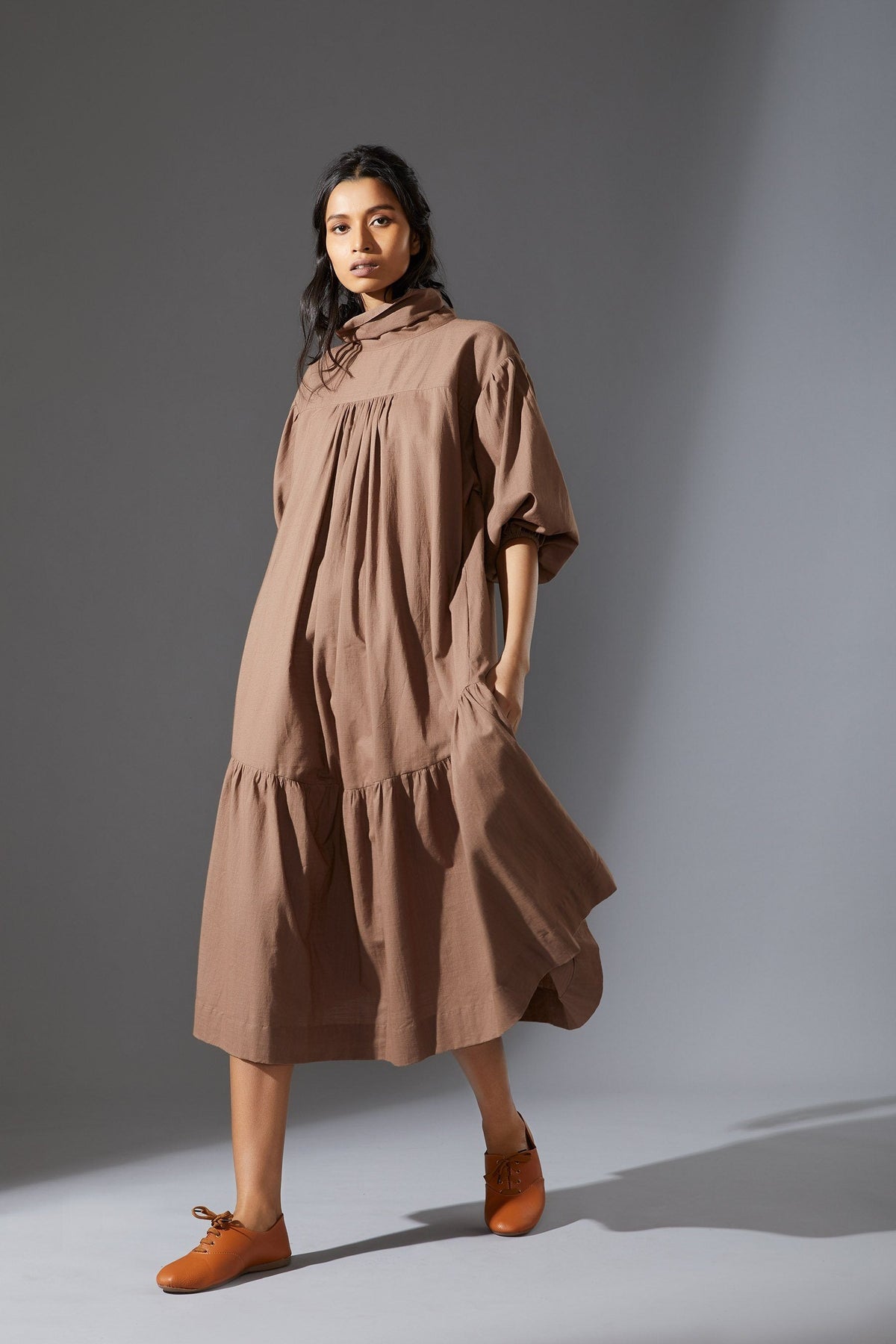 This fun and stylish dress is made with a luxurious handwoven cotton slub fabric. It has pretty blouson sleeves, high collar and an adjustable belt to define the loose shape. Style yours with lace-up sandals and a tote.