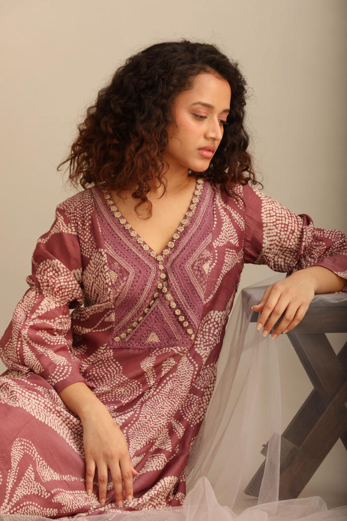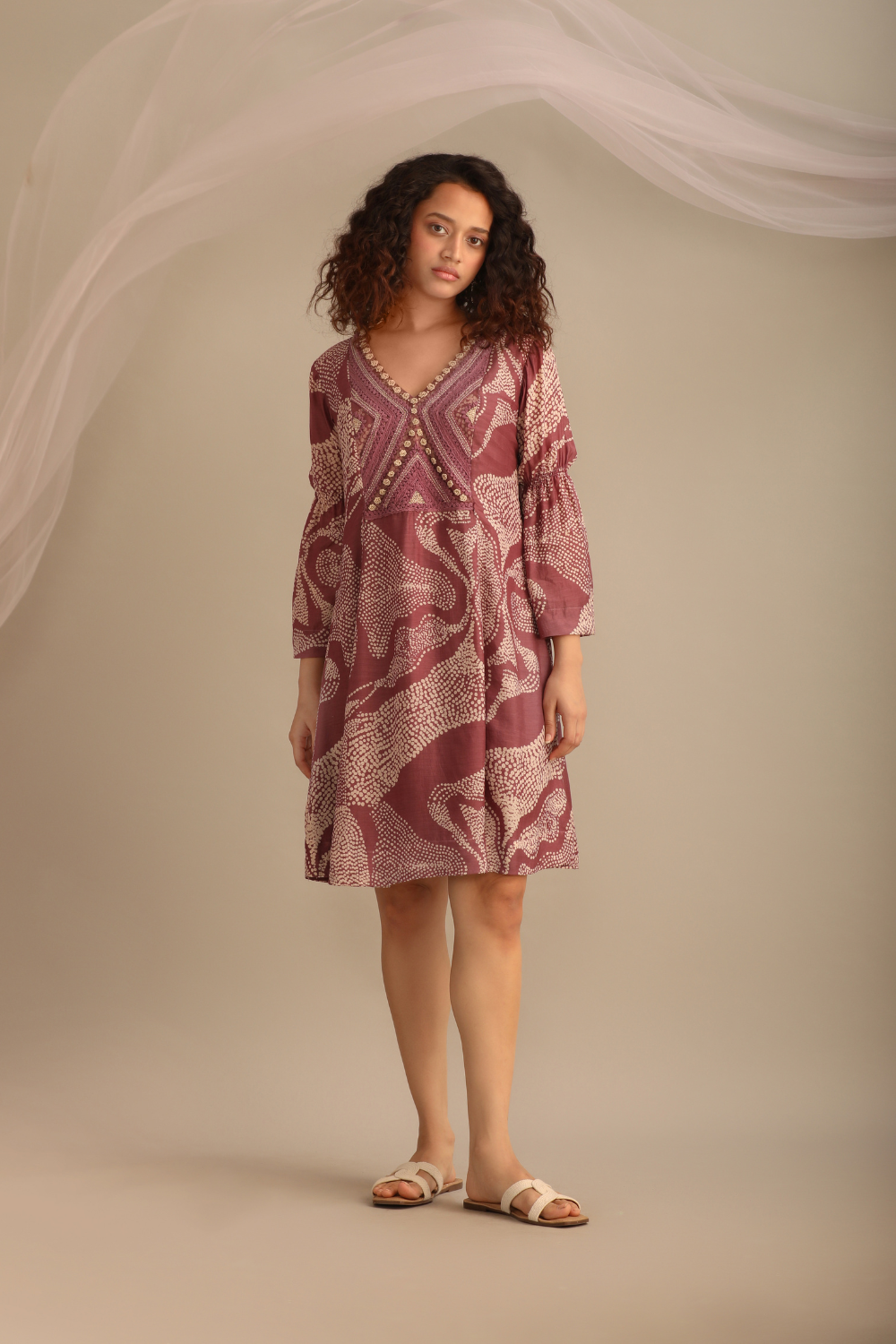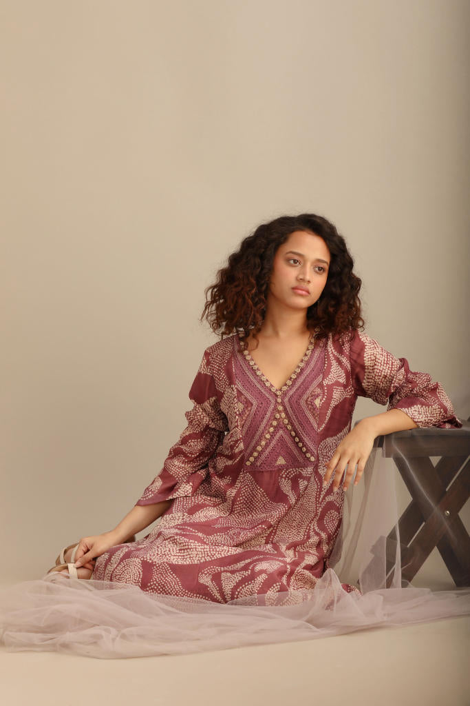 Landscape print knee length dress with chiffon cording hand embroidary on the squared yoke