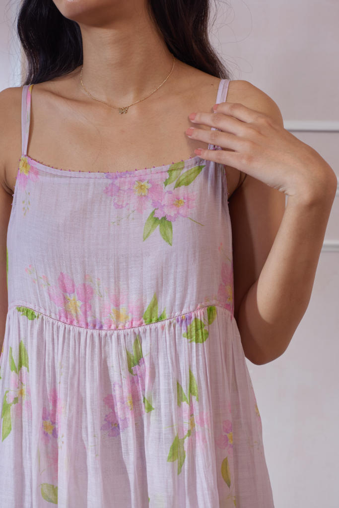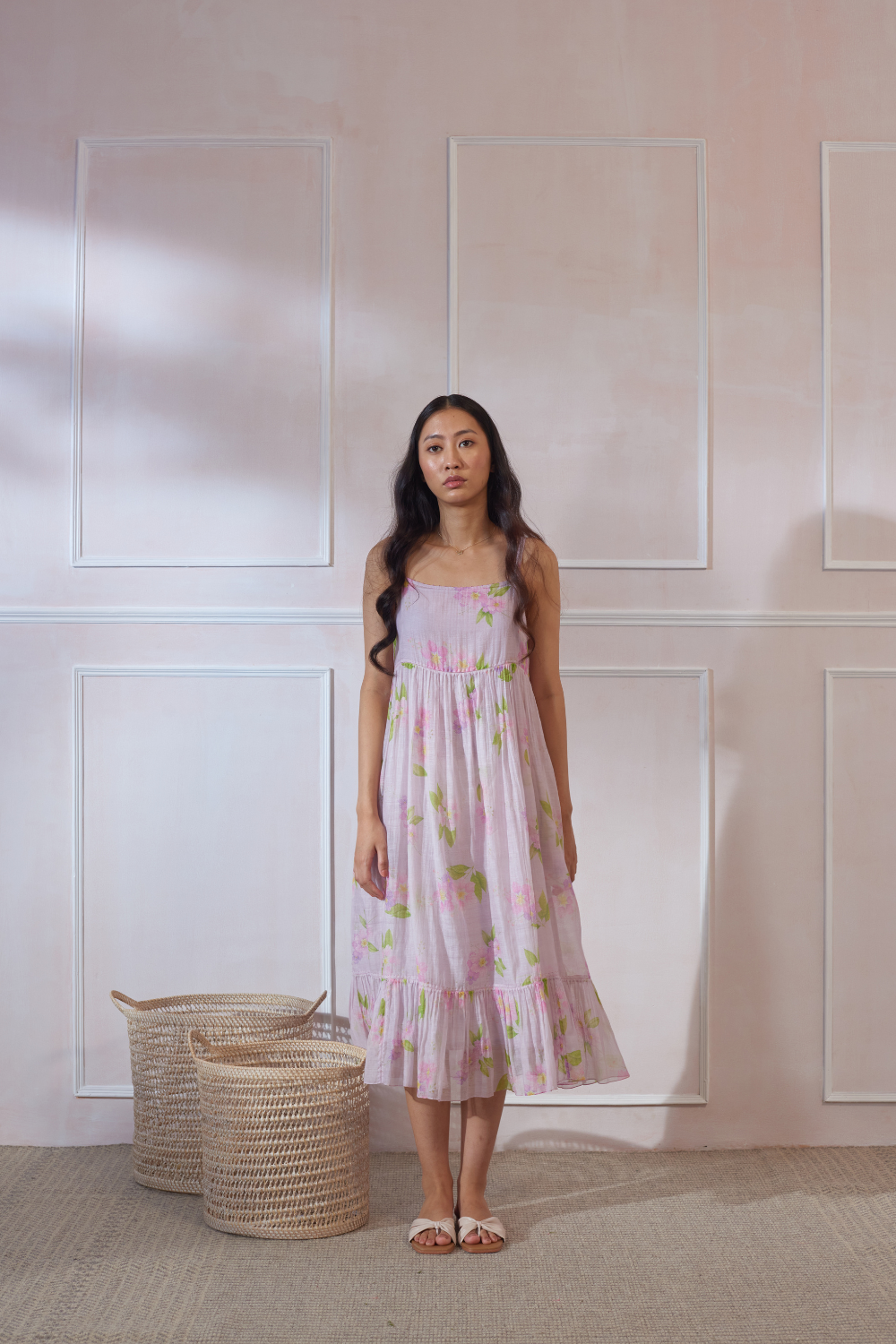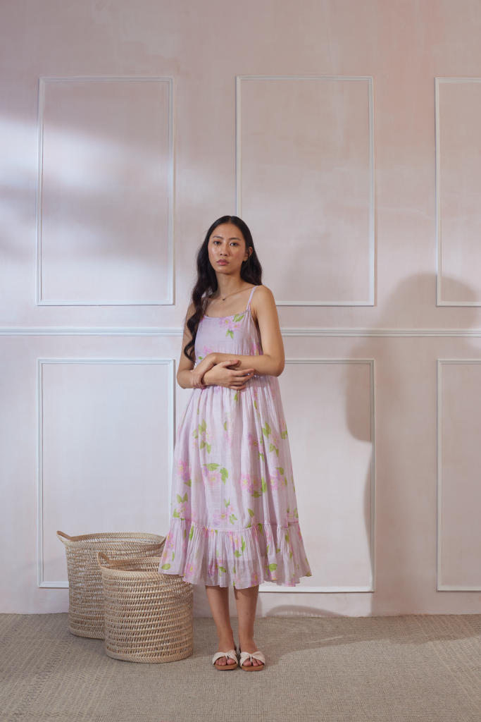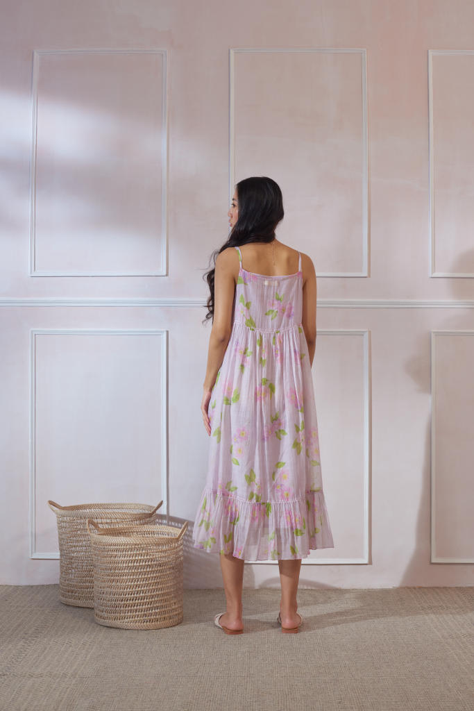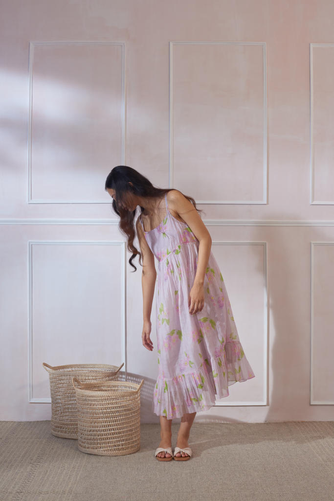 Cotton and silk midi dress with cotton slip. Strappy shoulder. Ruffled hem. Length of the dress is 45"