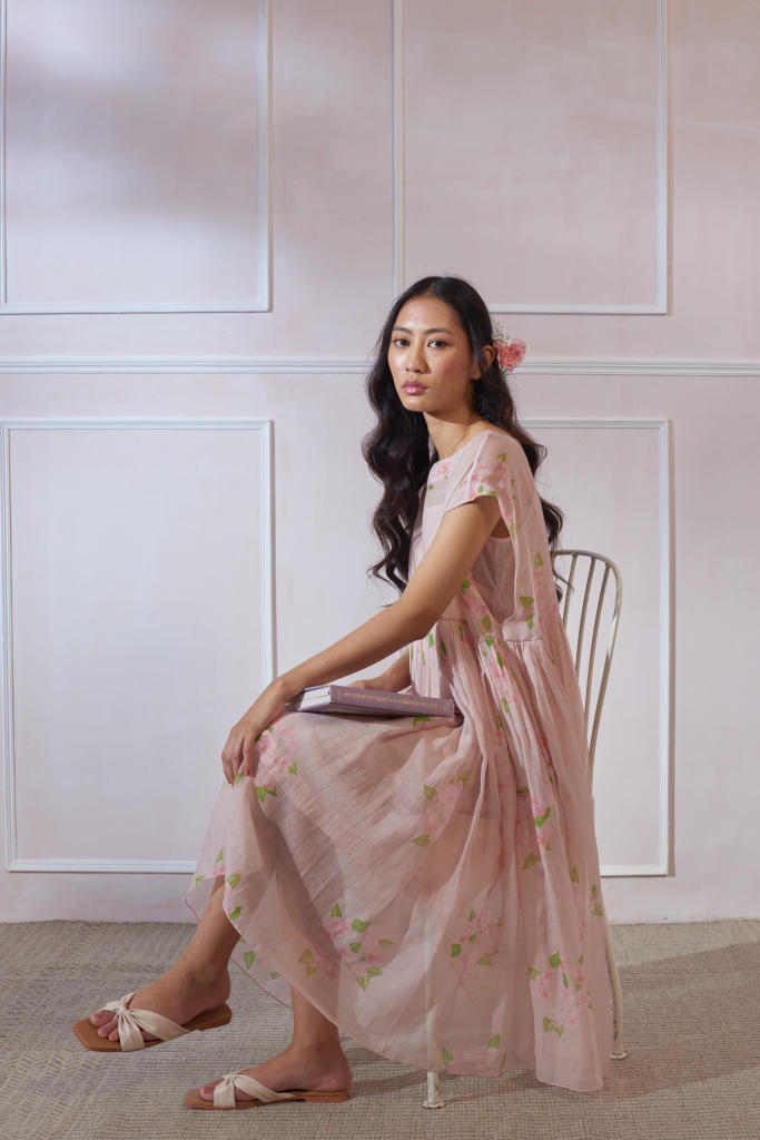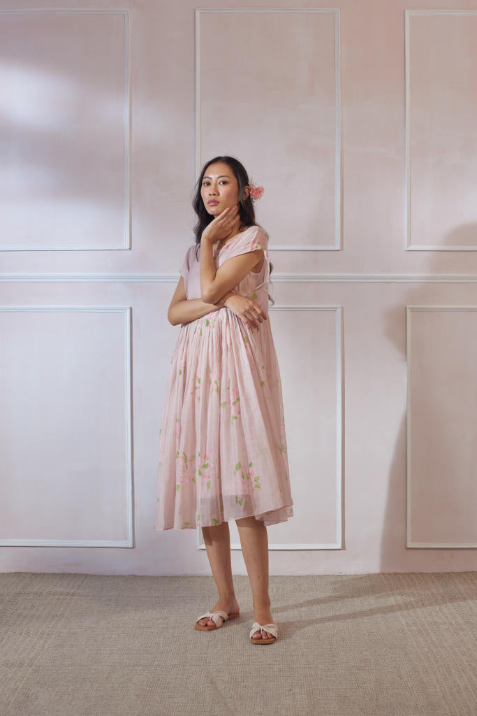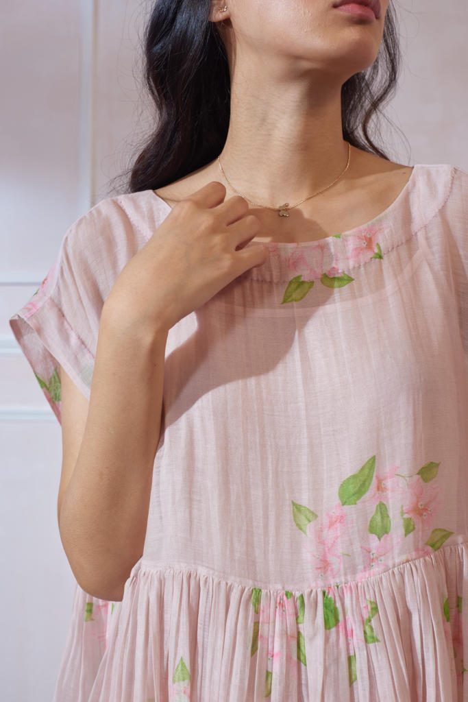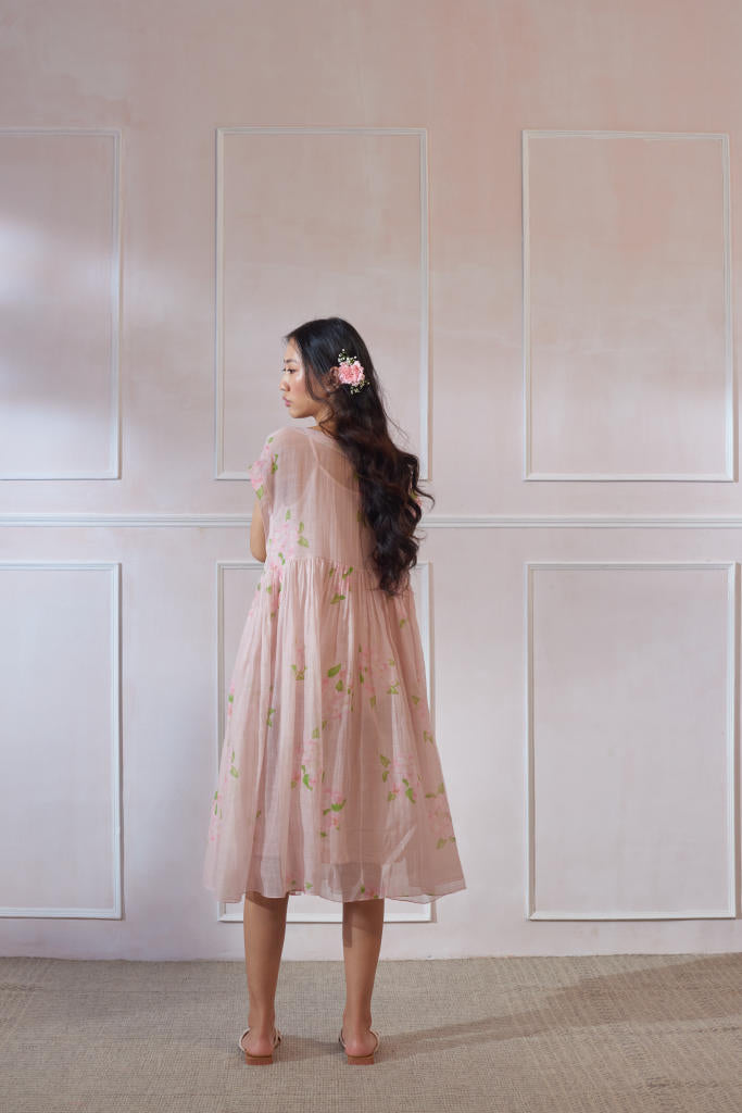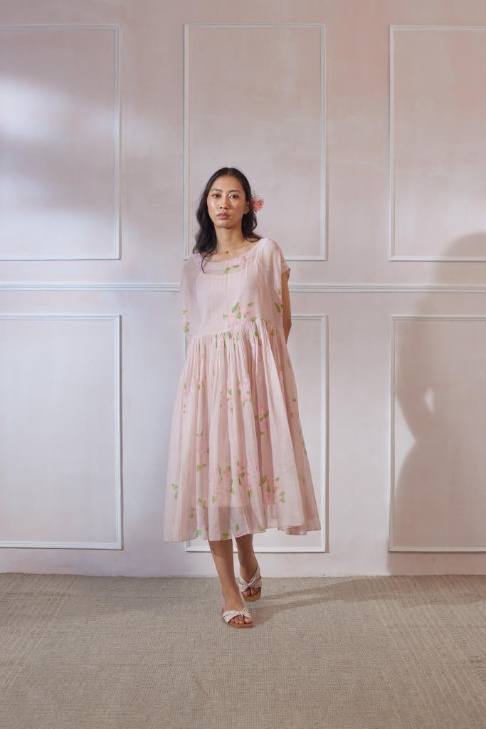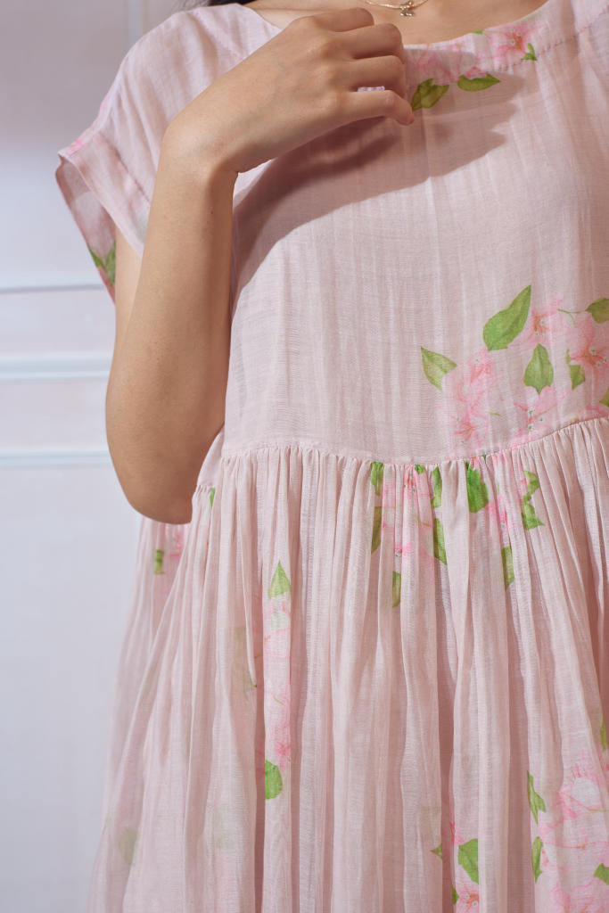 Handwoven silk and Cotton Bougainvillea print Tap Dress. Easy and Relaxed fit. Comes with Cotton inner. Dress length 38 inch.