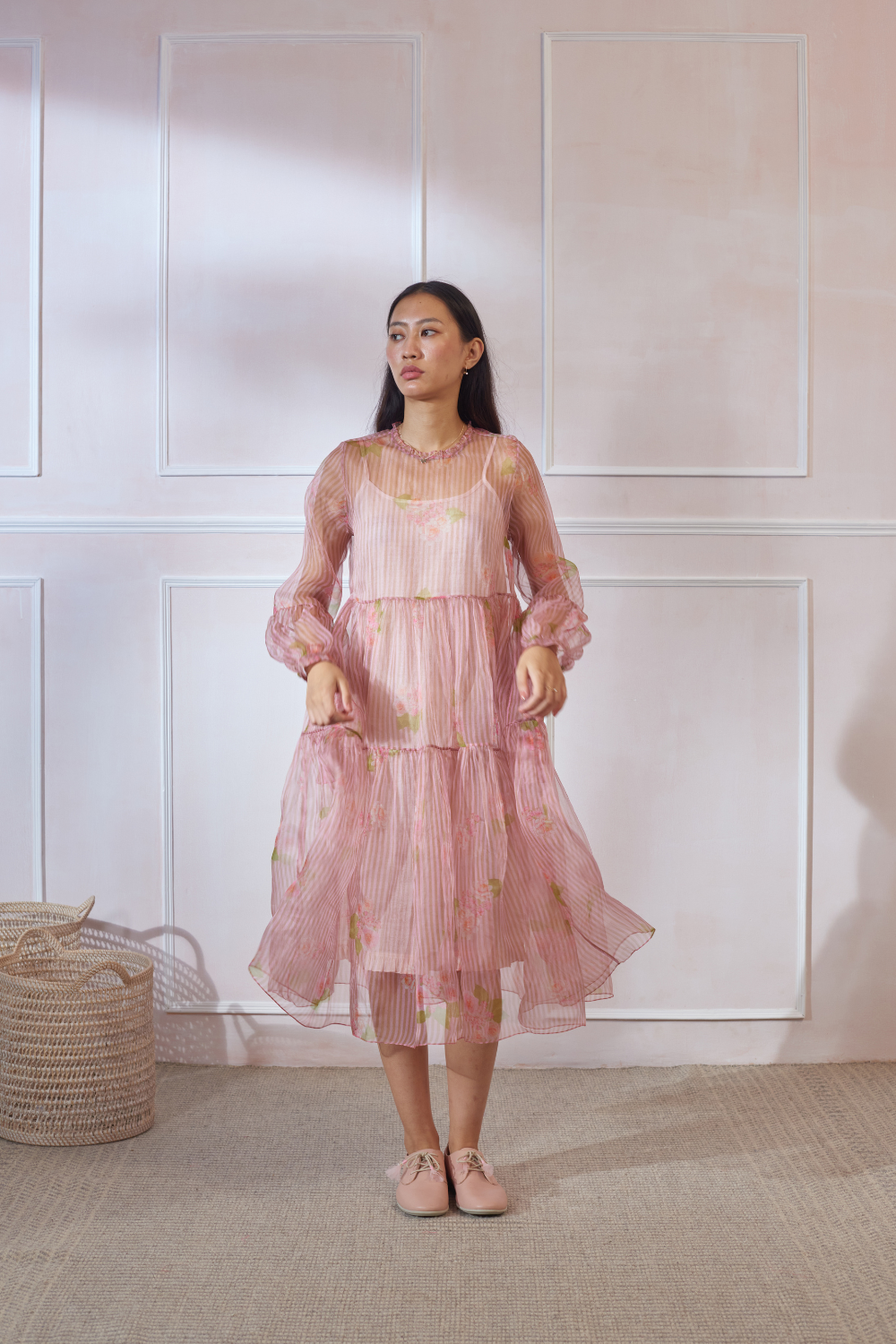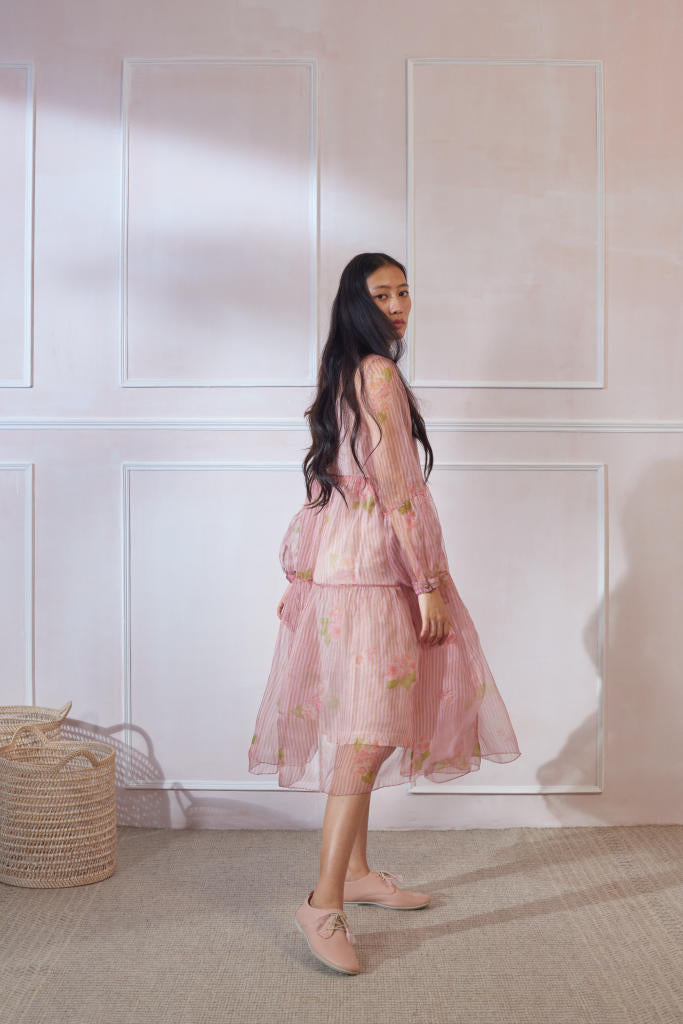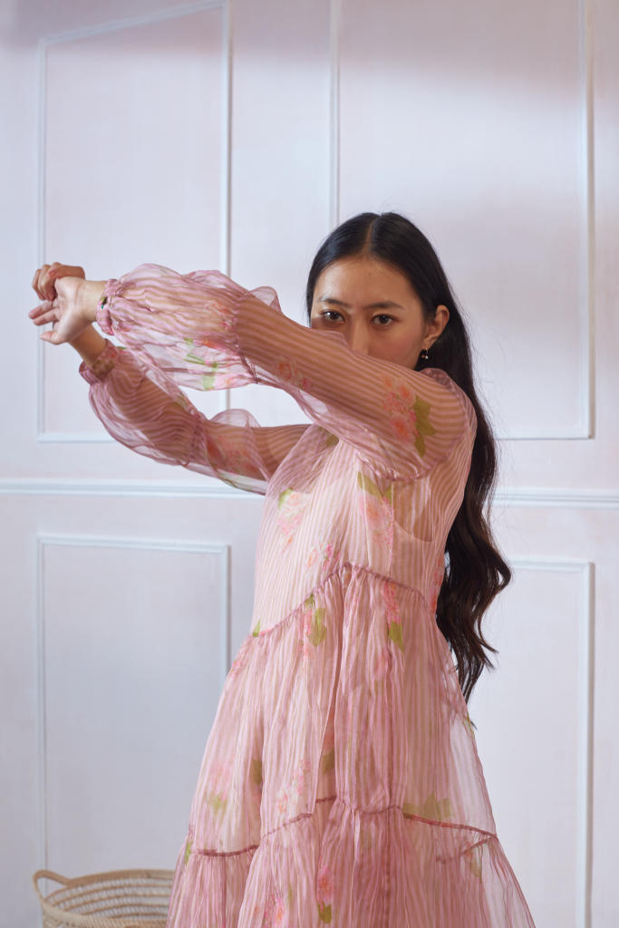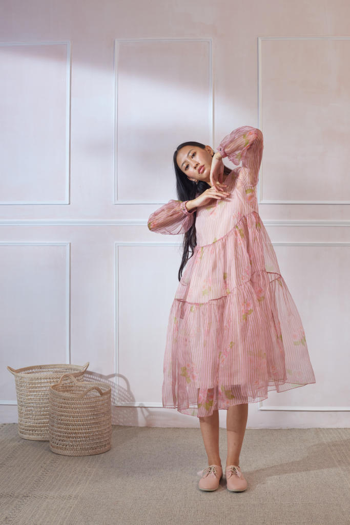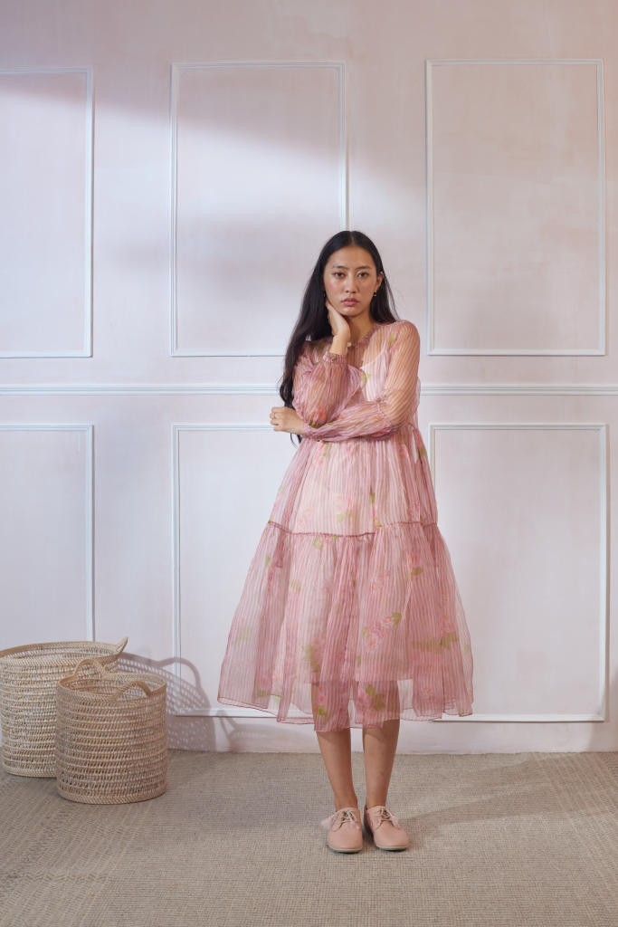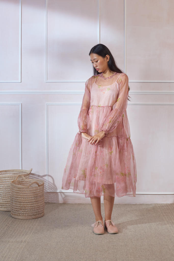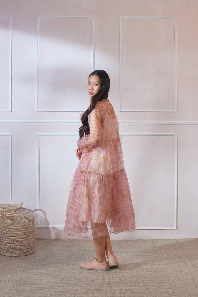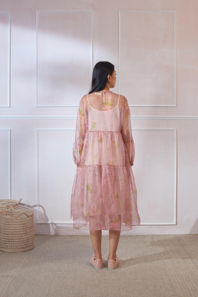 Soft organza dress with silk slip. Relaxed fit and breezy tiers. Ruffled neck. Opening at the back secured with button. Length of the dress is 42"