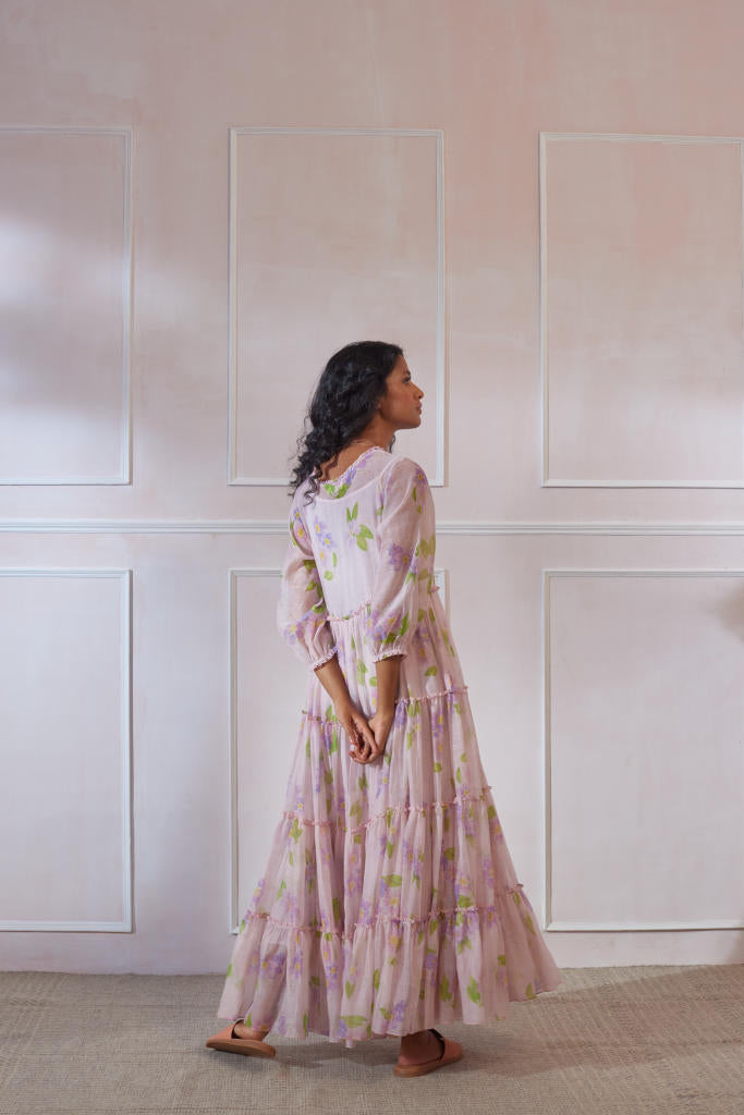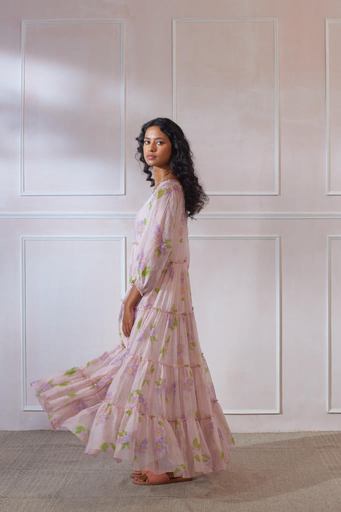 Over lap V neck maxi with 3/4th sleeve in silk cotton with cotton inner. Bead work on neck. Elasticated sleeve hem. Jarul Flower Print. Dress Length 50 inch.
