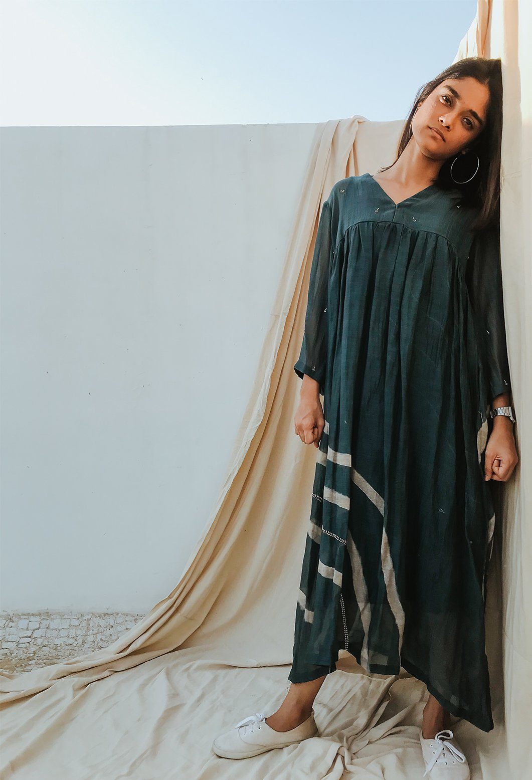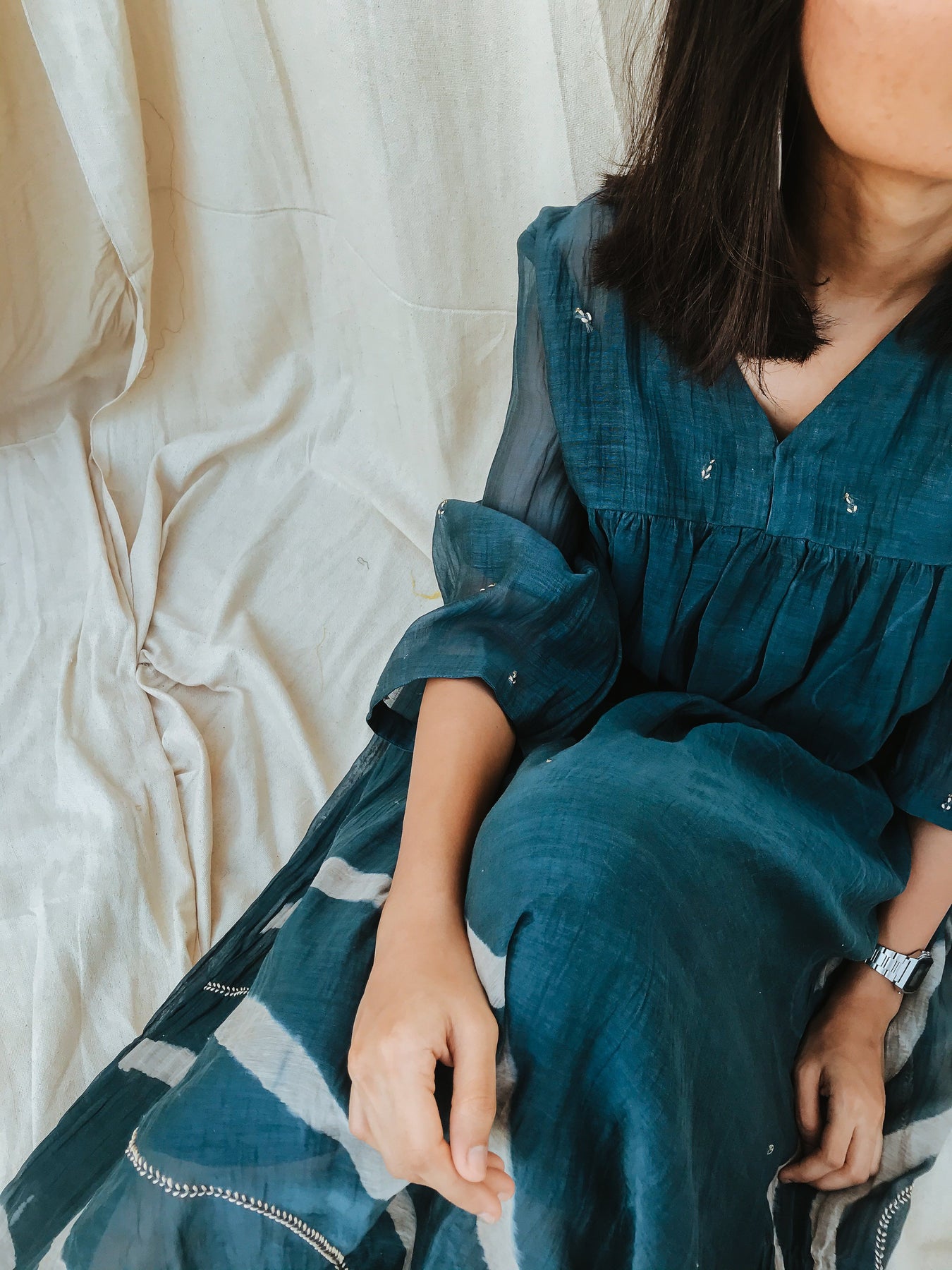 Gathers at upper bust with an ease of flow bringing freshness in silhouette and complimentiong the discharge contour lines providing absolute comfort.