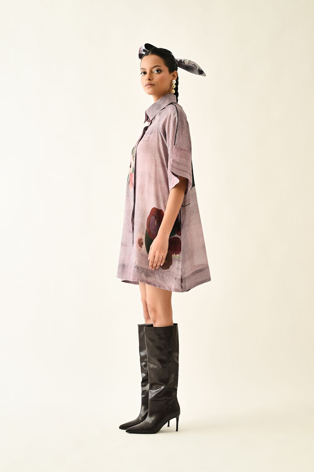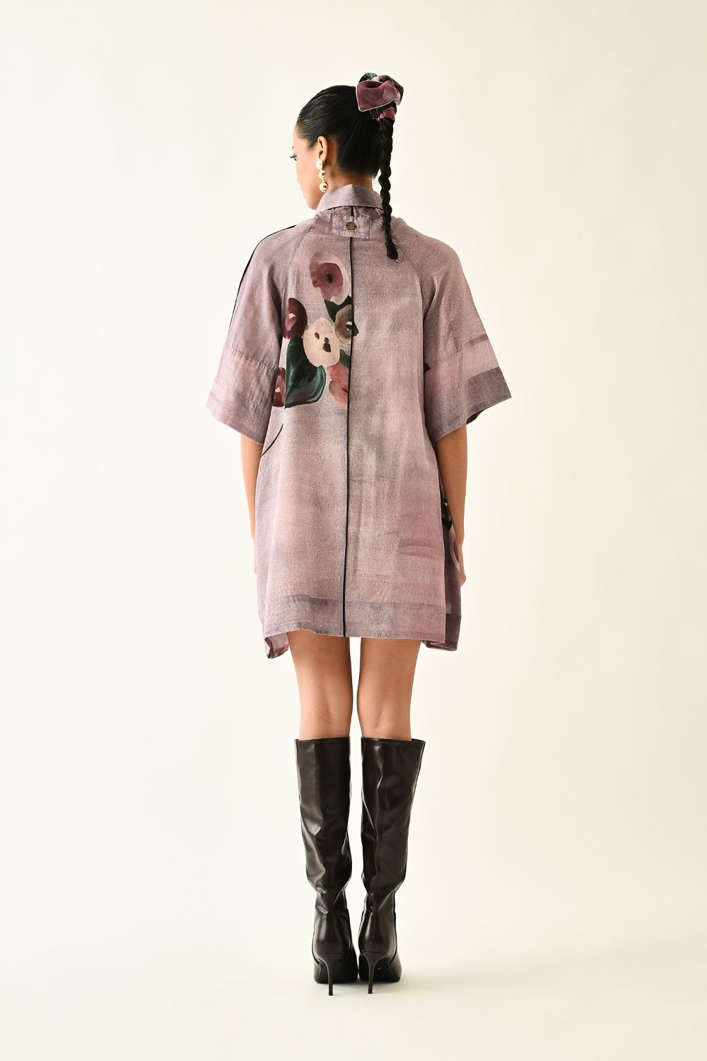 Dress: Anti-Fit short dress, Slightly see-through, Hand-painted abstract expressionist digitally transferred print, Shirt collar, concealed placket, side seam pockets, raglan sleeves. Print placement will vary - single piece. Model is wearing - XS/S