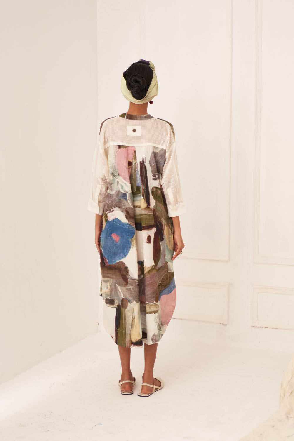 Hand-painted abstract expressionist print, digitally transferred. Designed with a half mandarin collar , half V-neck, and half front placket. Sushi checks on sleeves, cuffs and back yoke. Finished with a round high-low hem, center back box pleat, and vintage coin detailing. Print placements will vary—single piece. Model is wearing - M.