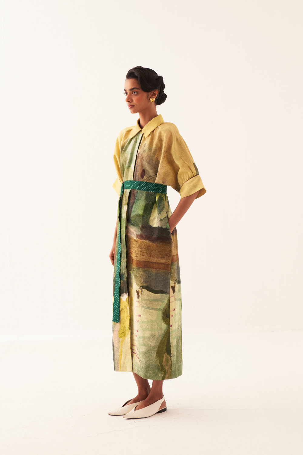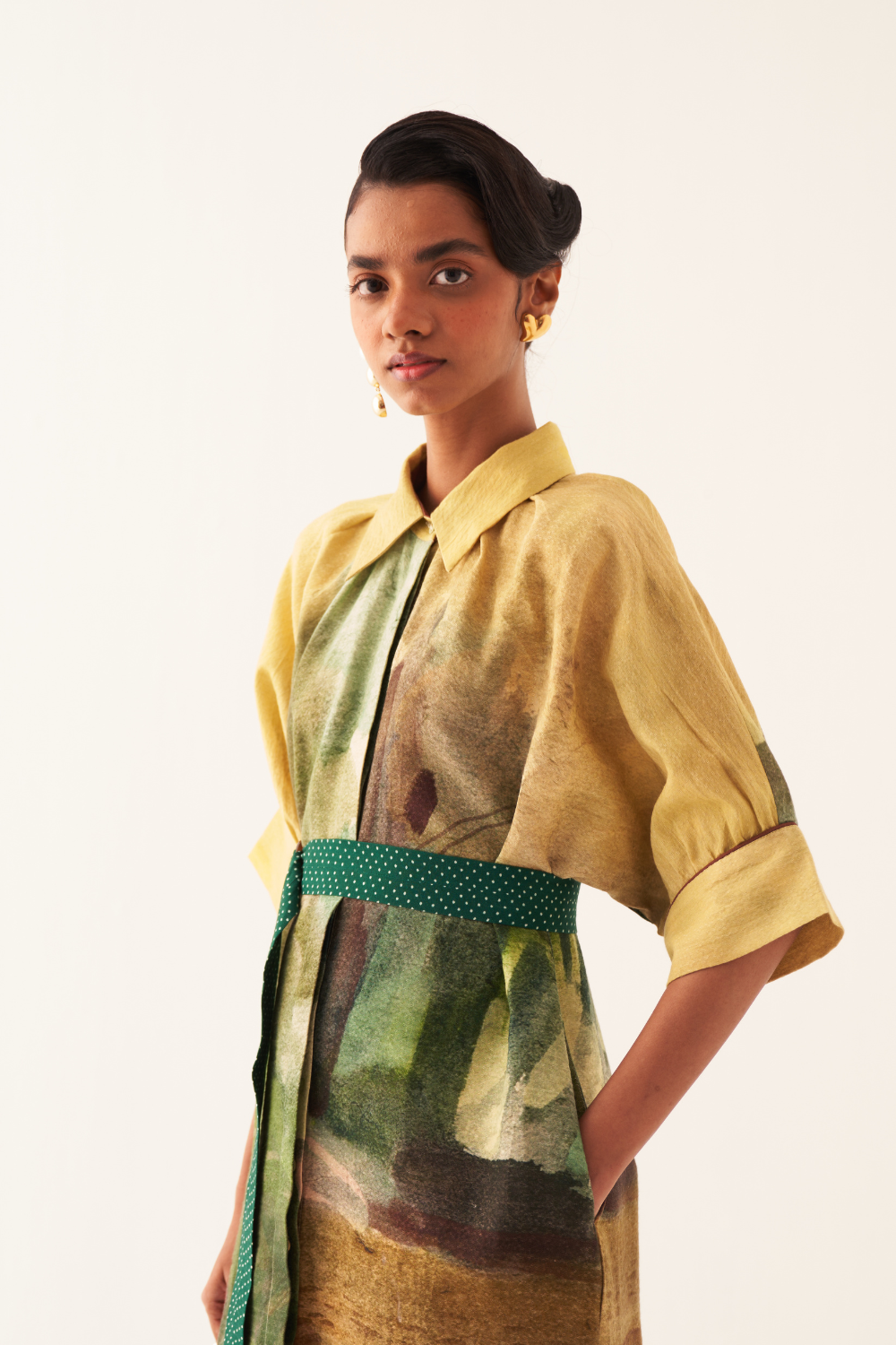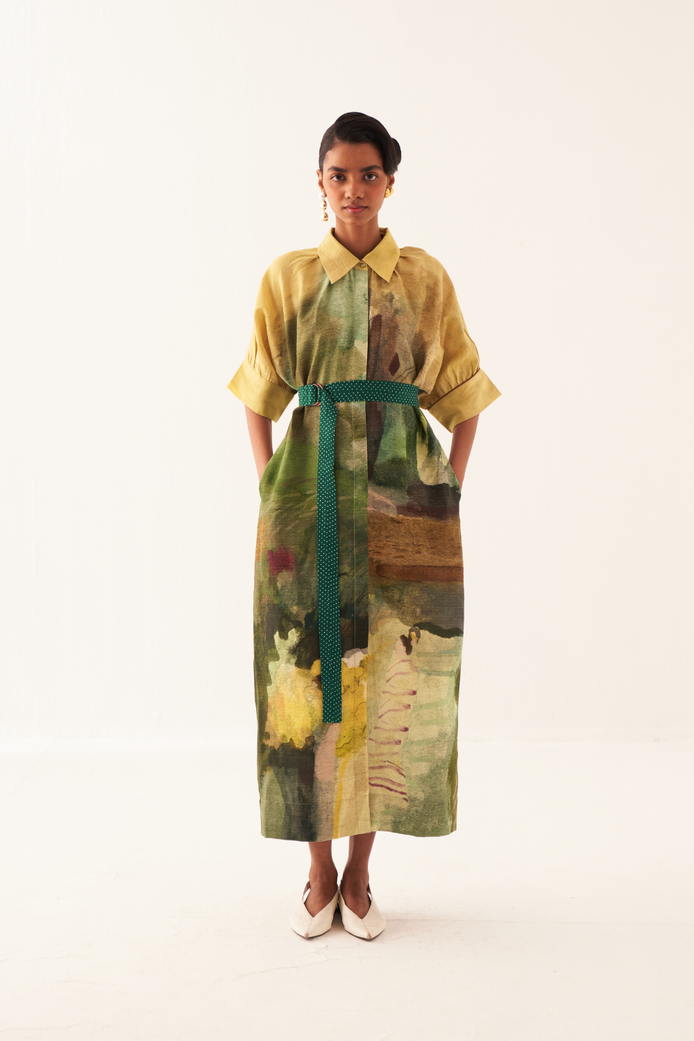 Anti-Fit brunch dress, Hand-painted abstract expressionist digitally transferred print, with shirt collar, full front placket, Back box pleat with insert, and hand-embossed signature OFR lune embroidery detail. Print placement will vary - single piece. Model is wearing - XS/S.