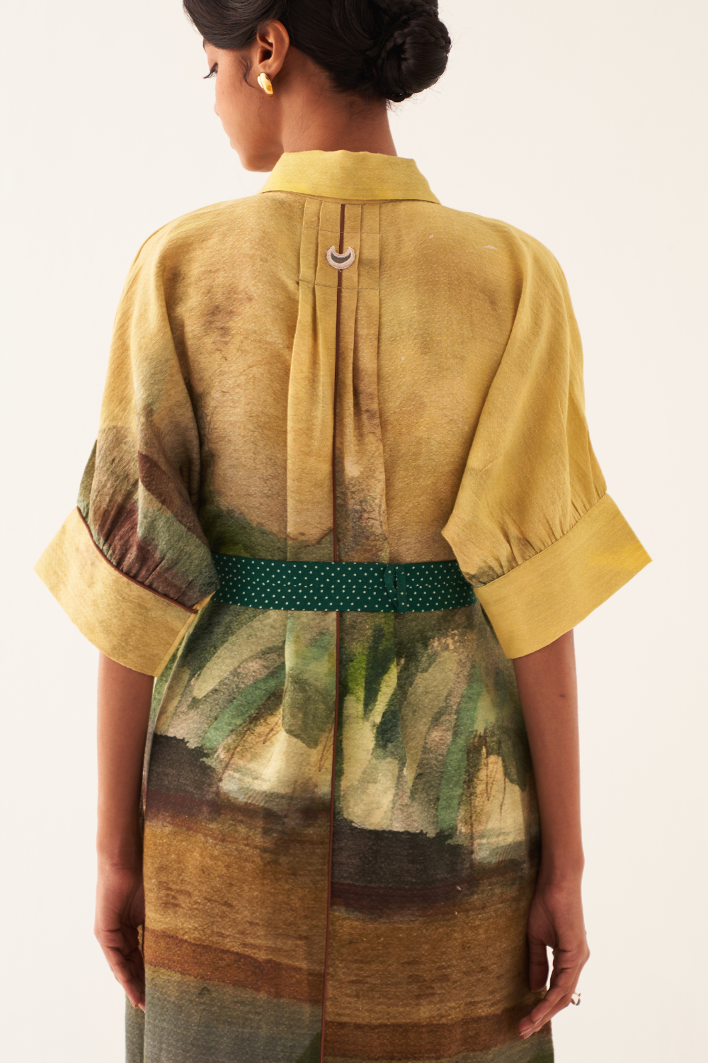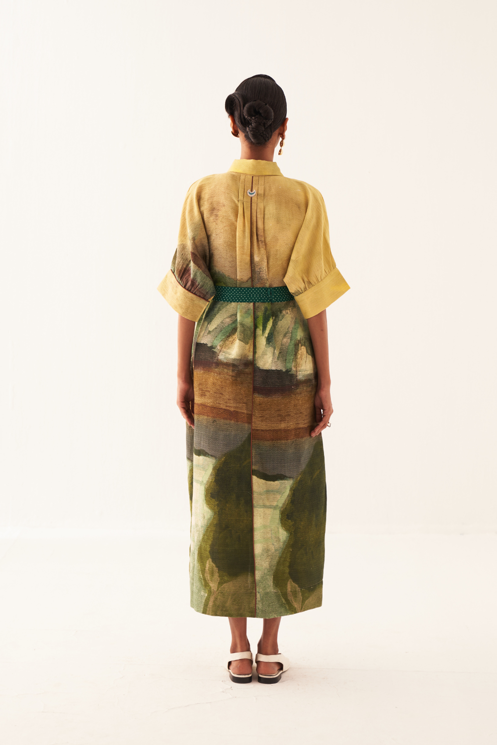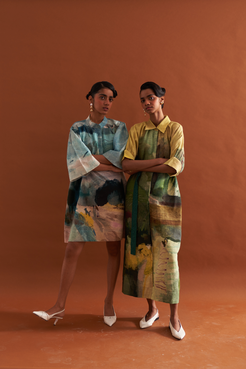 Anti-Fit brunch dress, Hand-painted abstract expressionist digitally transferred print, with shirt collar, full front placket, Back box pleat with insert, and hand-embossed signature OFR lune embroidery detail. Print placement will vary - single piece. Model is wearing - XS/S.