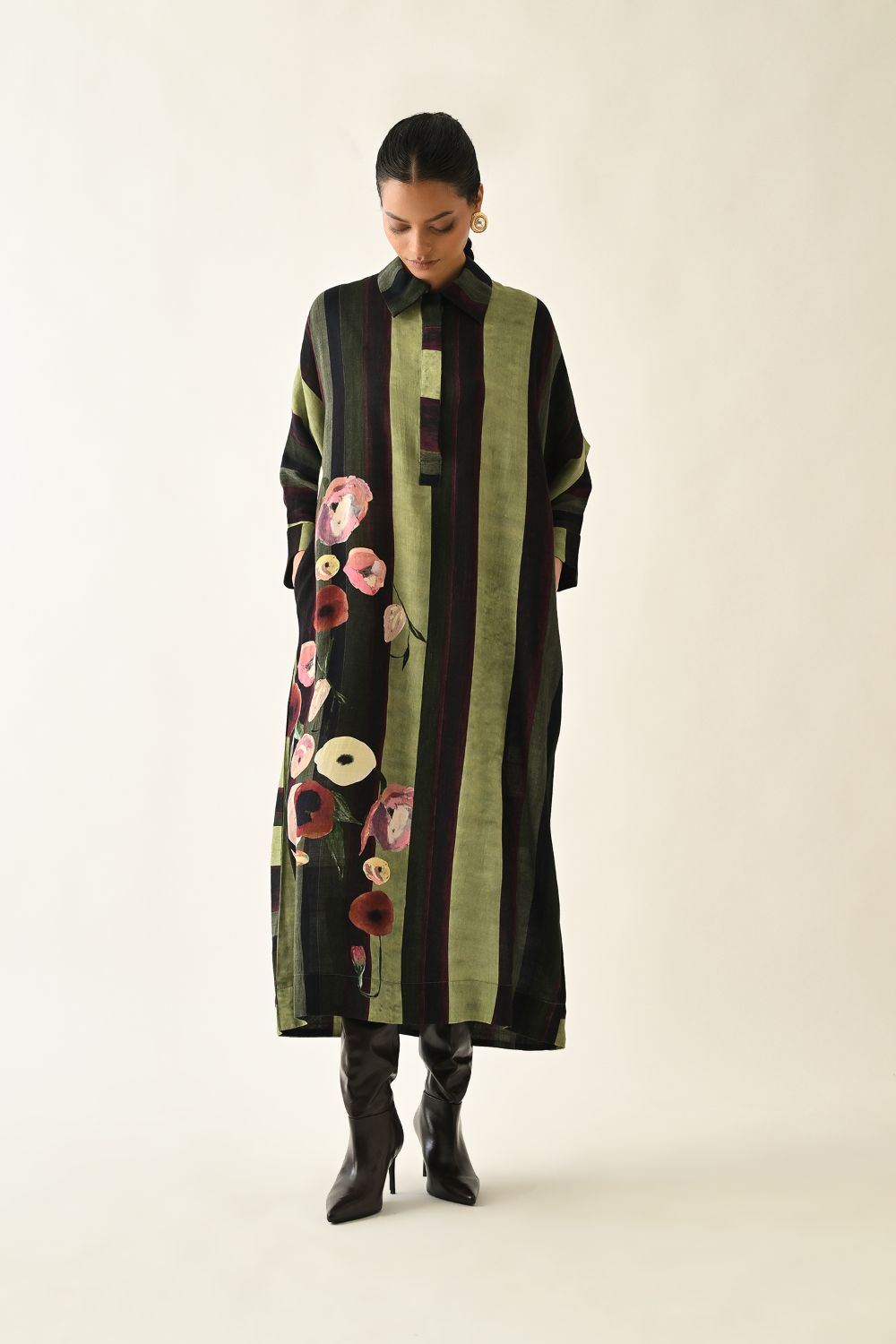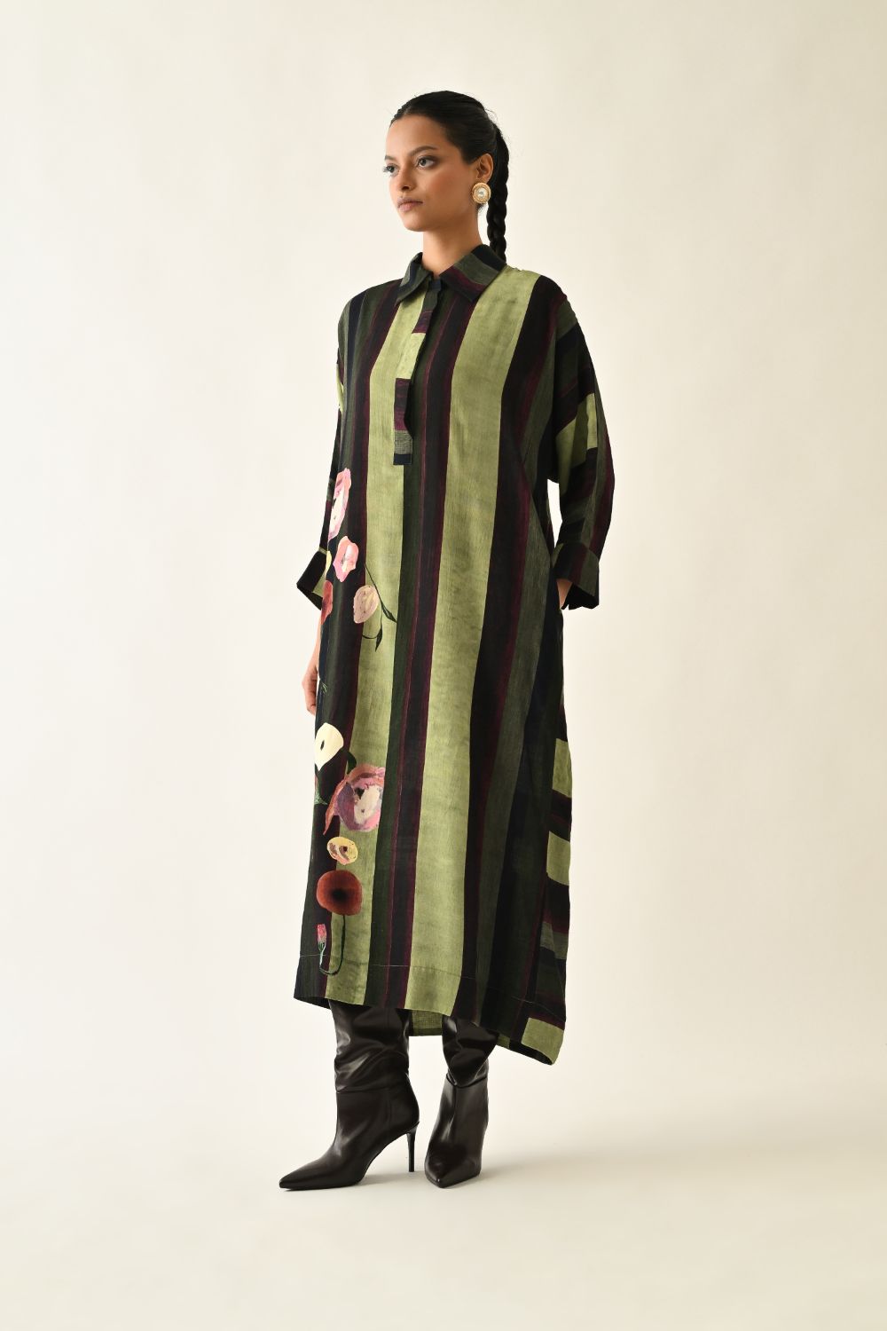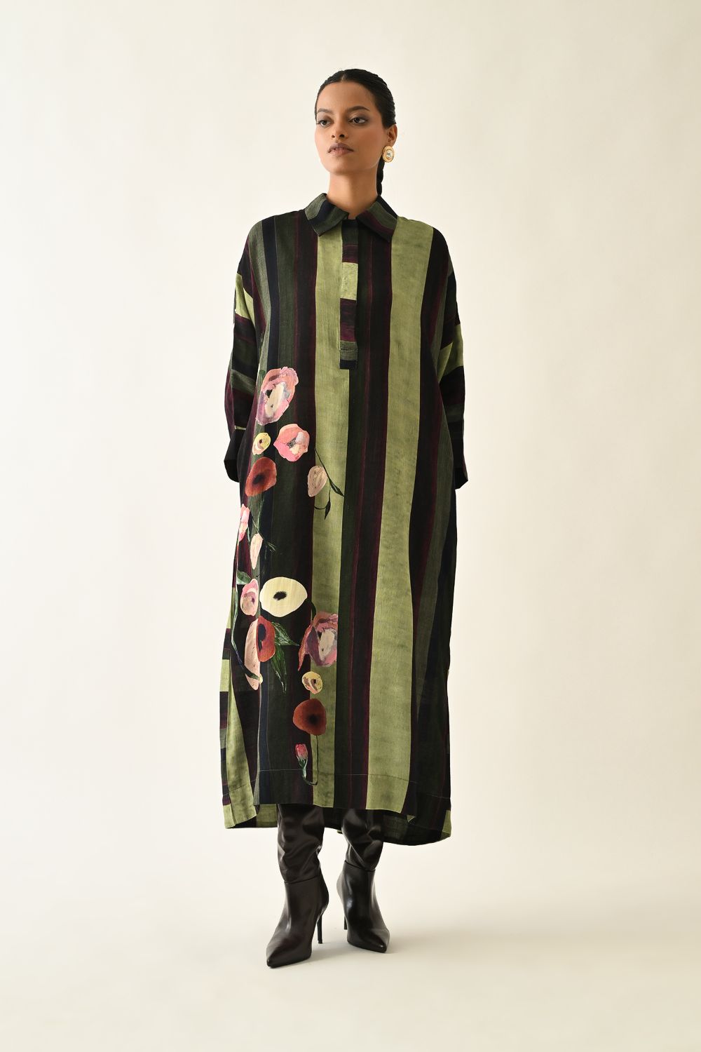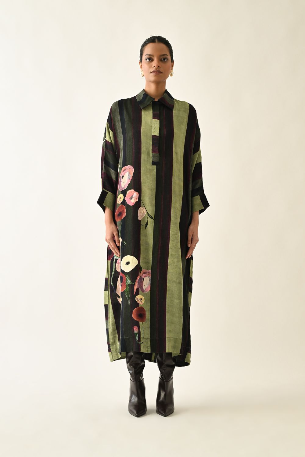 Dress: Anti-fit, Half Placket, Inseam Pockets, Print placement design. We recommend going one size smaller for a snug fit. Variations in color, texture, and weave are inherent due to the hand made nature of the garment.| Model is wearing XS-S