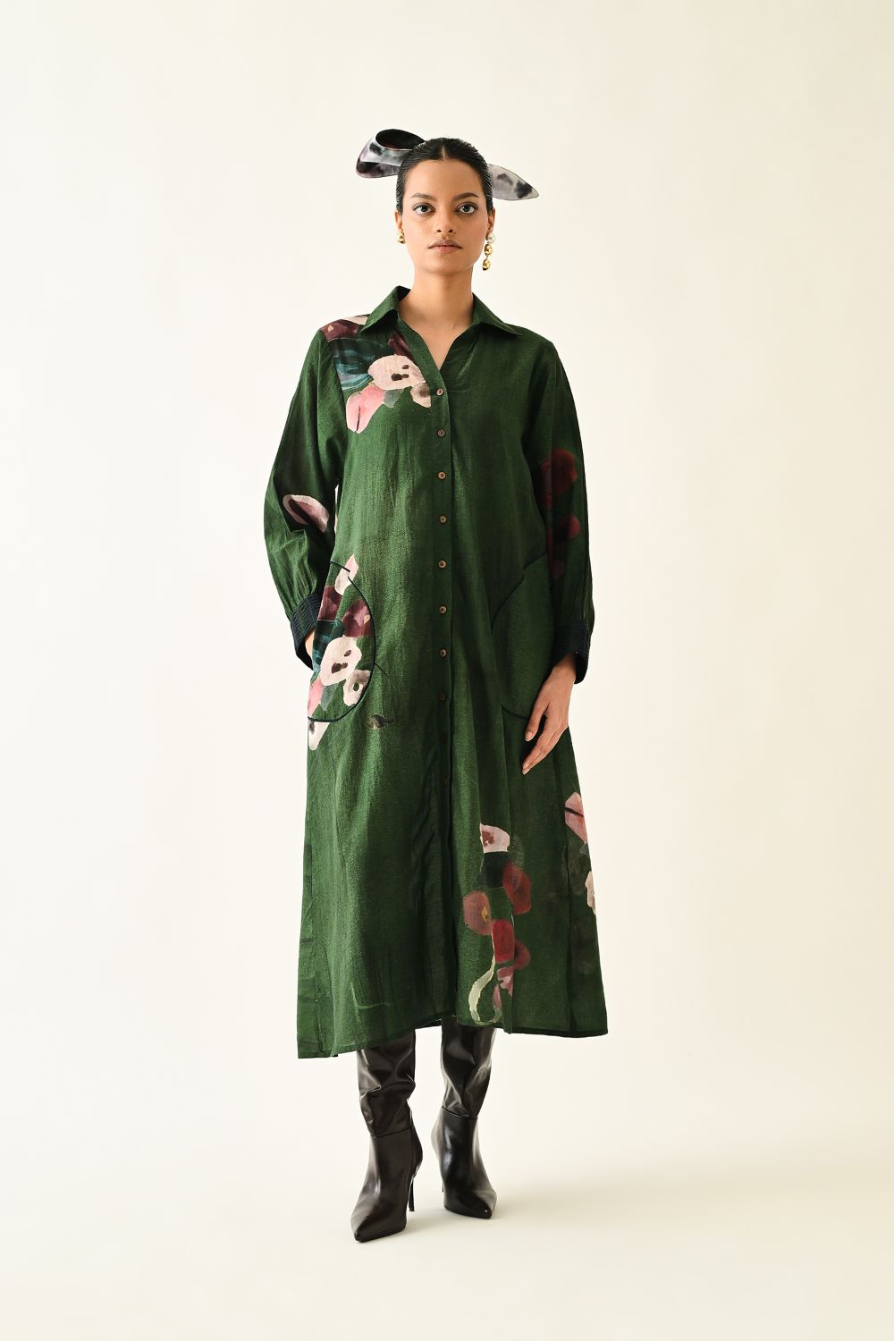 Dress: Anti fit dress slightly see-through, shirt collar, full concealed placket, long sleeves, wave tucks on cuff, hand-painted abstract expressionist digitally transferred print, Print placement may vary- single piece. Model is wearing XS/S
