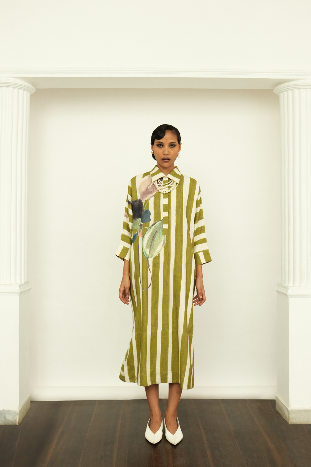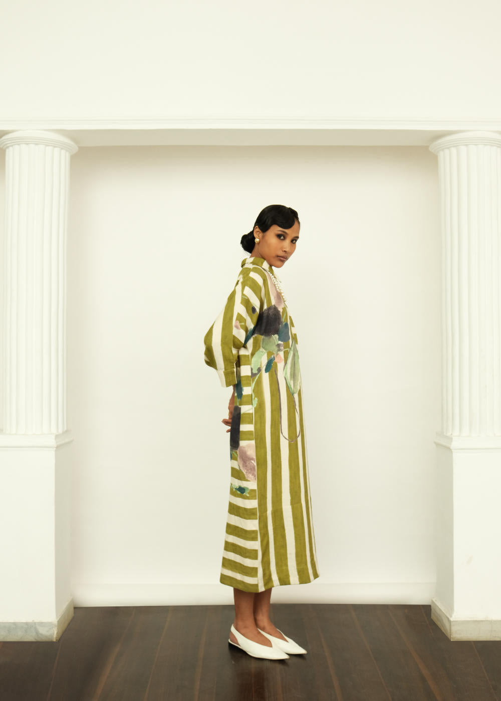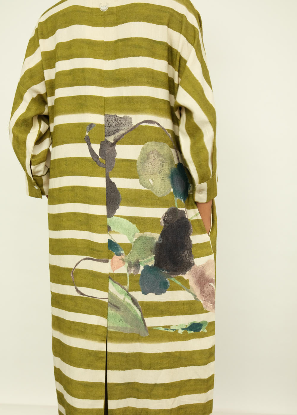 Anti-Fit, Handpainted Signature Ofrida Stripes. Hand-painted abstract expressionist digitally transferred print, Hidden placket, and Side pockets. Pair it with our olive tapered fit lowers or can wear it as a dress to complete the look. Hand-embroidered signature OFR Lune. Placements will vary—single Piece.