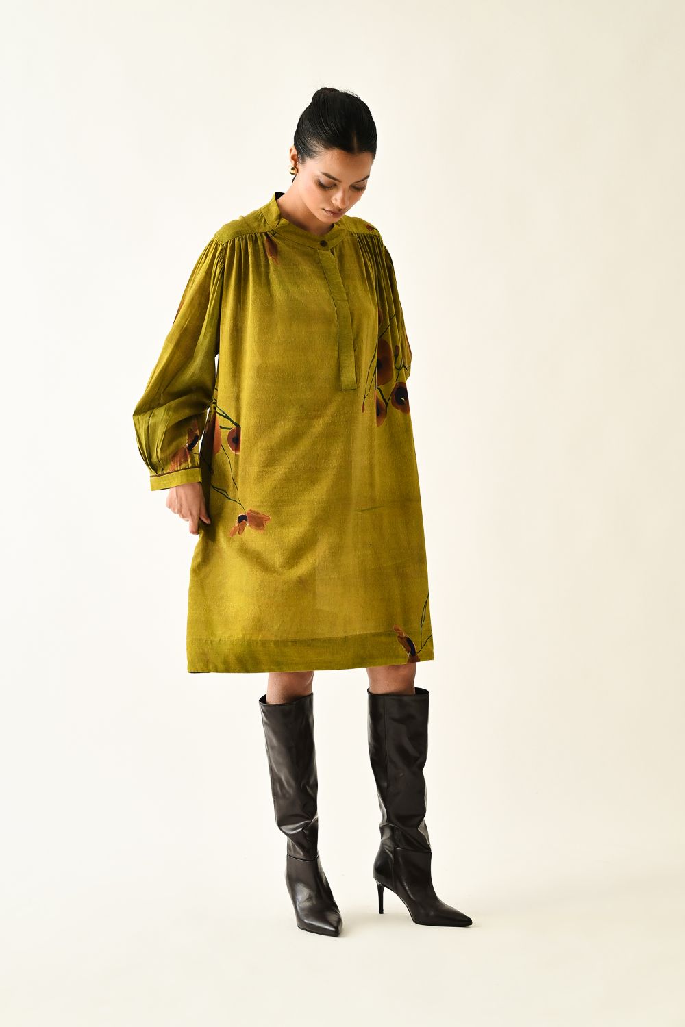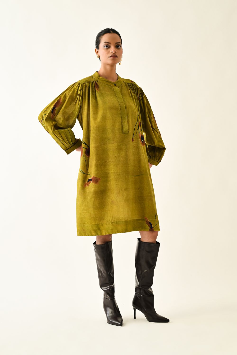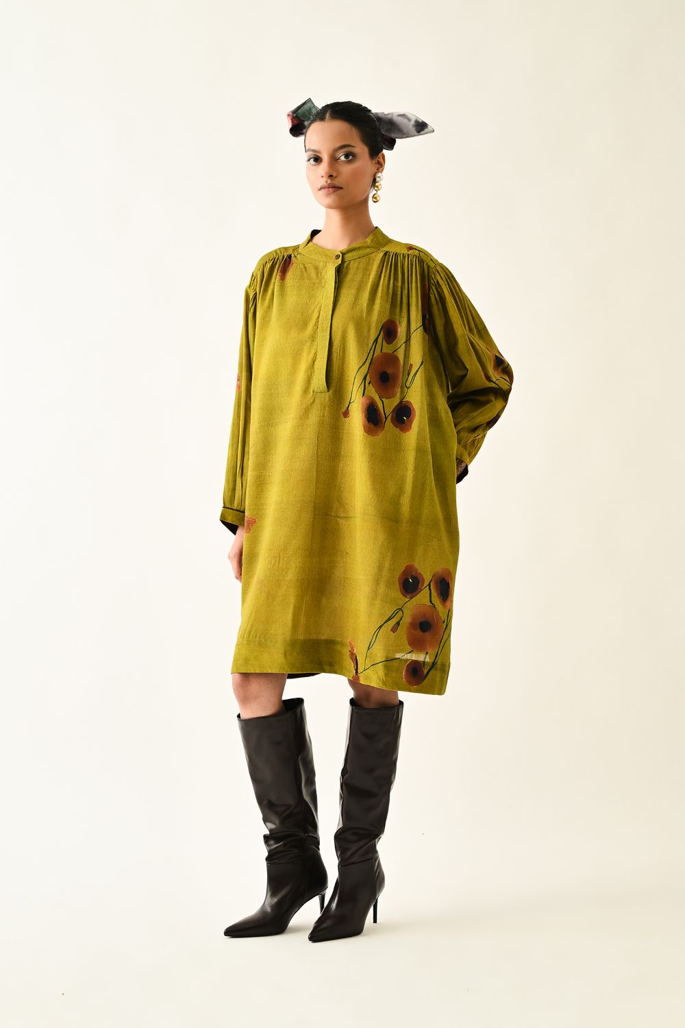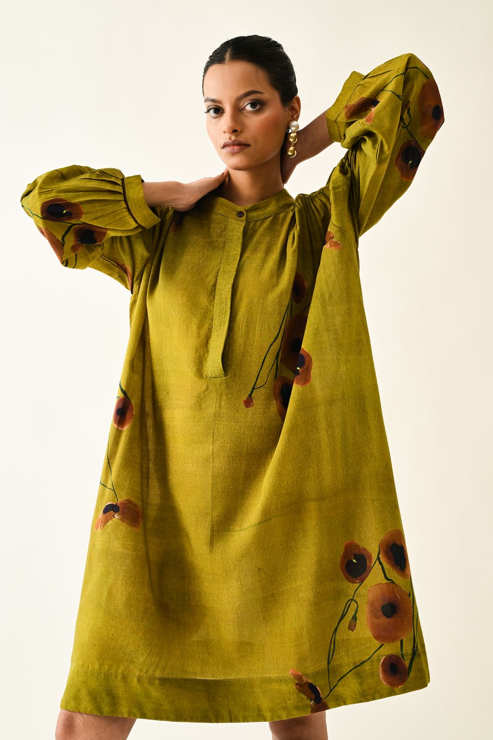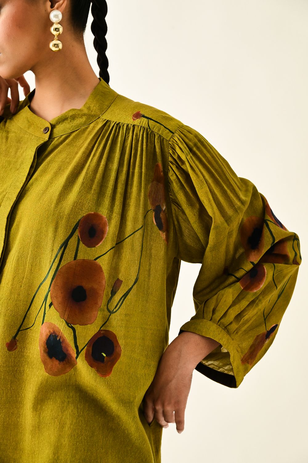 Dress: Anti fit tunic featuring a round neckline with the half front placket, voluminous three quater sleeve gathered at the armhole. The front is adorned with a digitally transfered floral motif, originally hand-painted for an artisanal touch. Single peice. Model is wearing XS/S