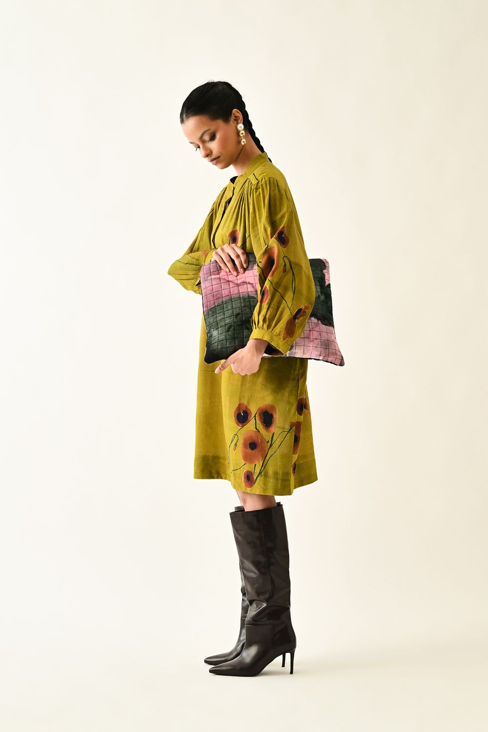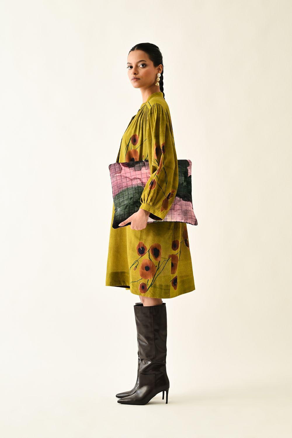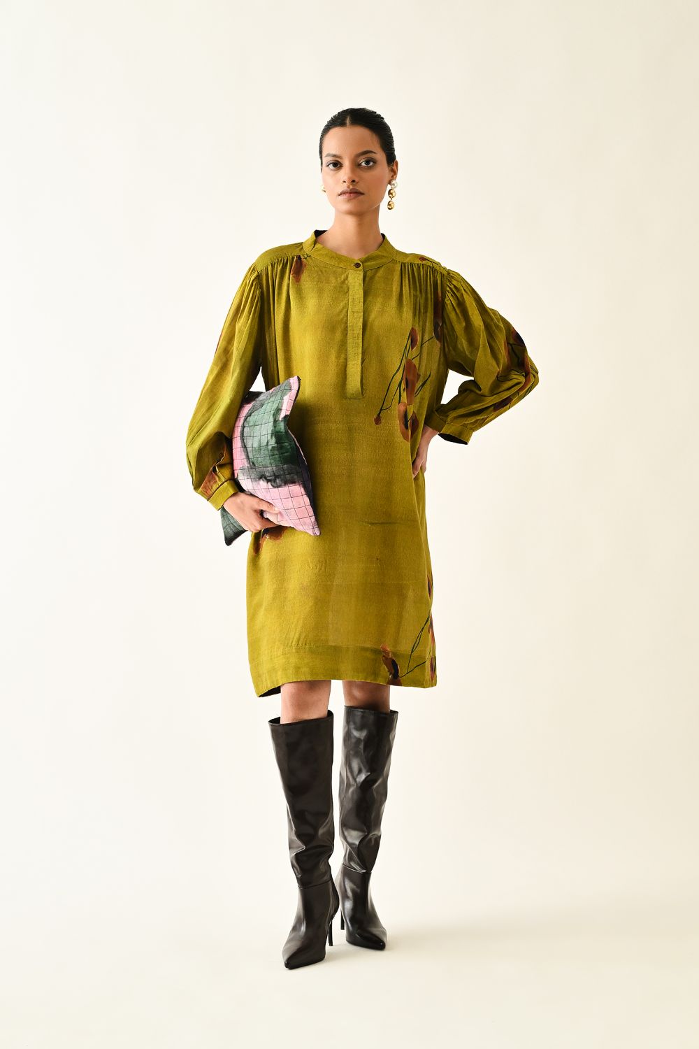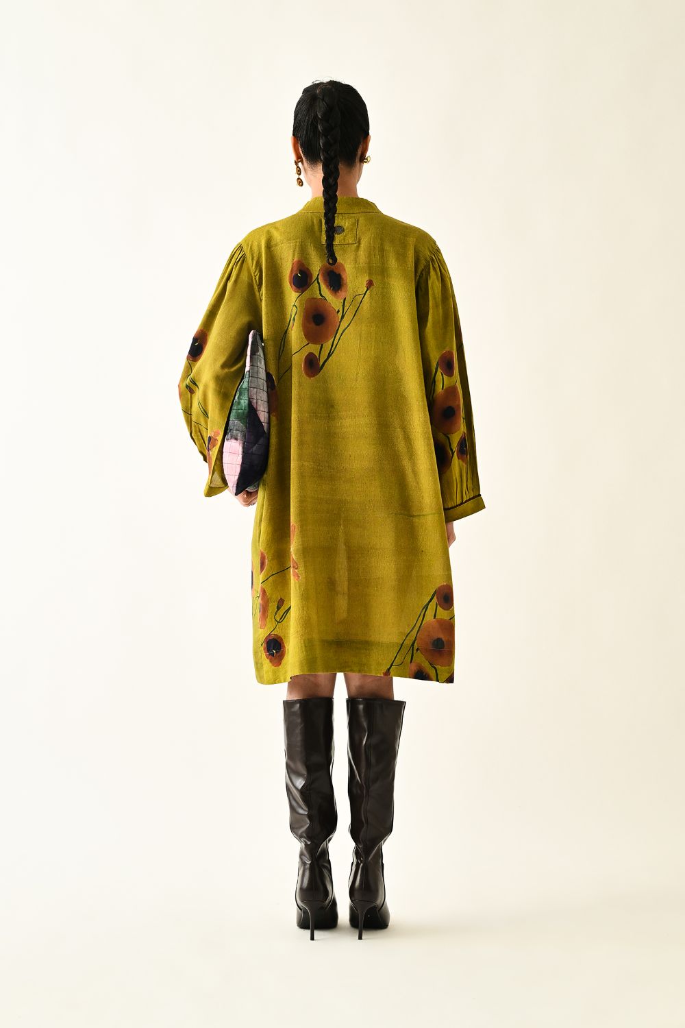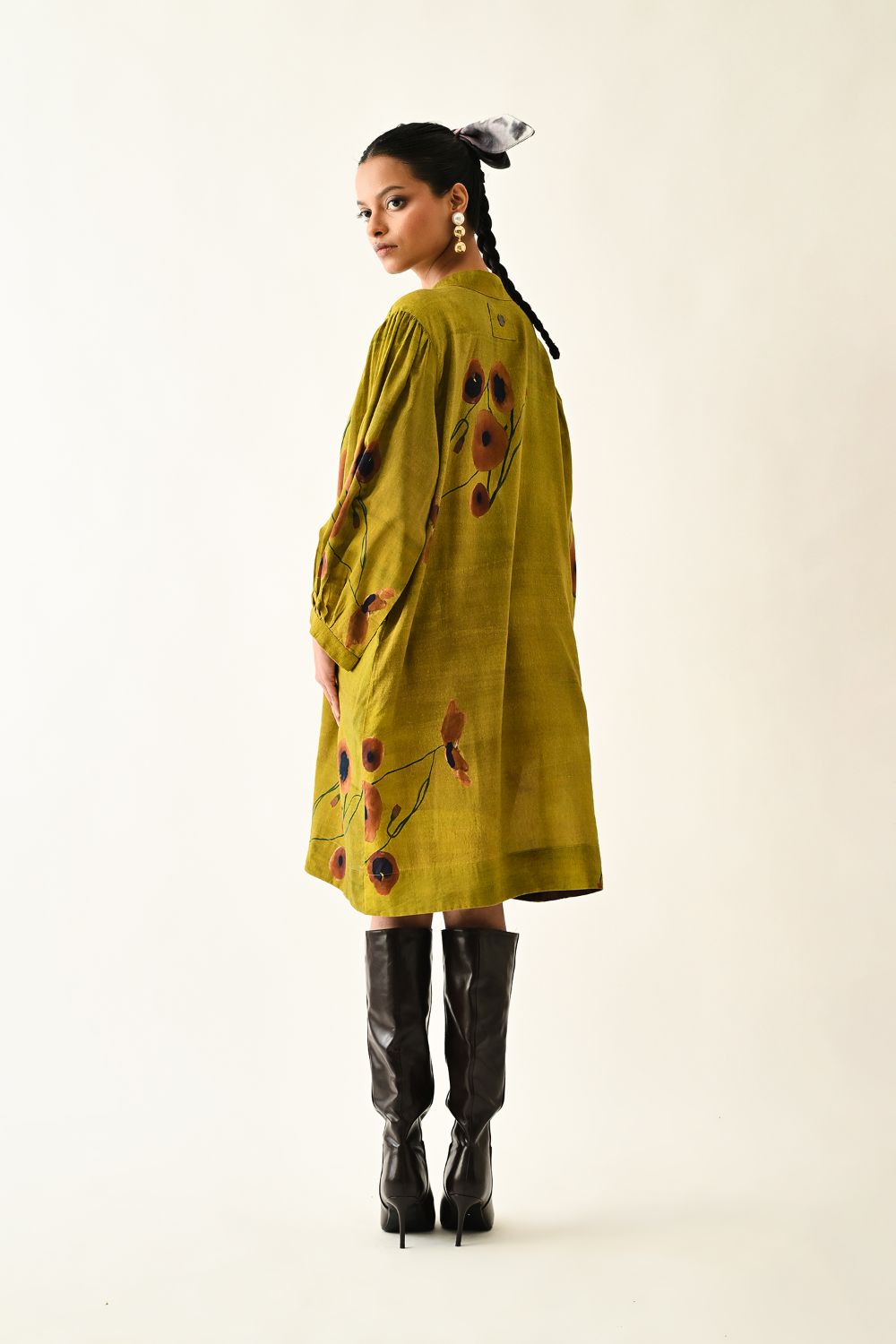 Dress: Anti fit tunic featuring a round neckline with the half front placket, voluminous three quater sleeve gathered at the armhole. The front is adorned with a digitally transfered floral motif, originally hand-painted for an artisanal touch. Single peice. Model is wearing XS/S