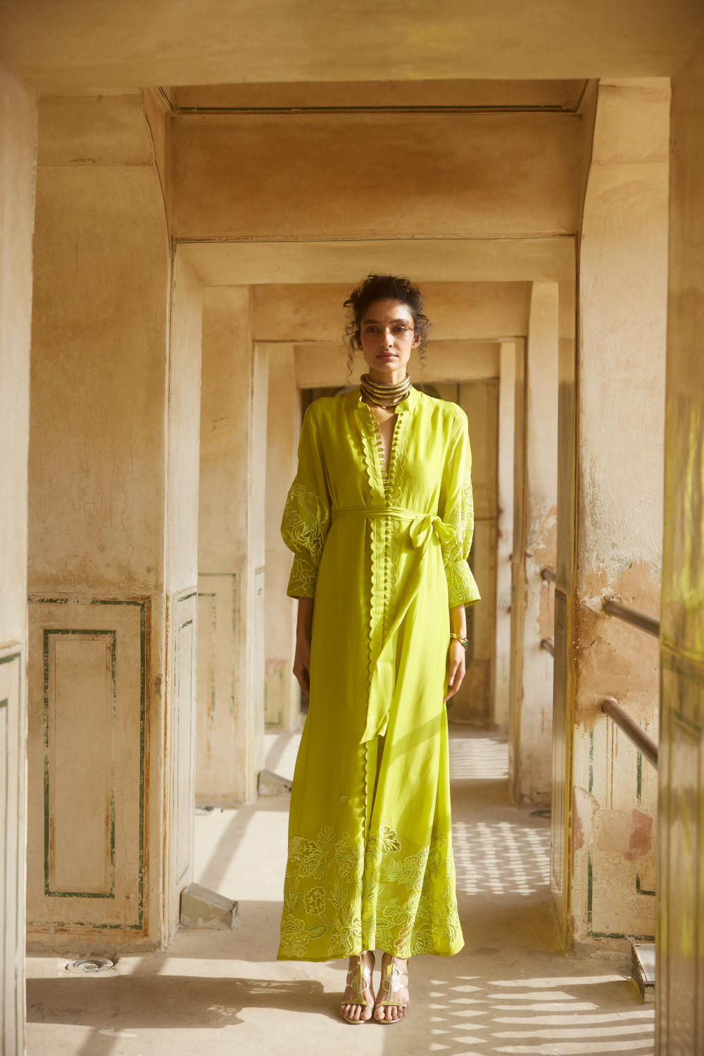 Every collection begins long before the garment is stitched: months of research into India’s rich craft traditions, followed by the painstaking creation of detailed illustrations. These artworks are then scanned, enhanced with jewel-toned palettes and touches of rich gold, and finally translated onto fabric. The result is a visual language so distinct that their name has become synonymous with print, colour, and the kind of glamour that still feels feather-light.