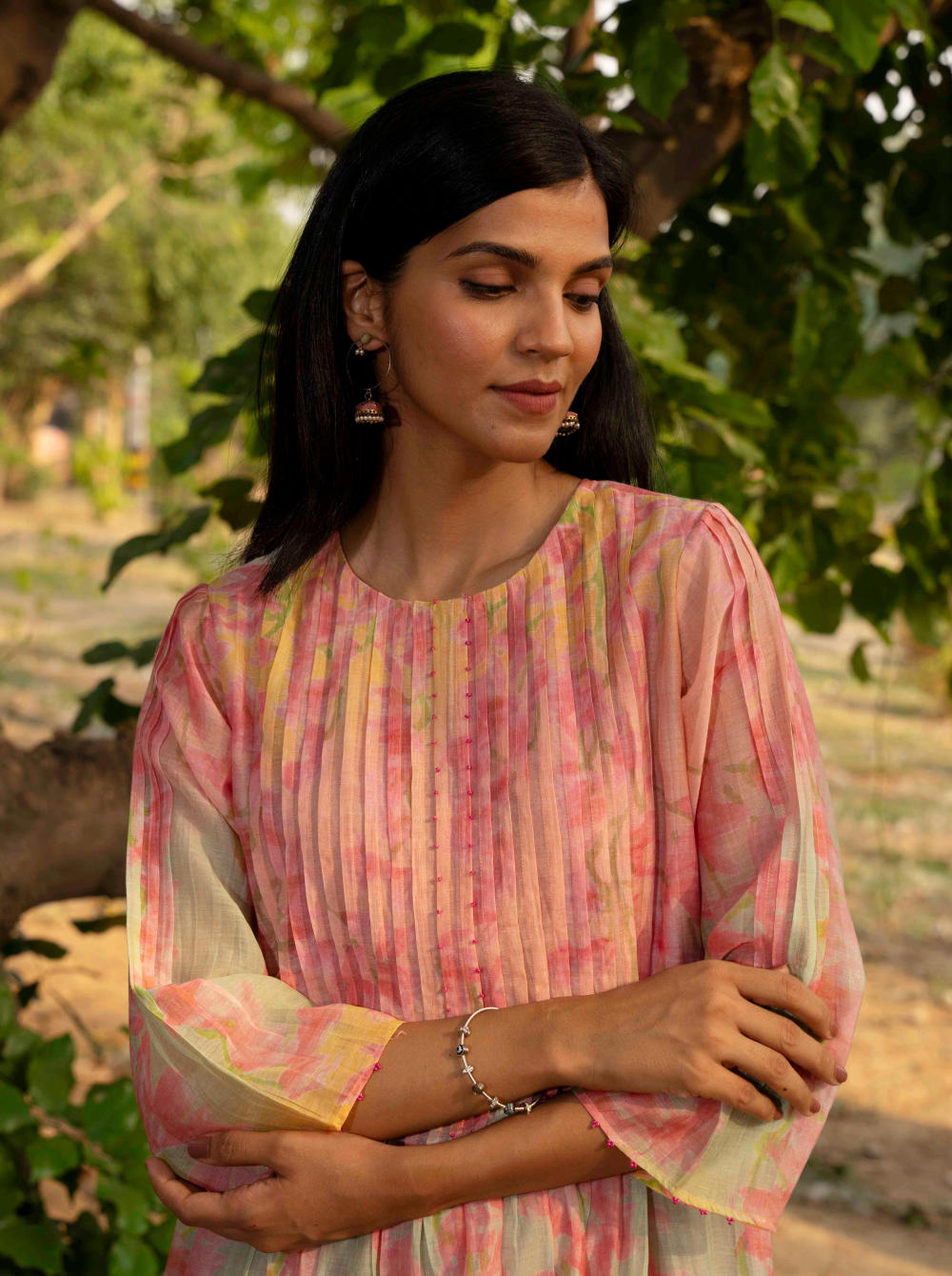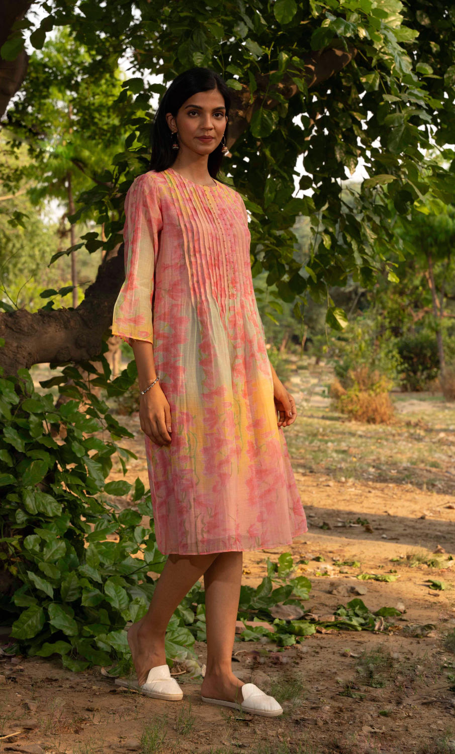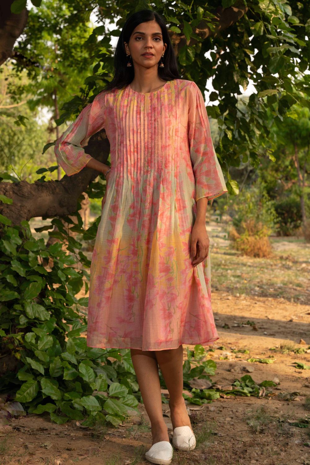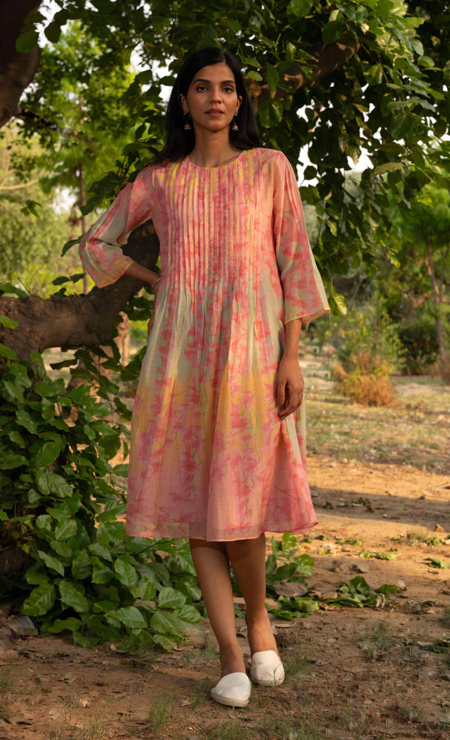 Vibrant orchid floral printed pleated dress with flowy design, relaxed fit.