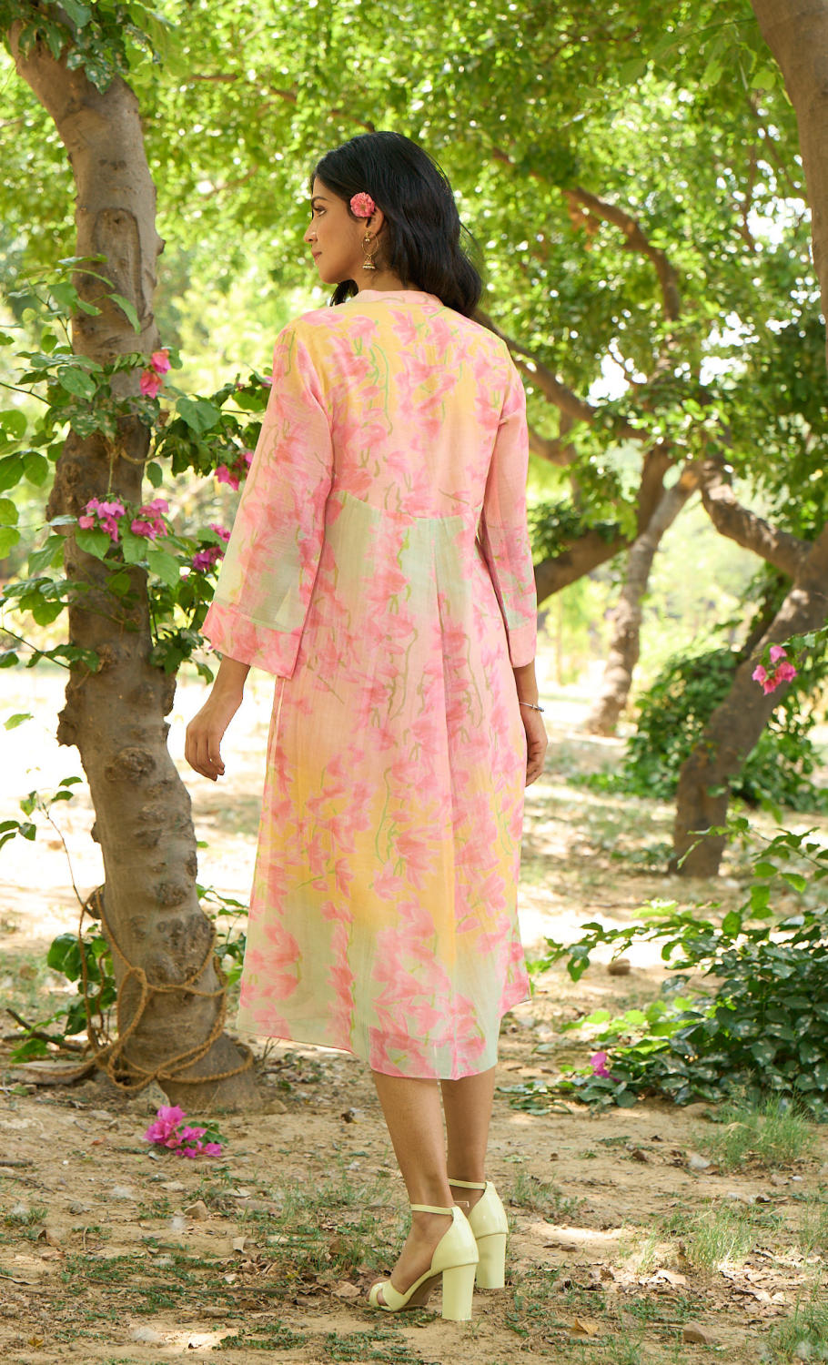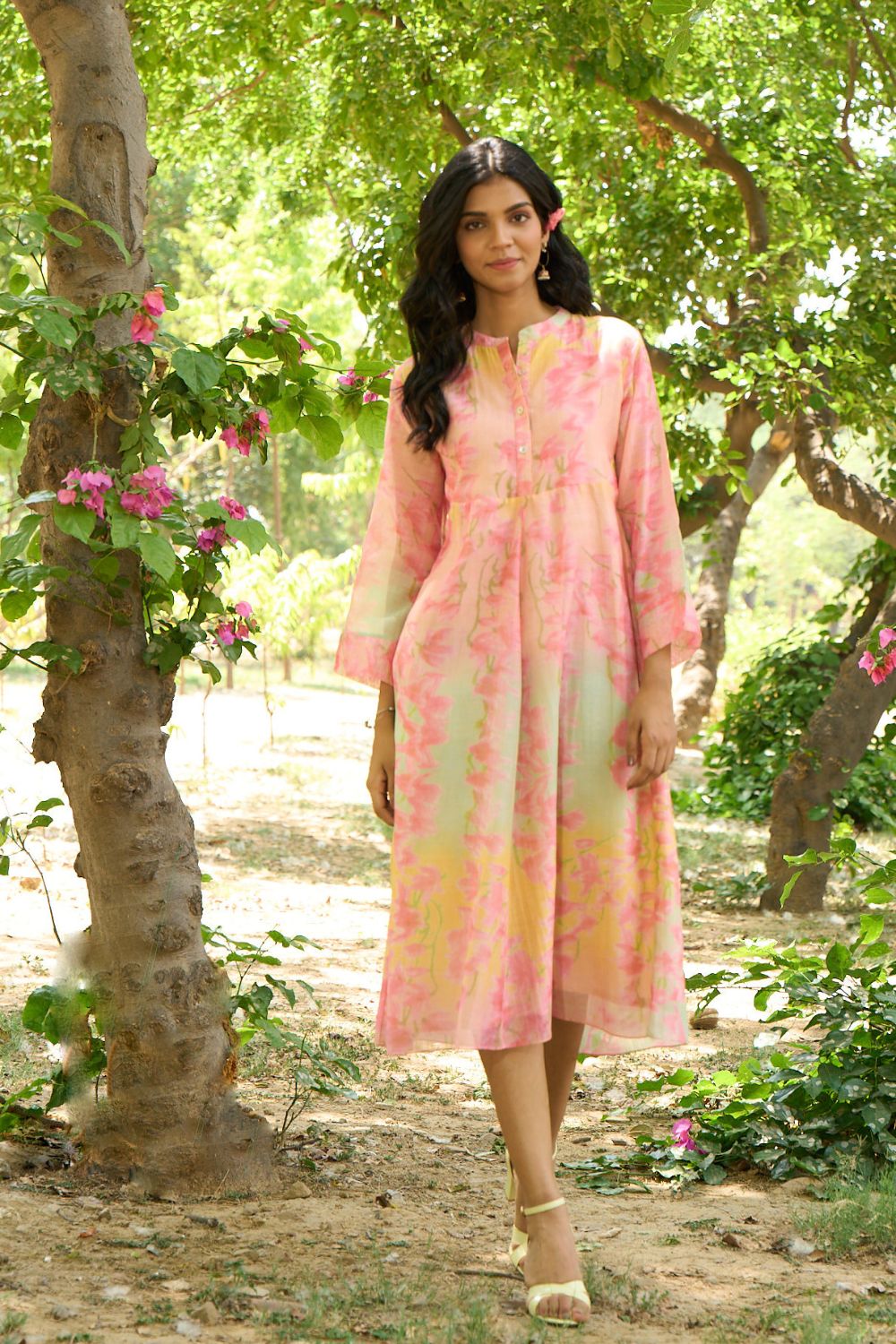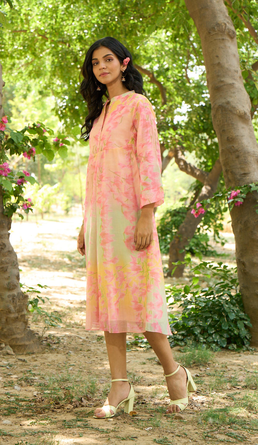 Vibrant floral printed dress with flowy design, relaxed fit.
