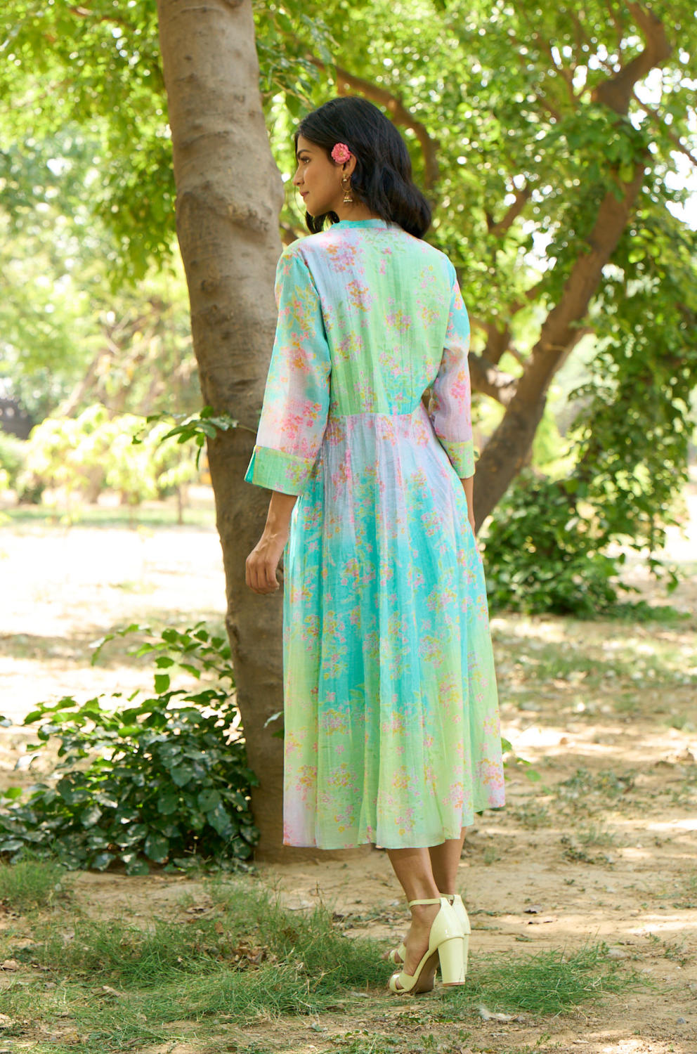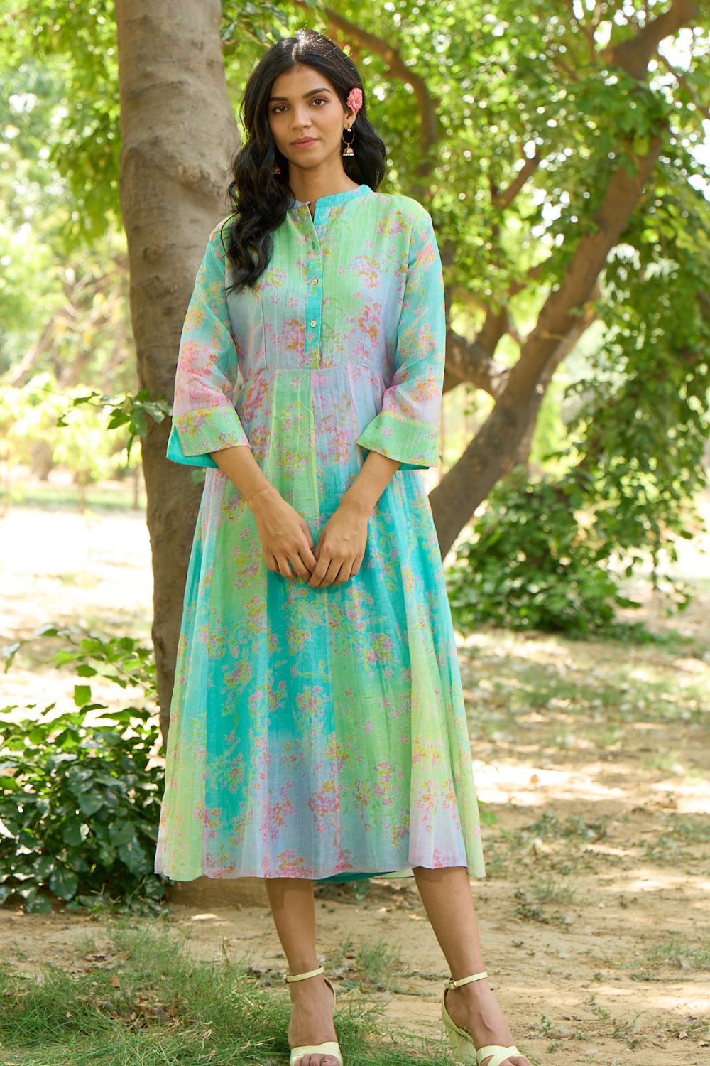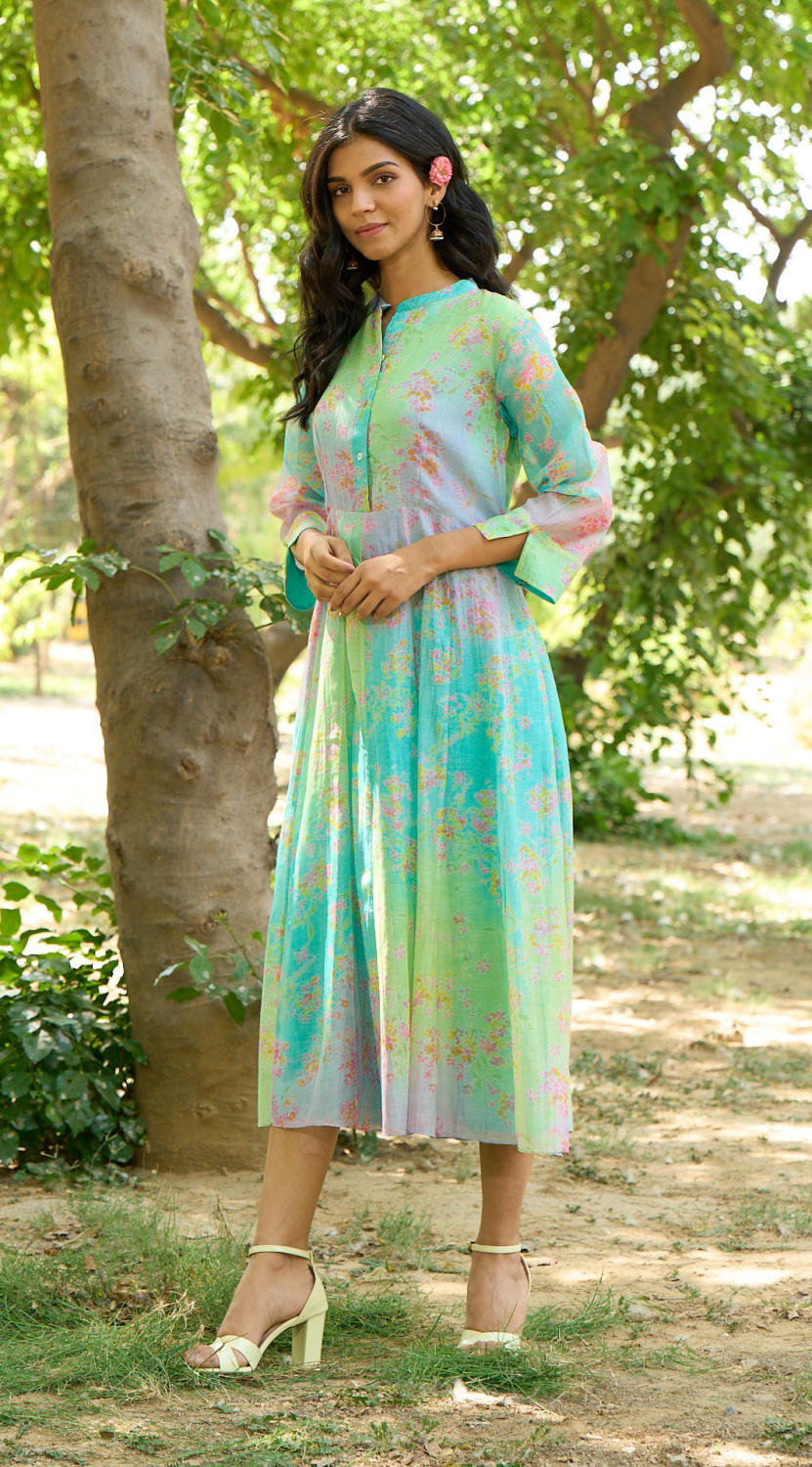 Vibrant floral printed dress with flowy design, relaxed fit.