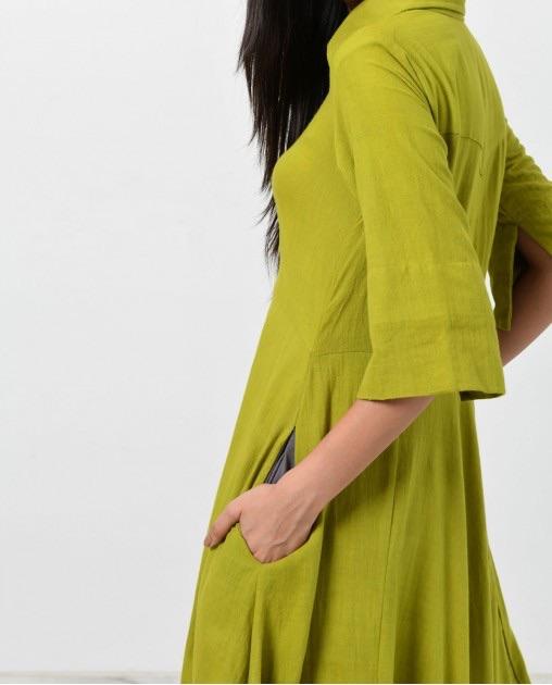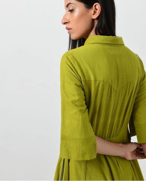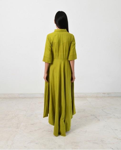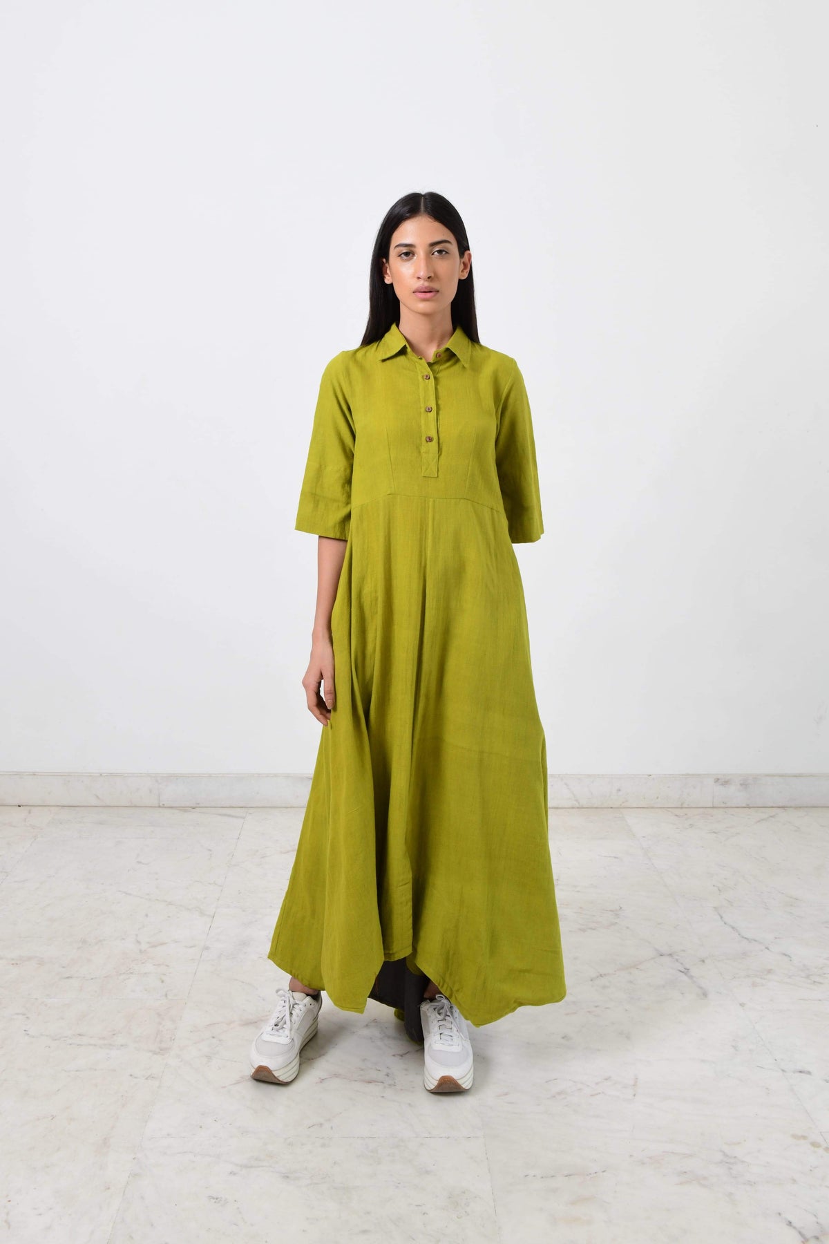 HANDSPUN KHADI khadi asymmetric dress made with roll up sleeves, collared neck and front cut. This dress has a beautifull side and back drape.