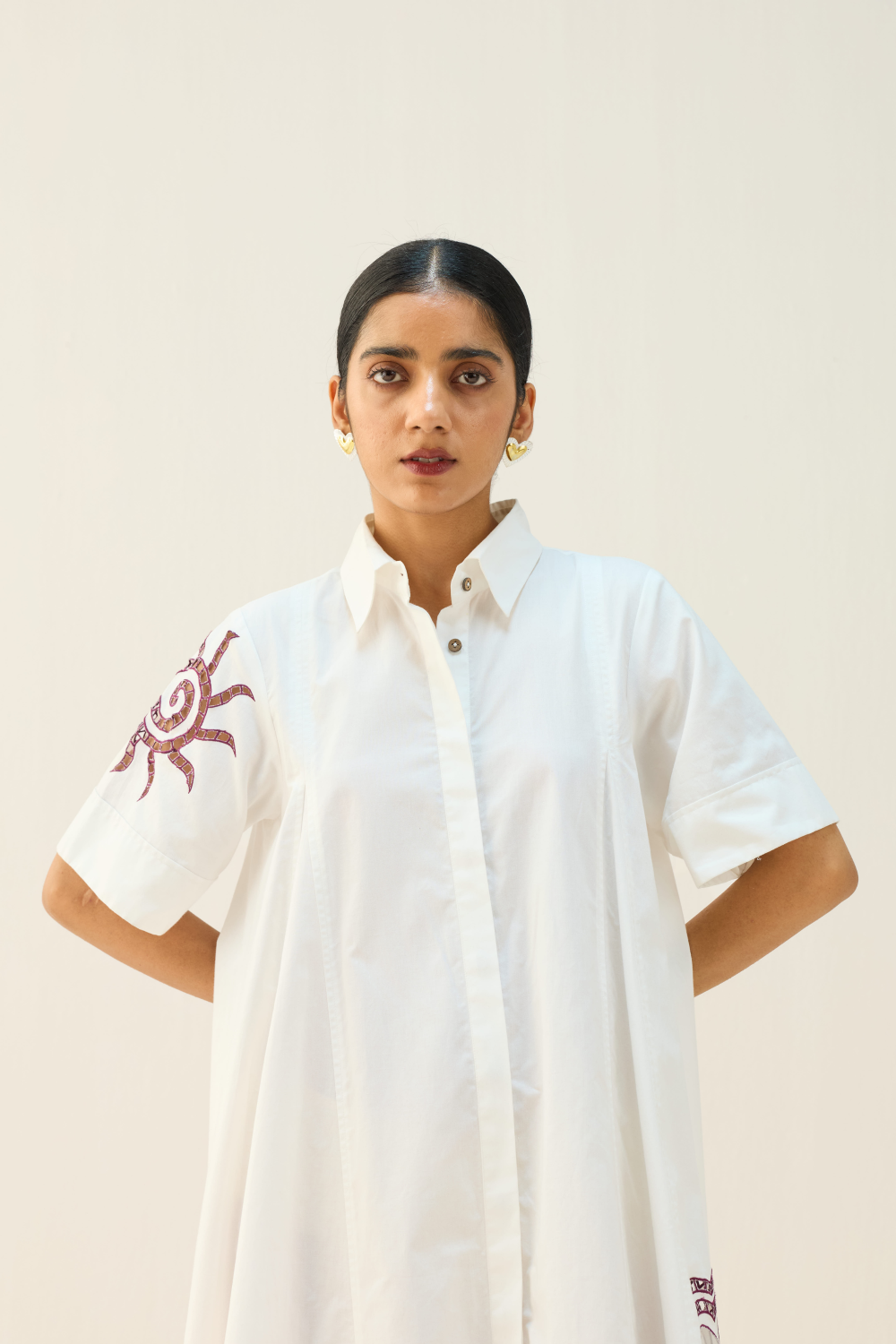 Relaxed fit, half sleeve, collared, a-line, midi shirt dress that buttons in the front, crafted in organic cotton poplin fabric, machine embroidered with sun cut-work motifs.
