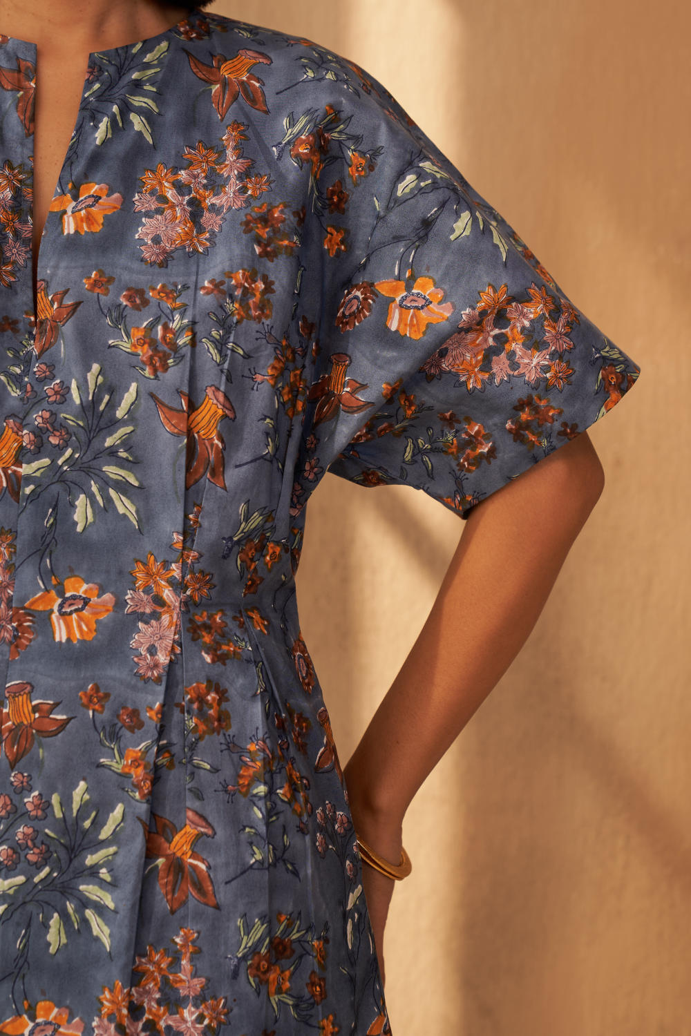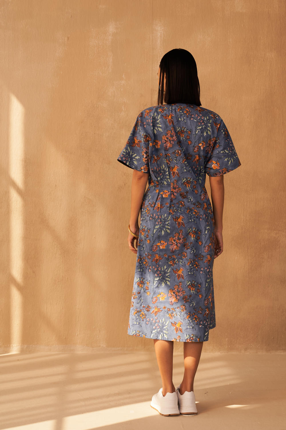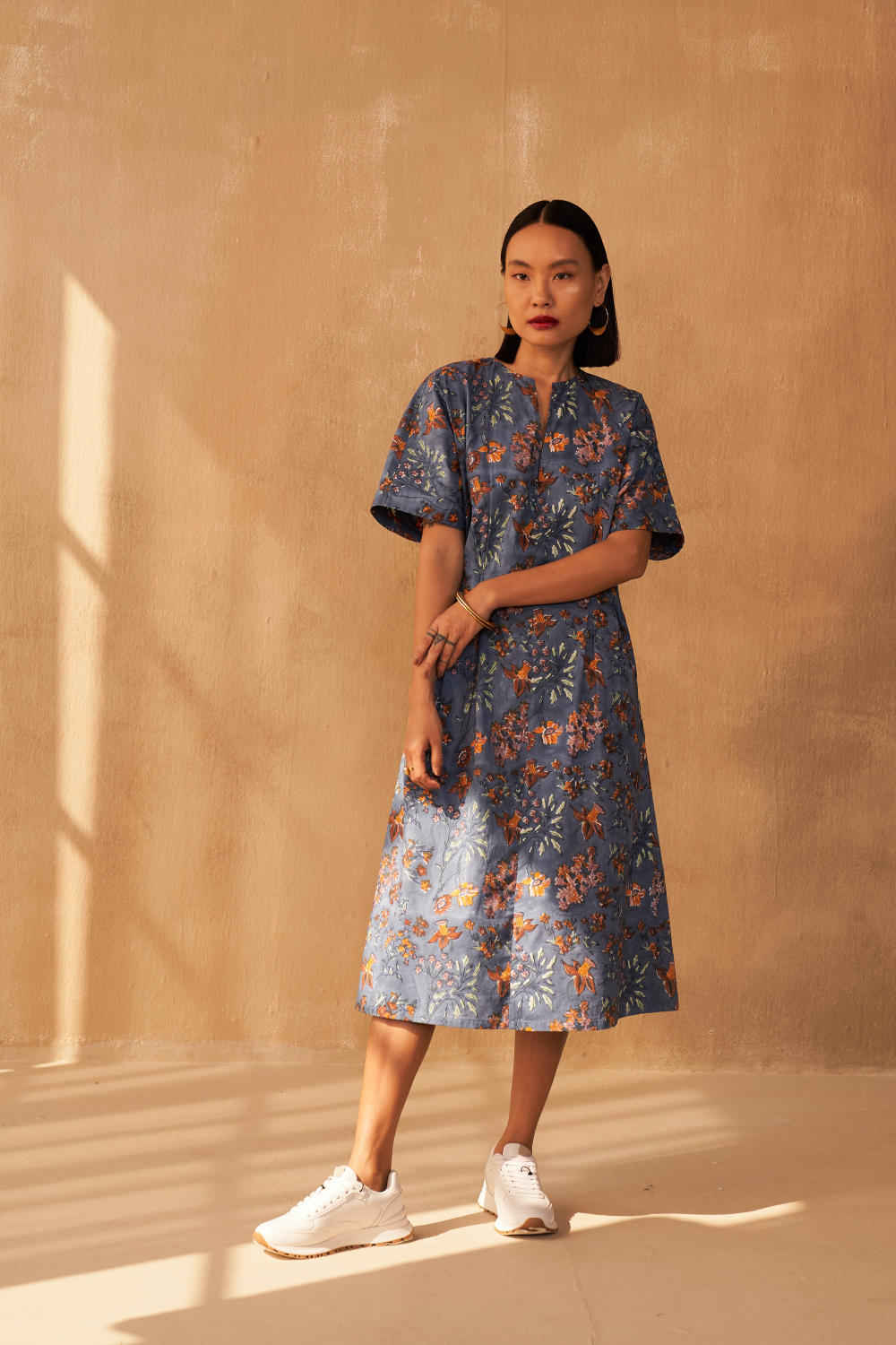 Regular fit, split crew neck, short-sleeve, a-line midi dress crafted in azo-free dyed, organic cotton poplin fabric, hand block printed with our signature Field of Flowers motif using azo-free dyes. This dress is perfect to dress up or dress down. Elegant, vibrant and slow crafted, wear this piece with a green heart wherever you go.