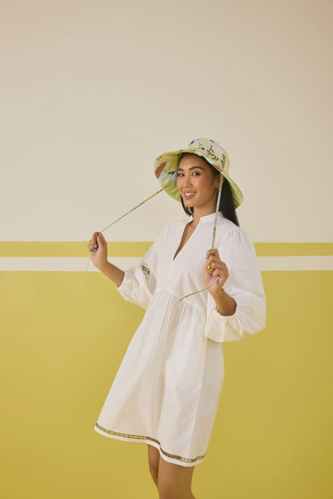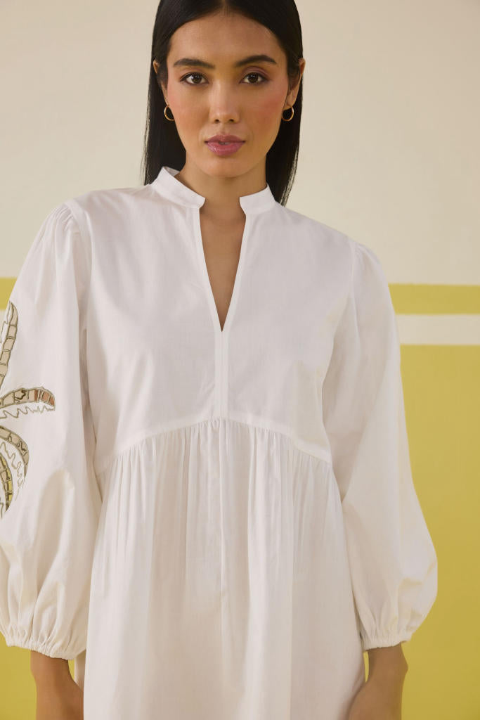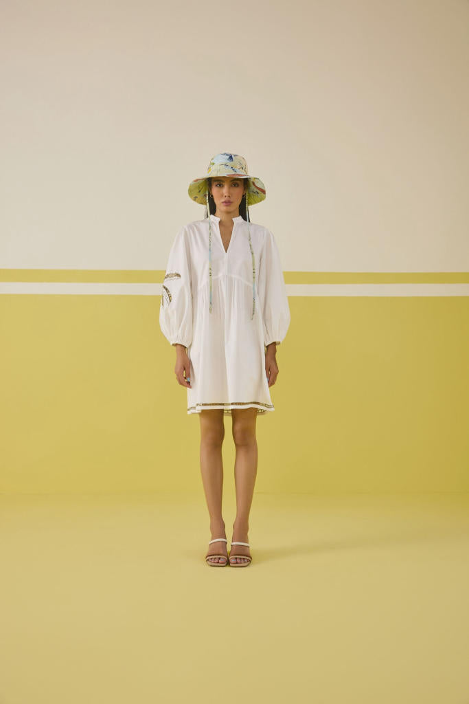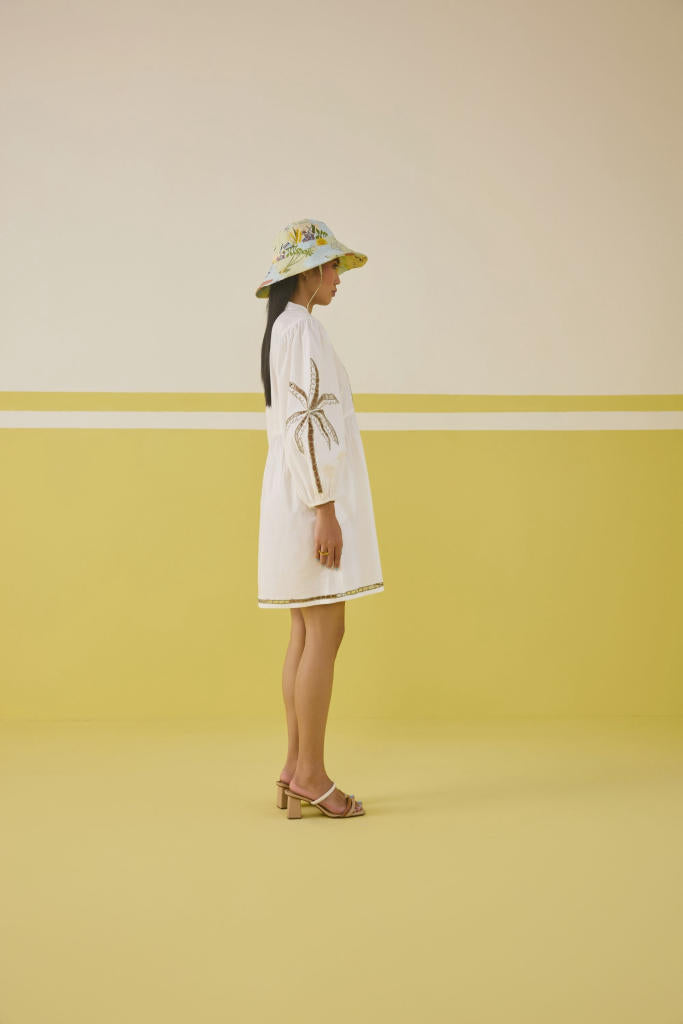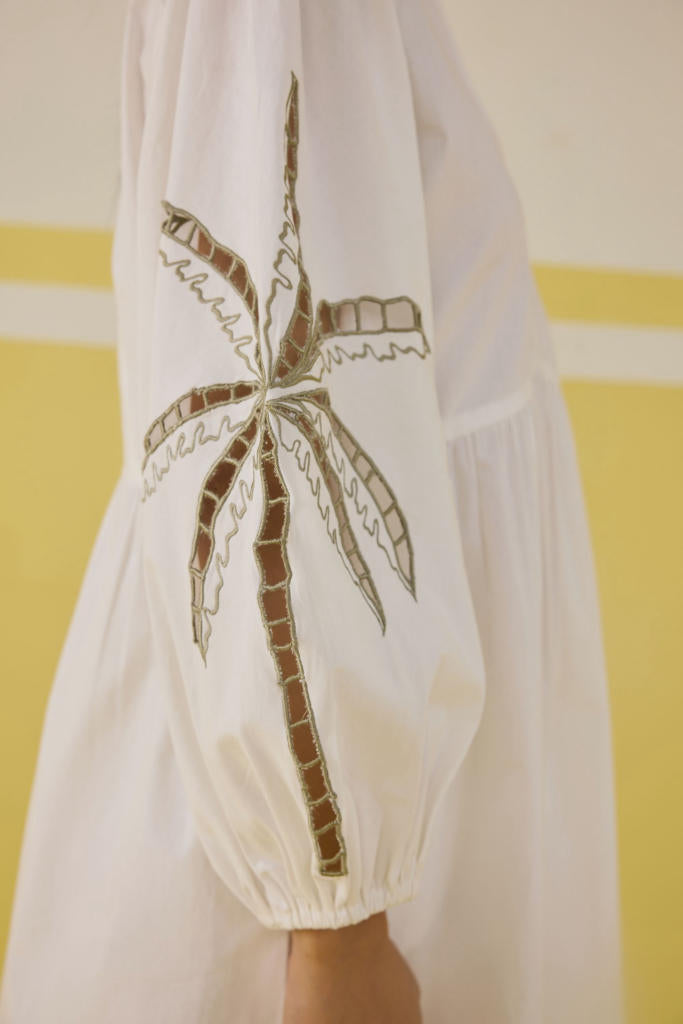 Relaxed fit, full puff sleeve, v-neck mini dress crafted in organic cotton poplin fabric, with cutwork machine embroidery on the skirt hem and sleeve of a palm tree motif.