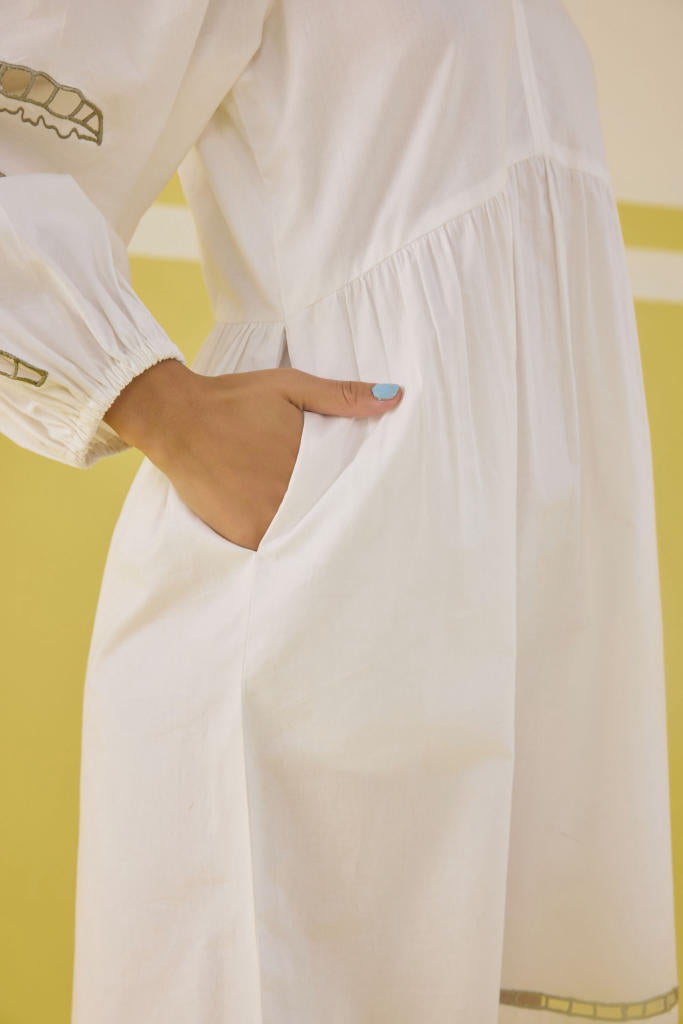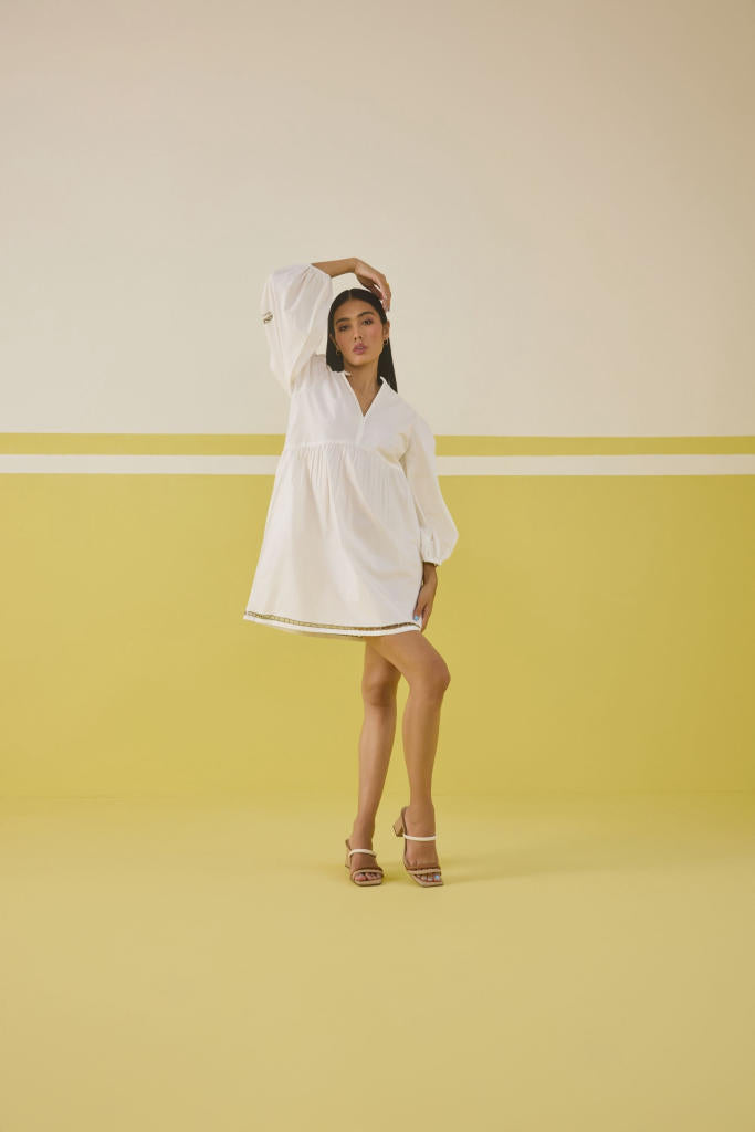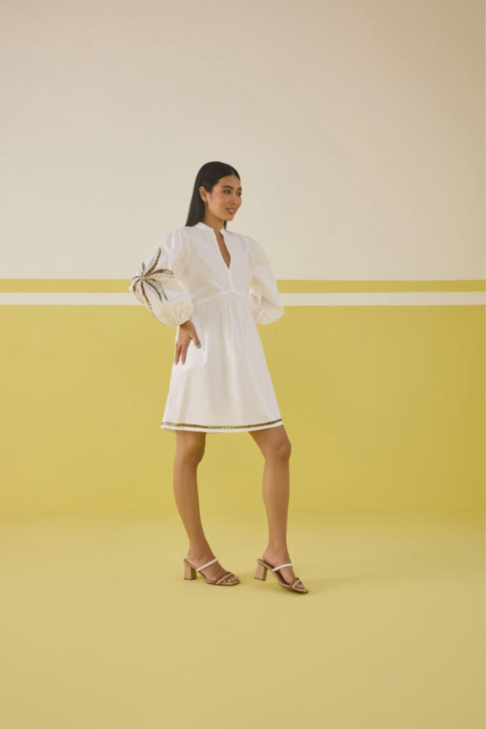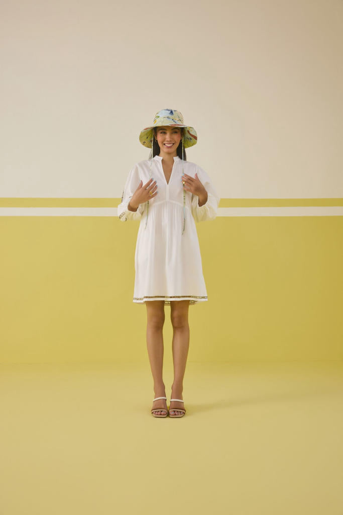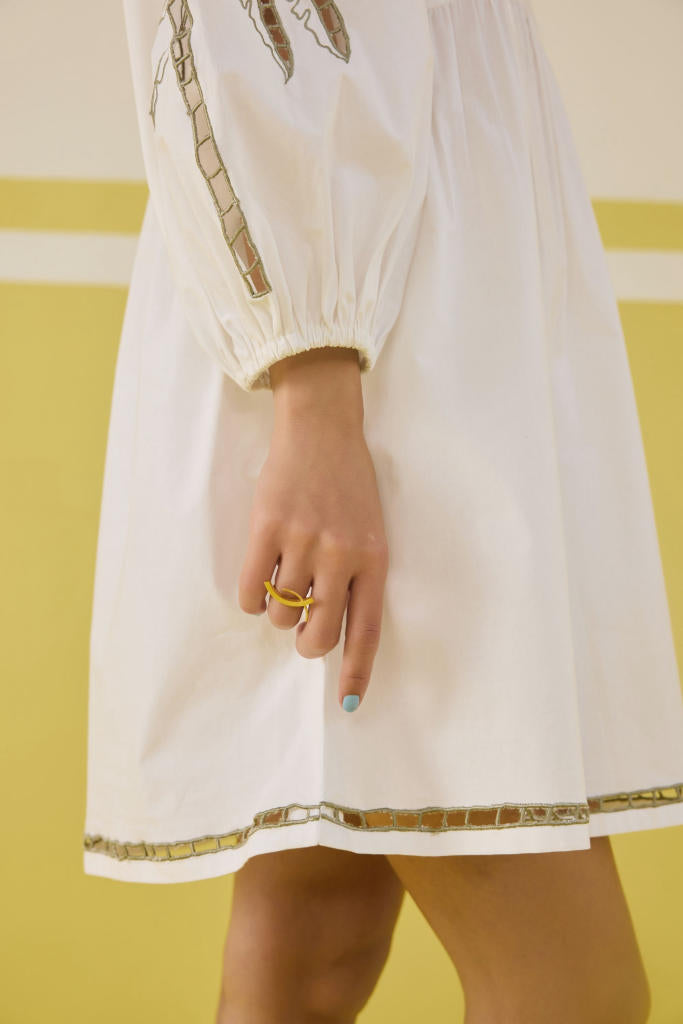 Relaxed fit, full puff sleeve, v-neck mini dress crafted in organic cotton poplin fabric, with cutwork machine embroidery on the skirt hem and sleeve of a palm tree motif.