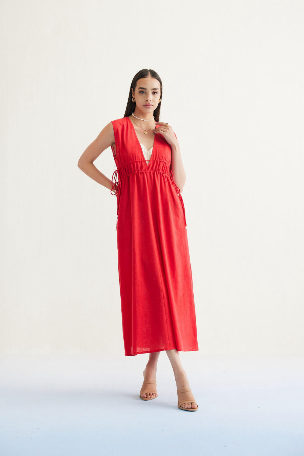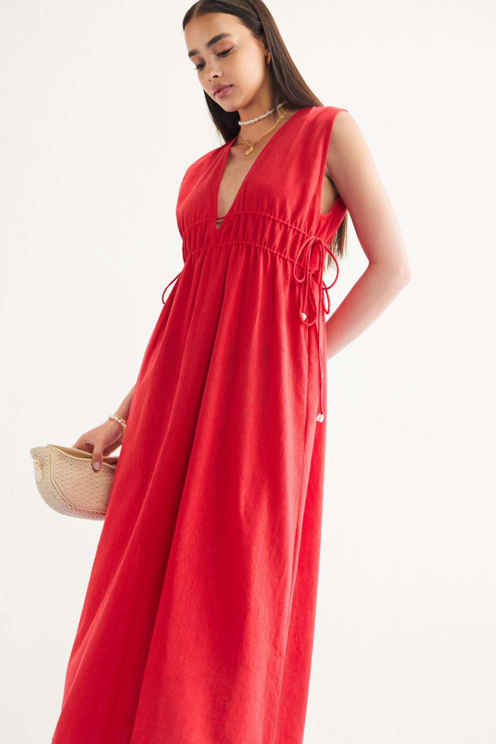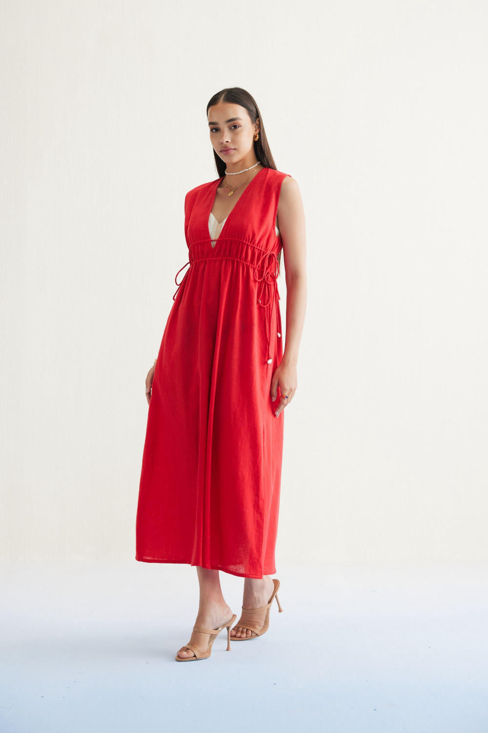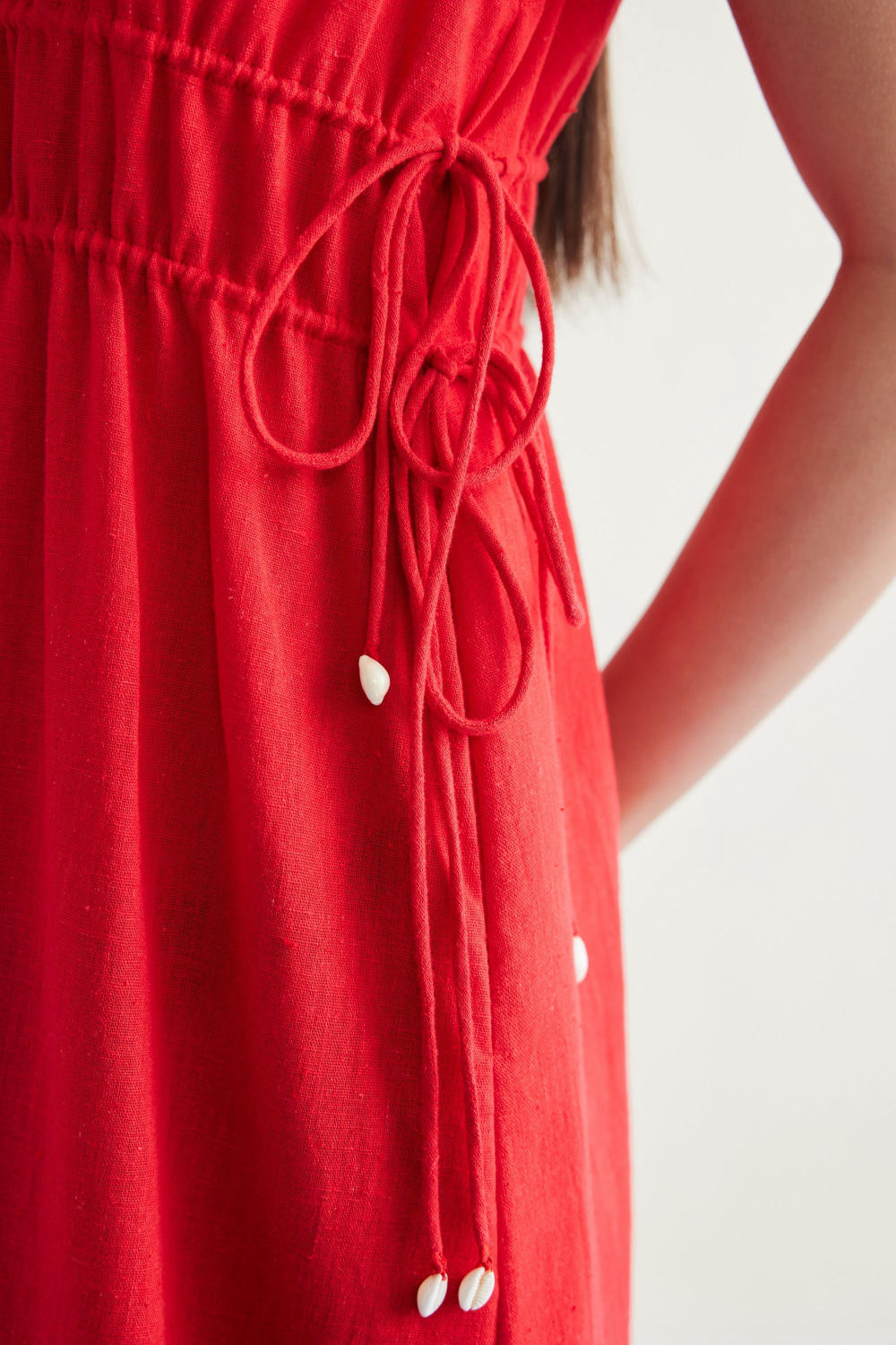 Relaxed fit, sleeveless, v-neck, maxi dress that is fitted at the waist with drawstrings that have cowrie shells on the tie ends, crafted in azo-free dyed, handspun and handwoven Kala cotton fabric. Timeless looks like this dress are a must for conscious closets. Dress it up with jewelry and heels for when you go out, or keep it super simple for casual occasions.