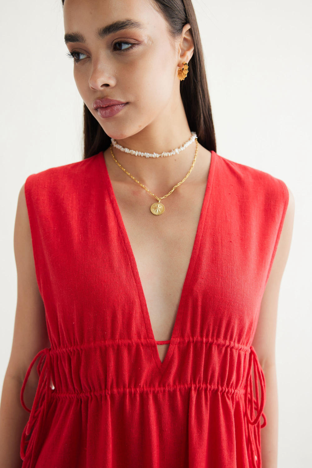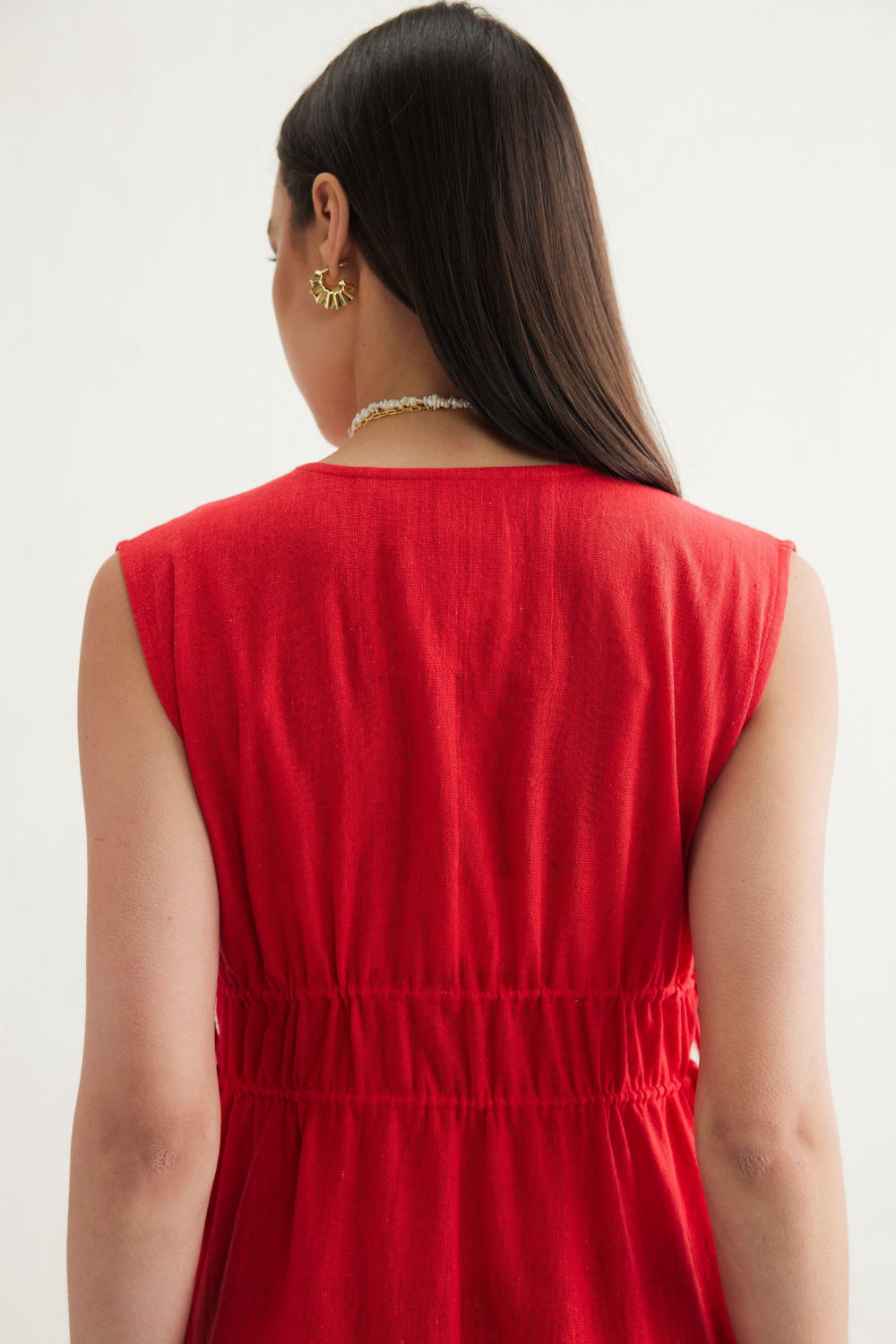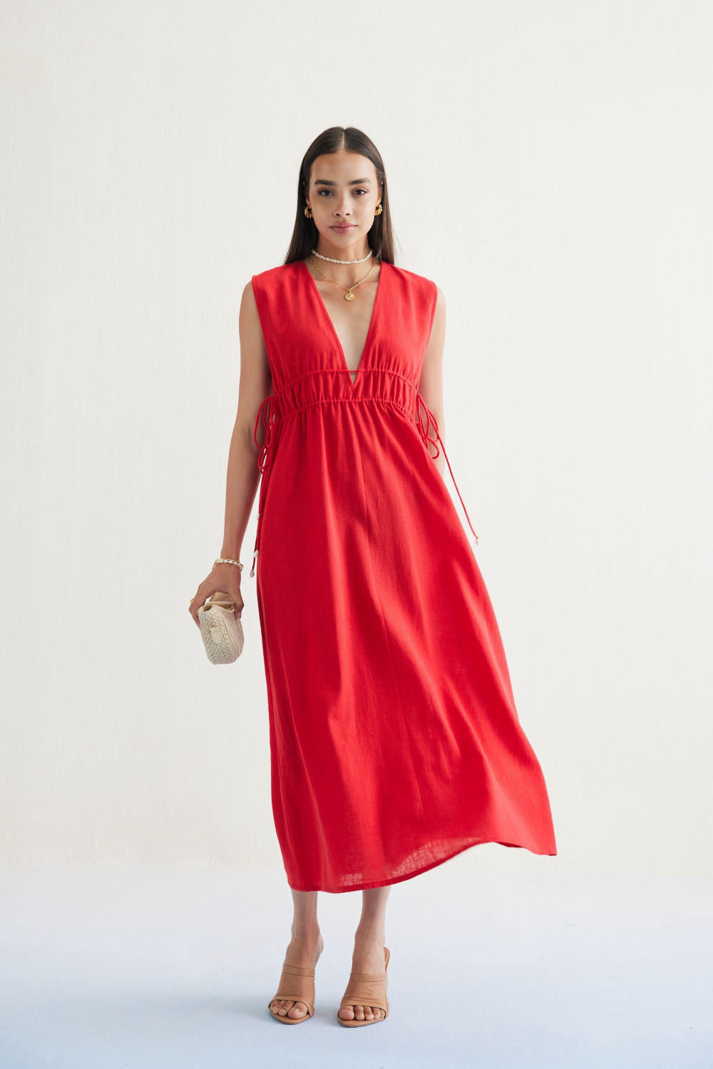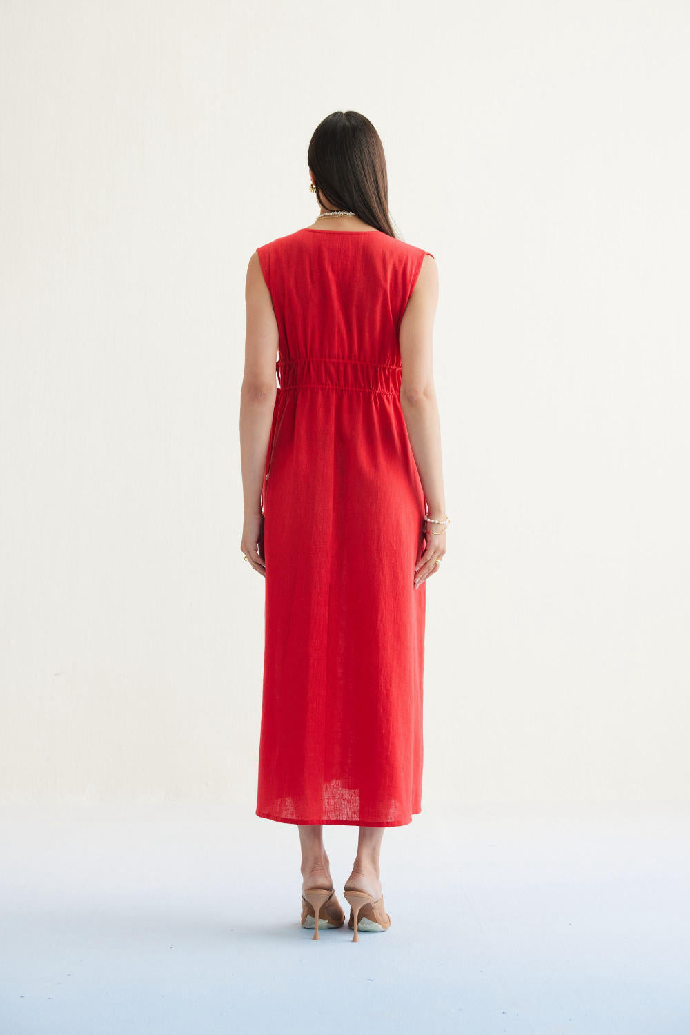 Relaxed fit, sleeveless, v-neck, maxi dress that is fitted at the waist with drawstrings that have cowrie shells on the tie ends, crafted in azo-free dyed, handspun and handwoven Kala cotton fabric. Timeless looks like this dress are a must for conscious closets. Dress it up with jewelry and heels for when you go out, or keep it super simple for casual occasions.