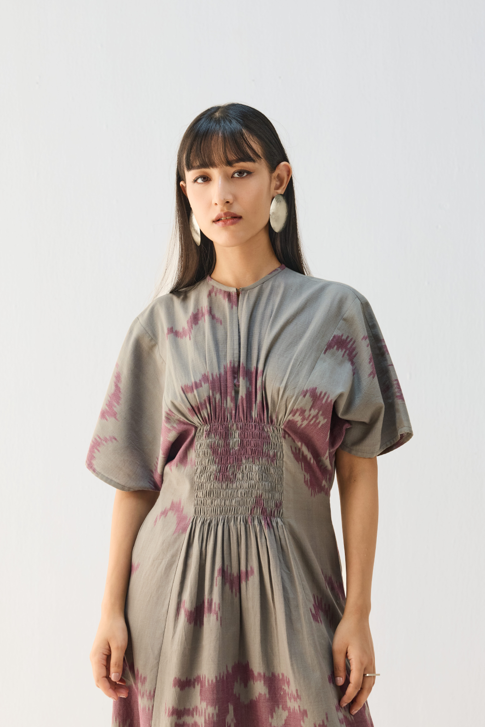 The pattern of this elegant dress is created using a slow craft method called ikkat. The term comes from the Malay-Indonesian word “mengikat”, meaning “to tie”, which describes how this fabric is resist-dyed in specific patterns before they are woven on the loom. When woven, these dyed threads align to form motifs.