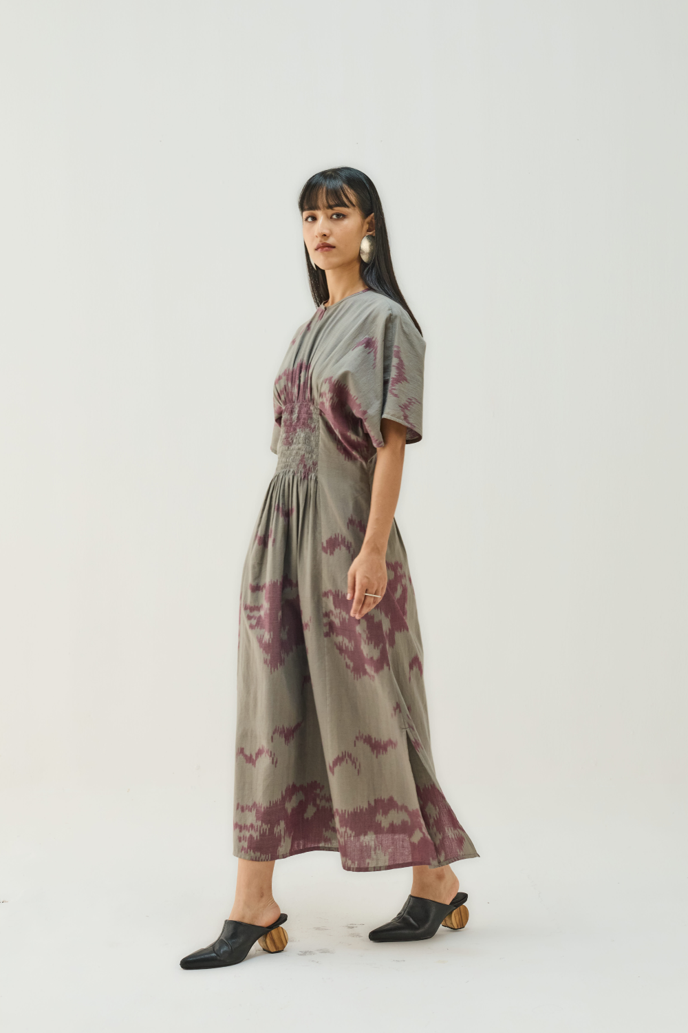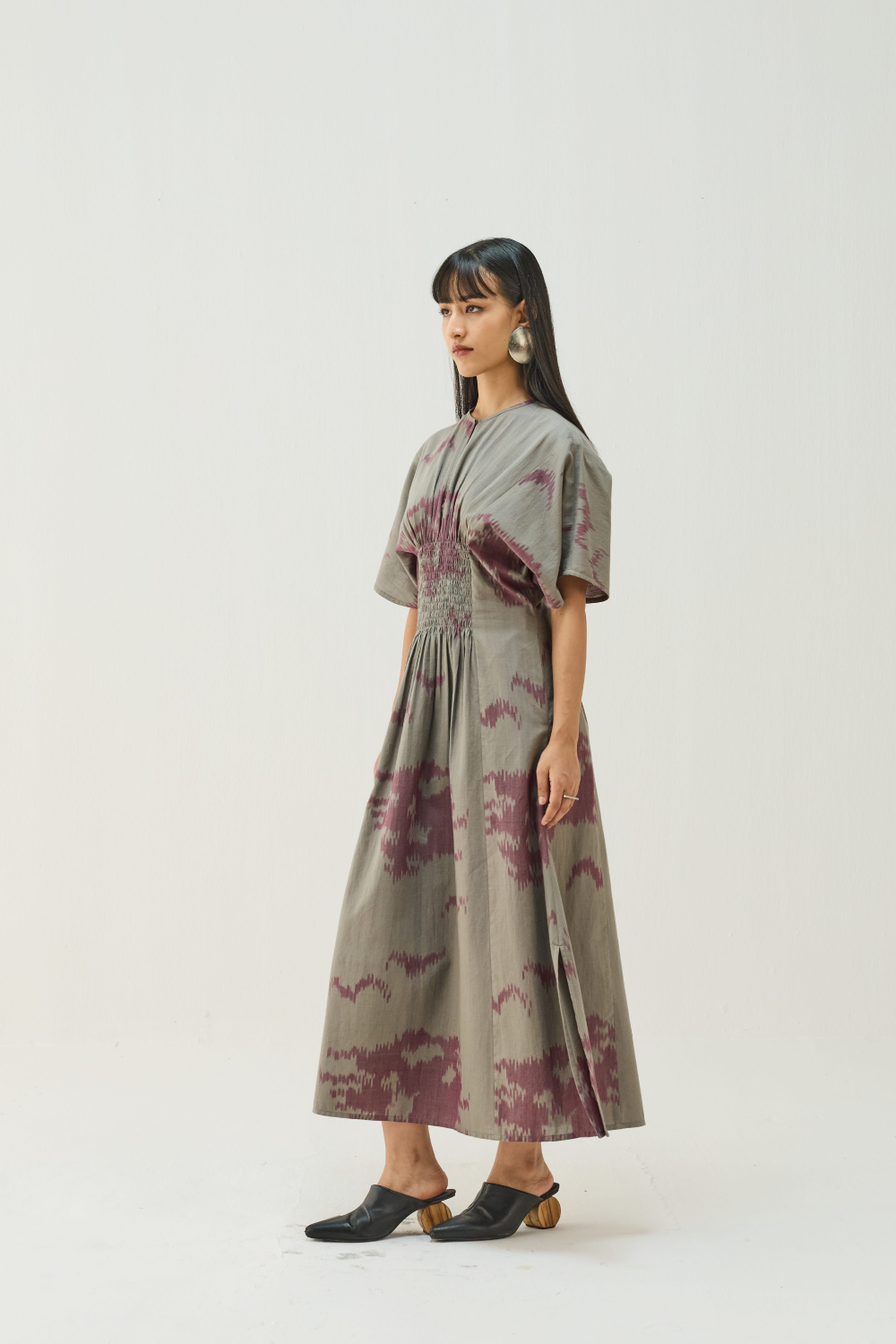 Regular fit, half sleeve, maxi dress that's smocked and fitted at the waist, crafted in an ikat fabric, the yarns are resist-dyed with azo-free dyes then handwoven to create its pattern.