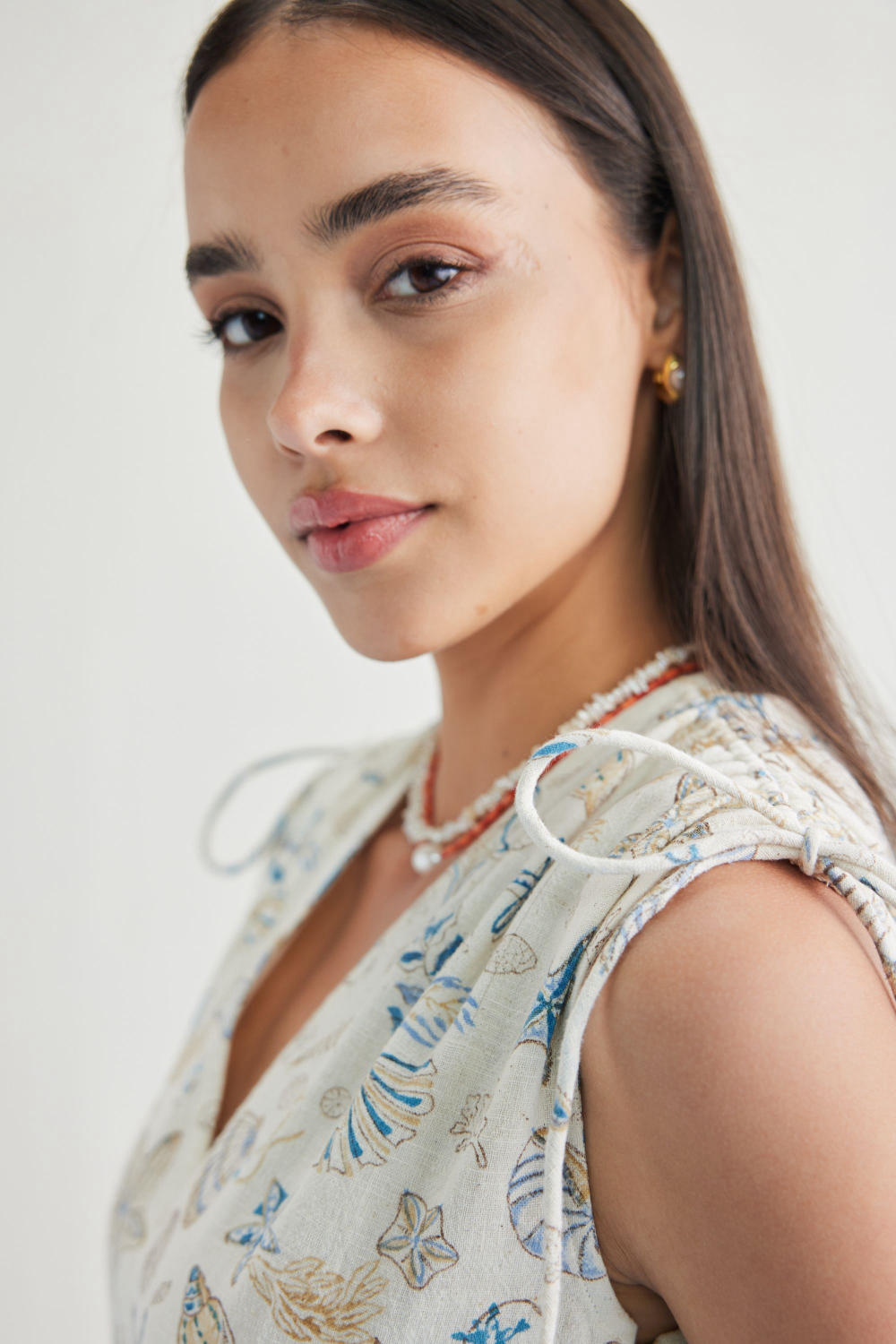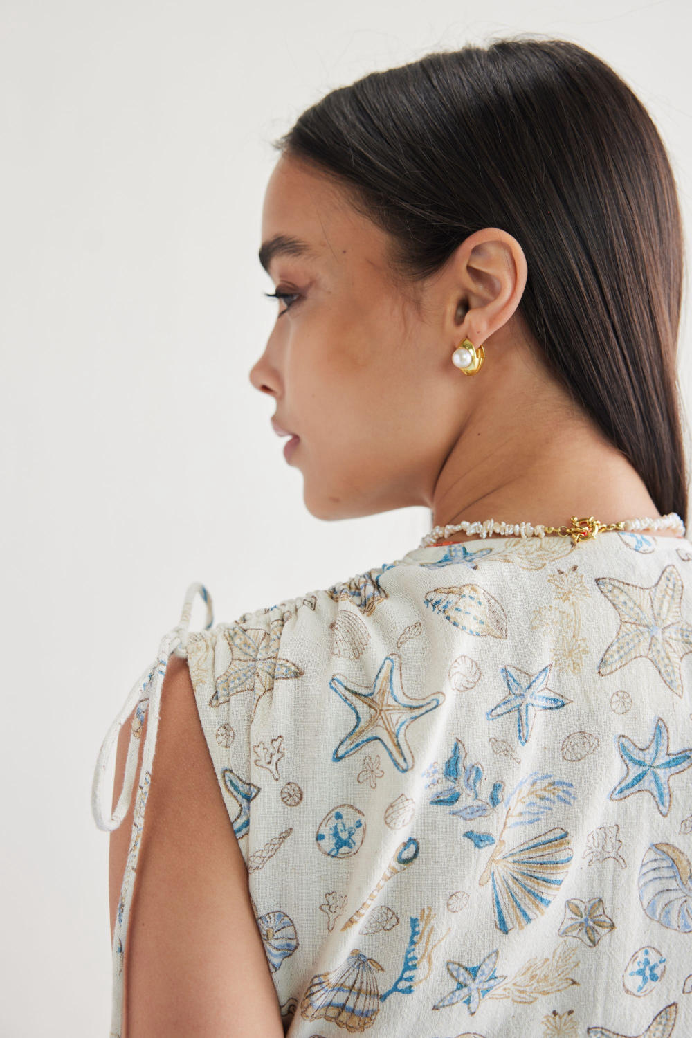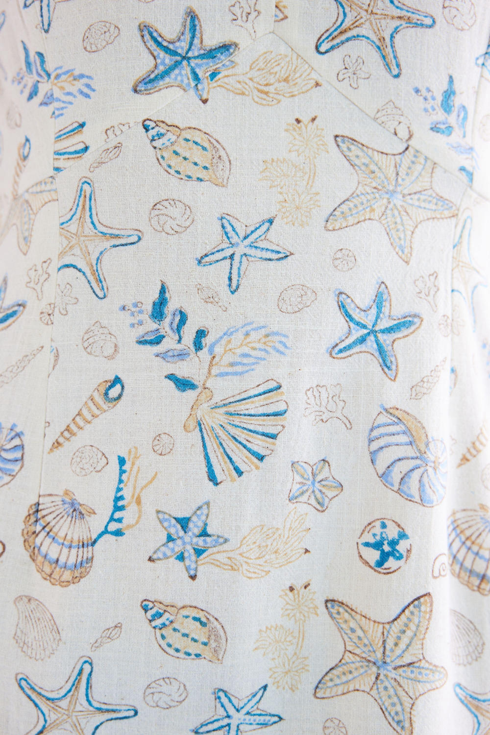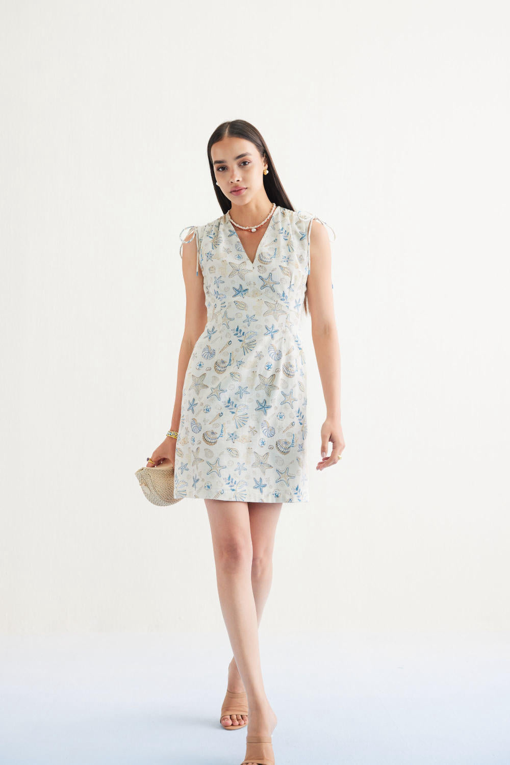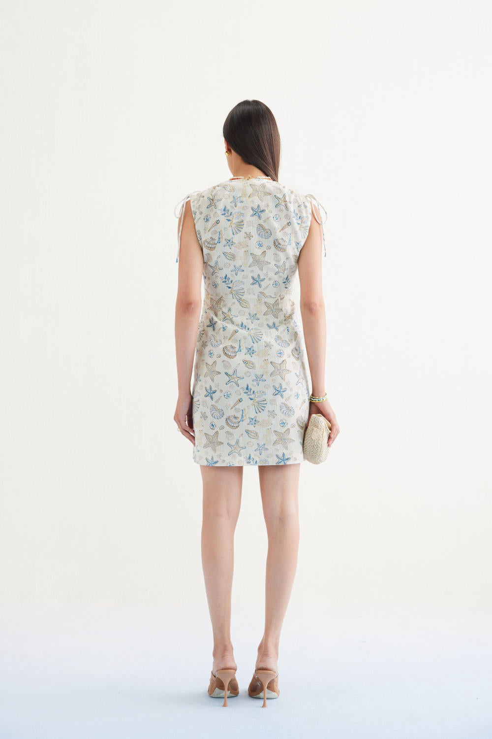Fitted, sleeveless, v-neck, mini dress with drawstings at the shoulders crafted in handspun and handwoven organic cotton fabric, hand block printed with our signature ocean life inspired motif using azo-free dyes.