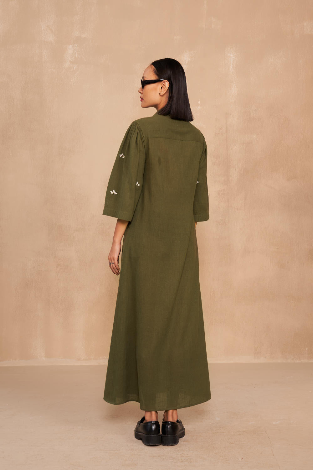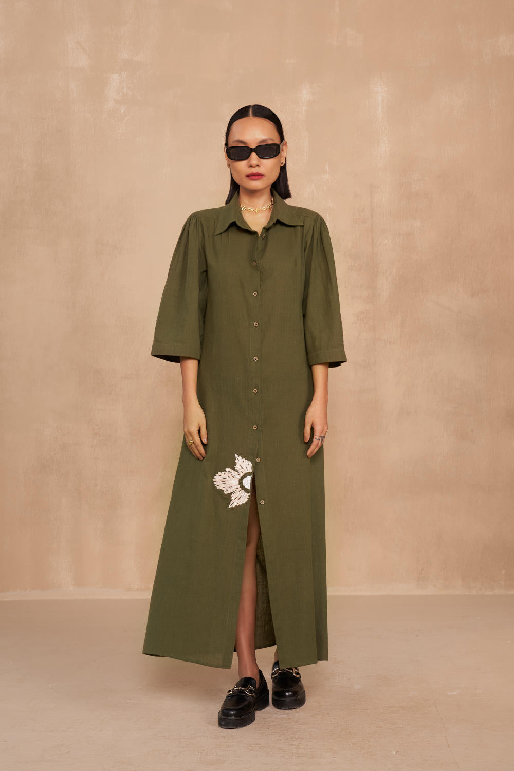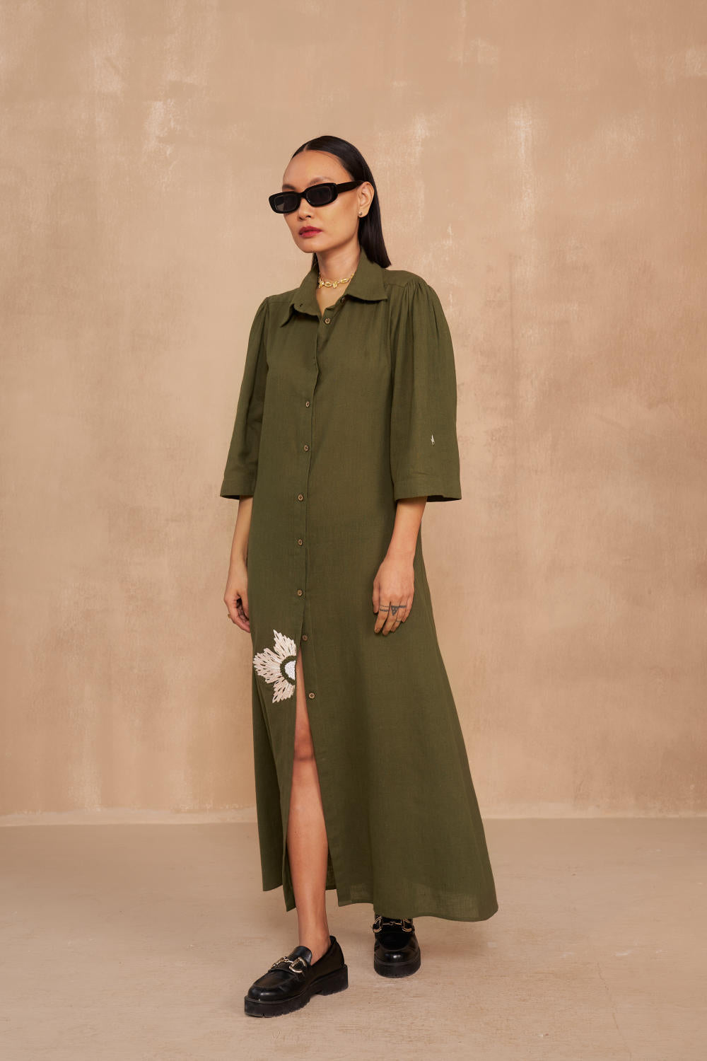 Regular fit, half-sleeve, maxi shirt dress buttoned in the front, crafted in azo-free dyed, handspun and handwoven organic cotton fabric, machine and hand embroidered with cosmos flower motifs. Timeless looks like this shirt dress are a must for conscious closets. Dress it up with jewelry and heels for when you go out, or keep it super simple for casual occasions.