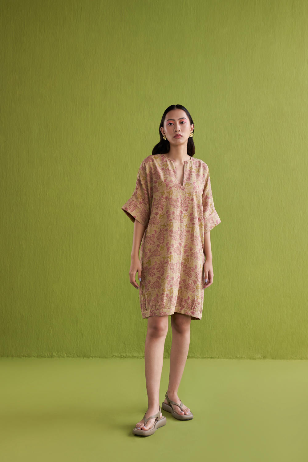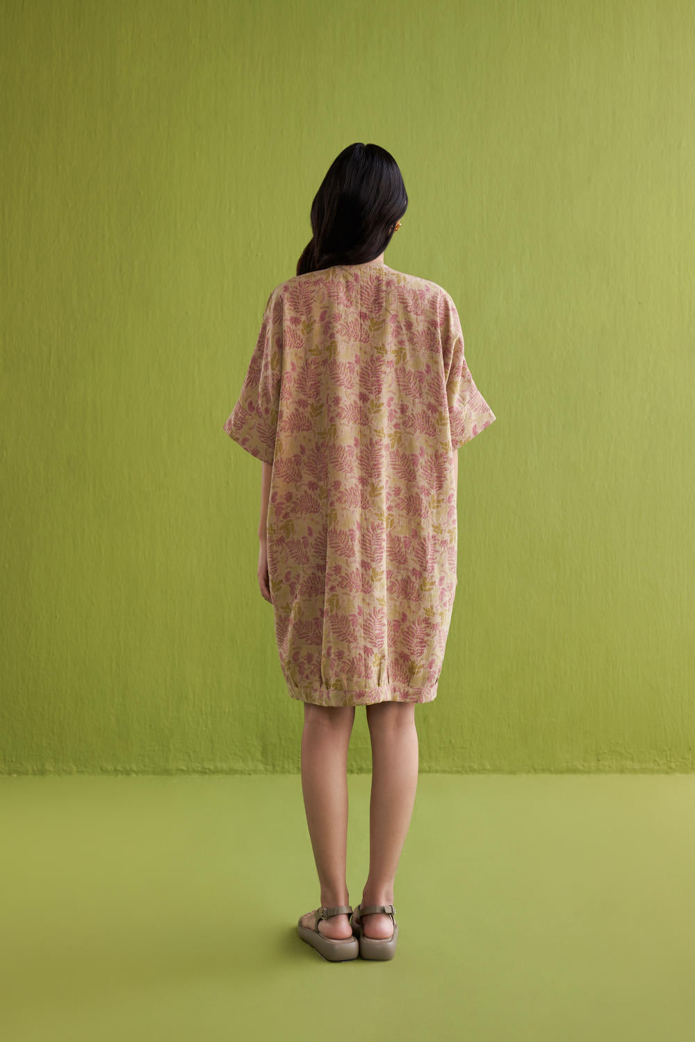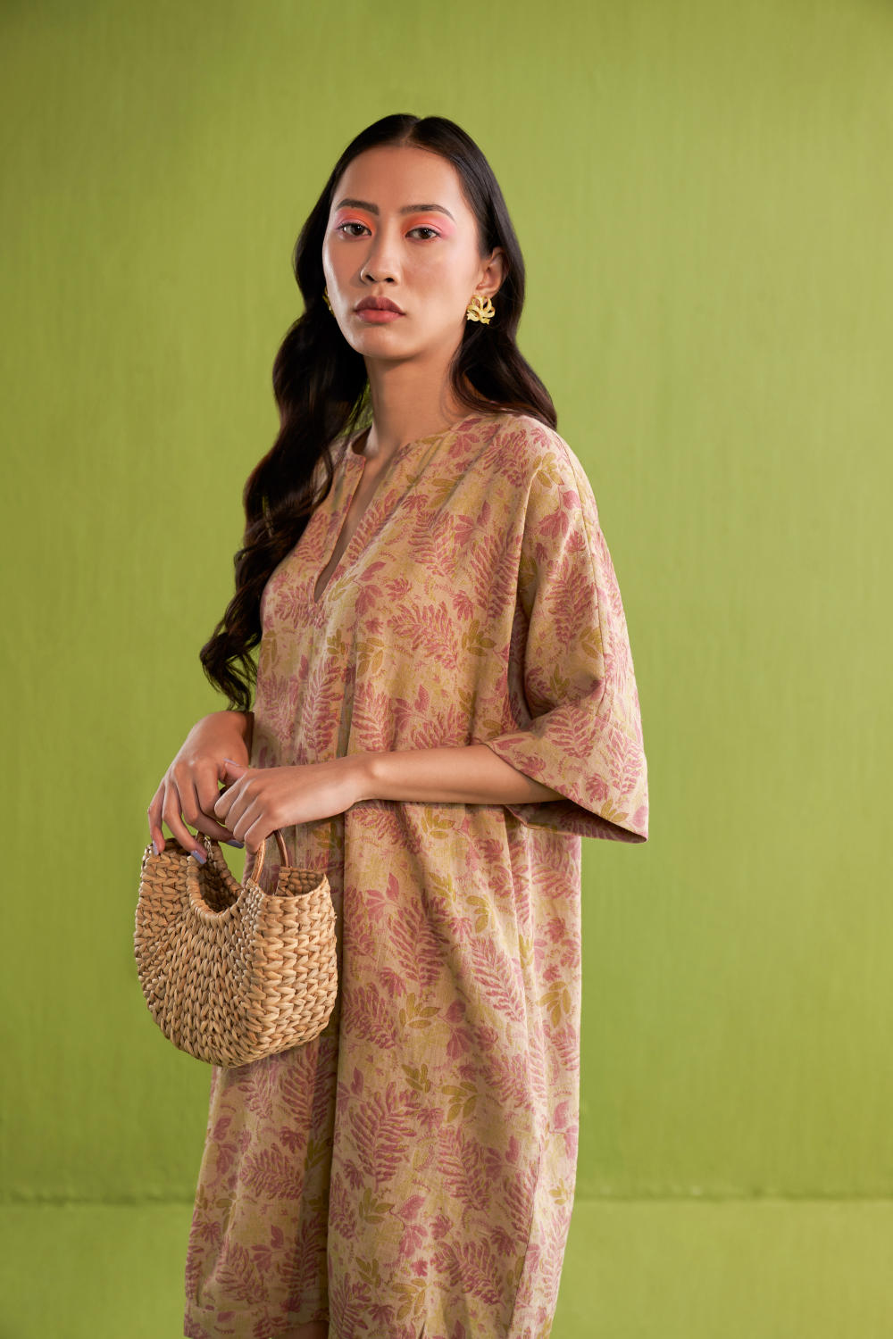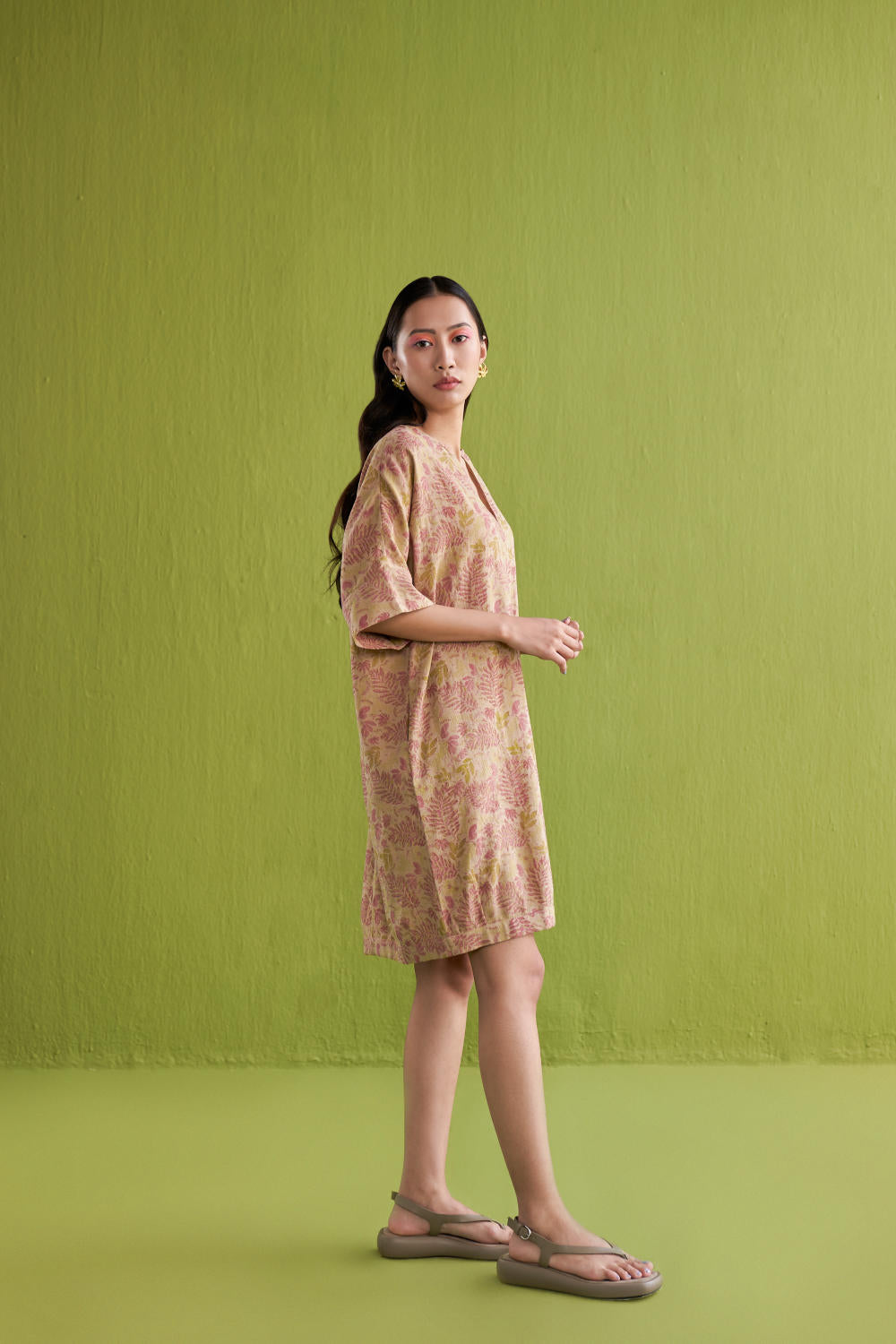 Relaxed, short-sleeve midi dress crafted in handwoven Kala cotton, hand block printed with our fern-inspired motif using azo-free dyes. Timeless looks like this dress are a must for conscious closets. Dress it up with jewelry and heels for when you go out, or keep it super simple for casual occasions.