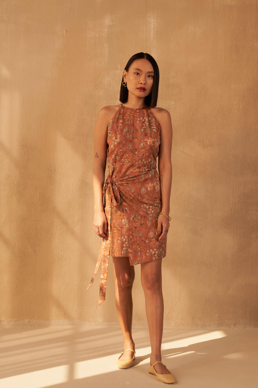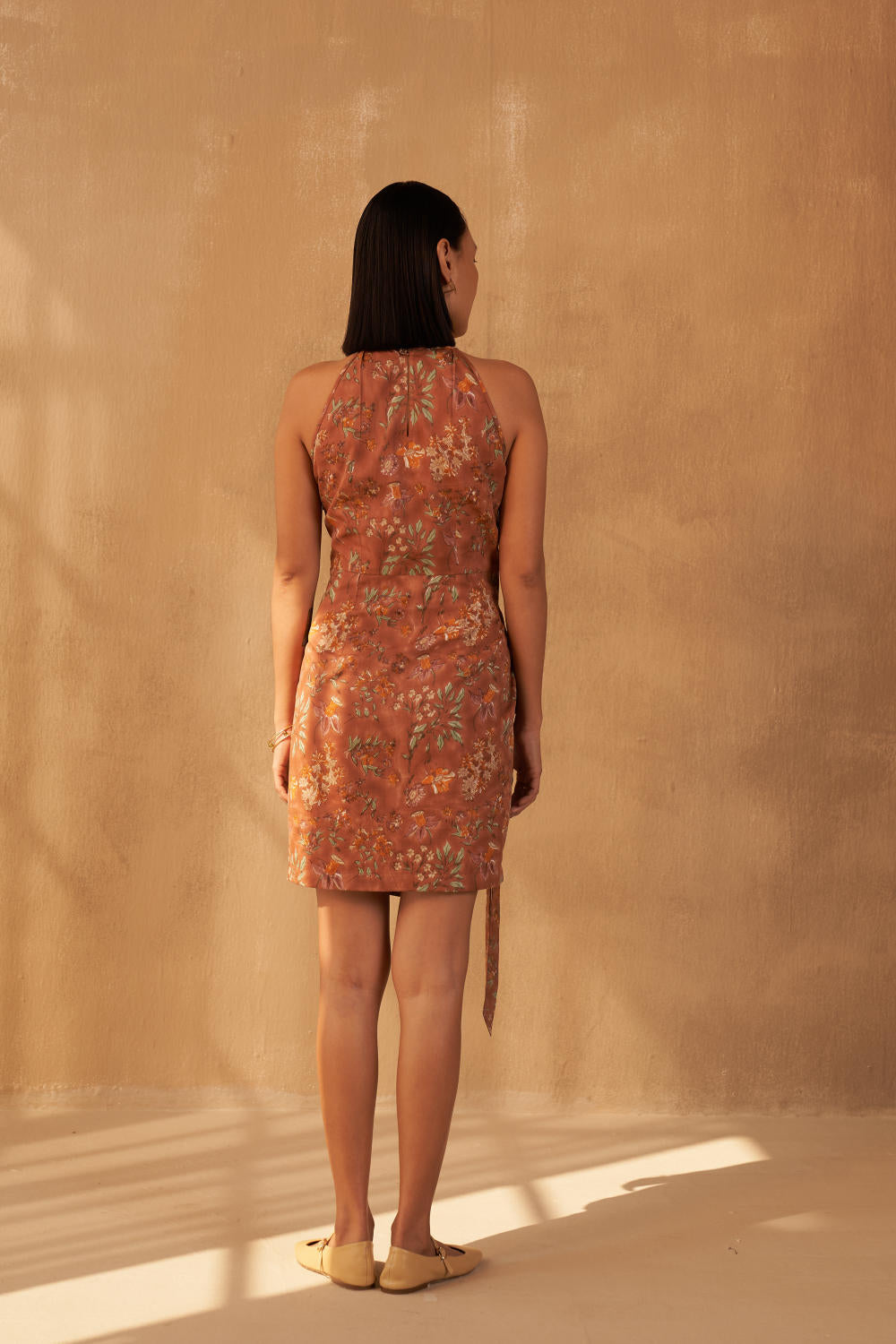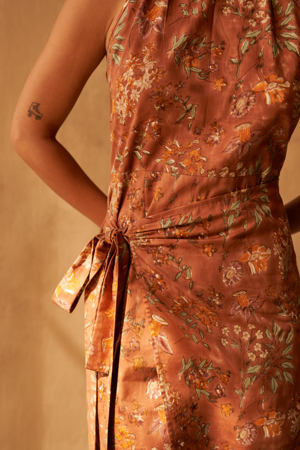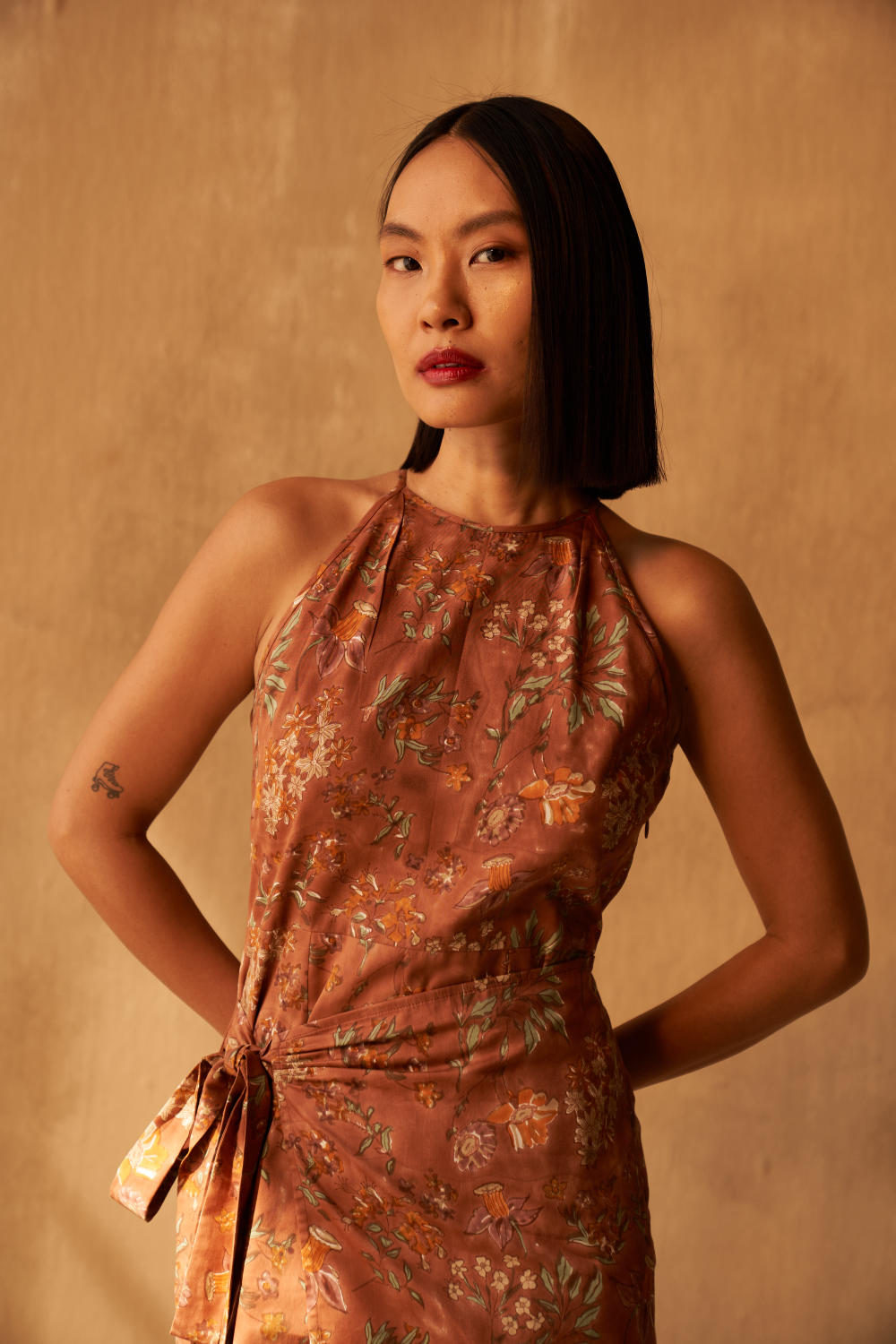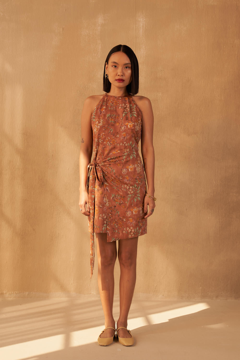 Fitted, halterneck, mini dress with tie at the hip crafted in handwoven organic cotton satin fabric, hand block printed with our signature Field of Flowers motif using azo-free dyes. A staple everyday dress is a must for any sustainable wardrobe. This piece is made in fabric that's completely made by hand from spinning the fibres to weaving it into fabric - all created by Indian artisans.