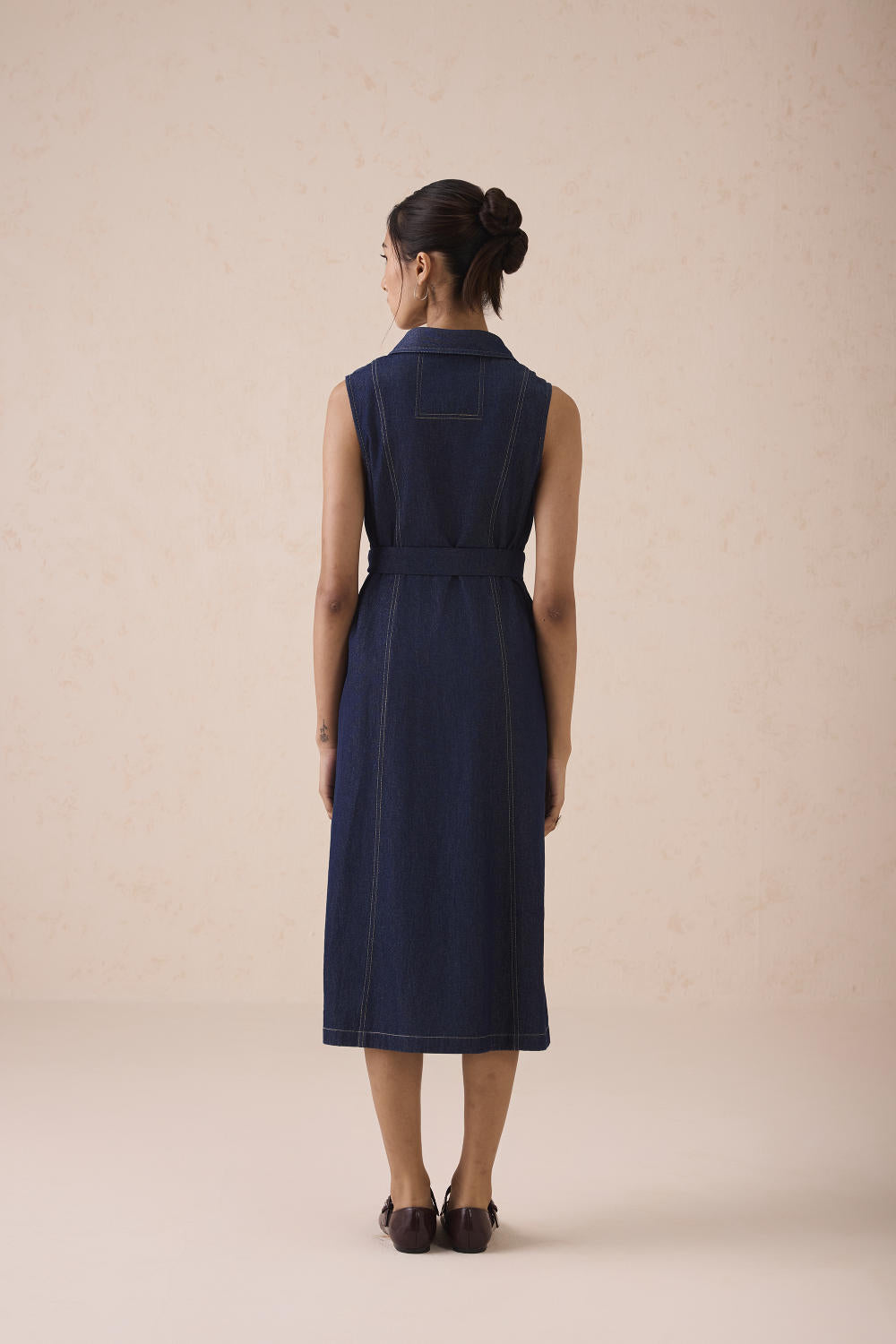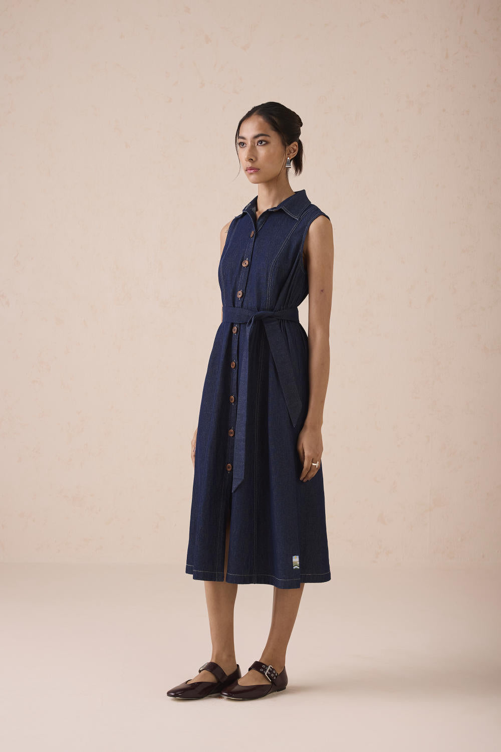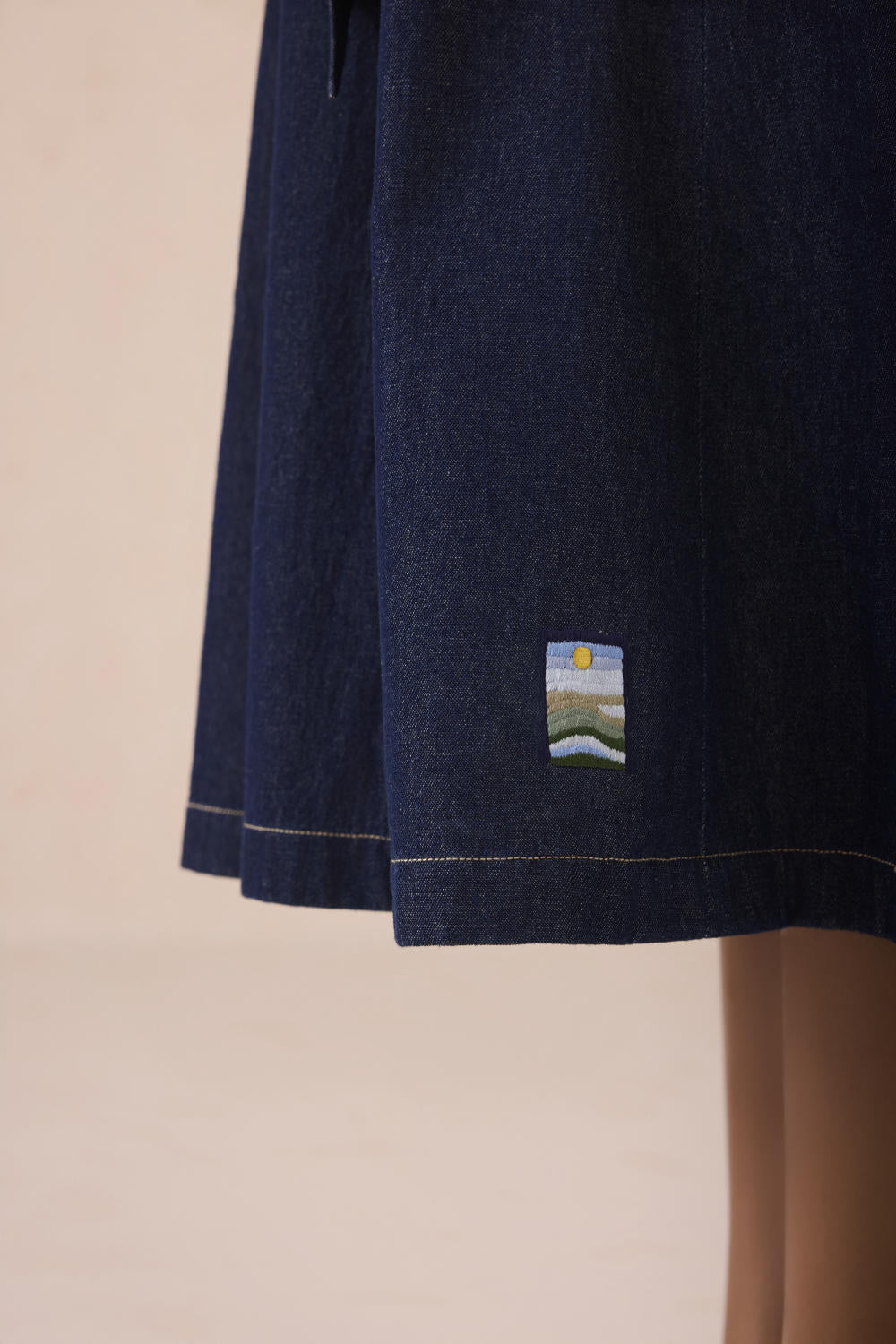 Fitted, collared, sleeveless midi dress that buttons at the front and is fitted at the waist, crafted in cotton denim fabric created with a blend of cotton and recycled cotton fibres, machine embroidered with a sunset motif. A staple comfortable dress is a must for any sustainable wardrobe - especially if its super versatile. This look can go from day to night, work to play, easily with just a few accessory changes.