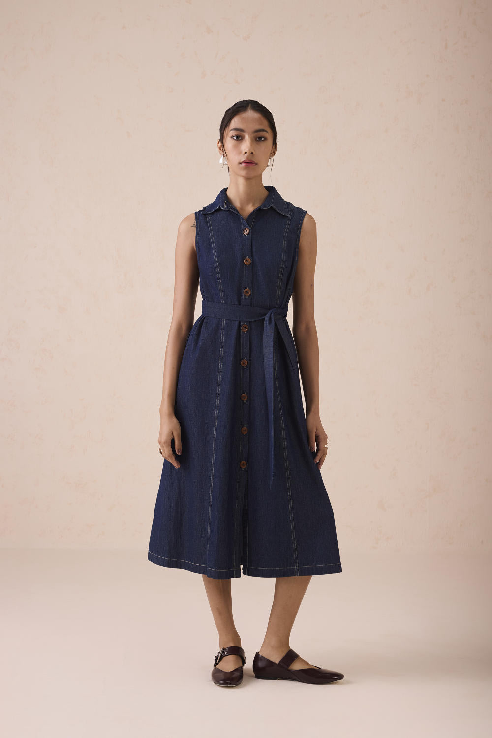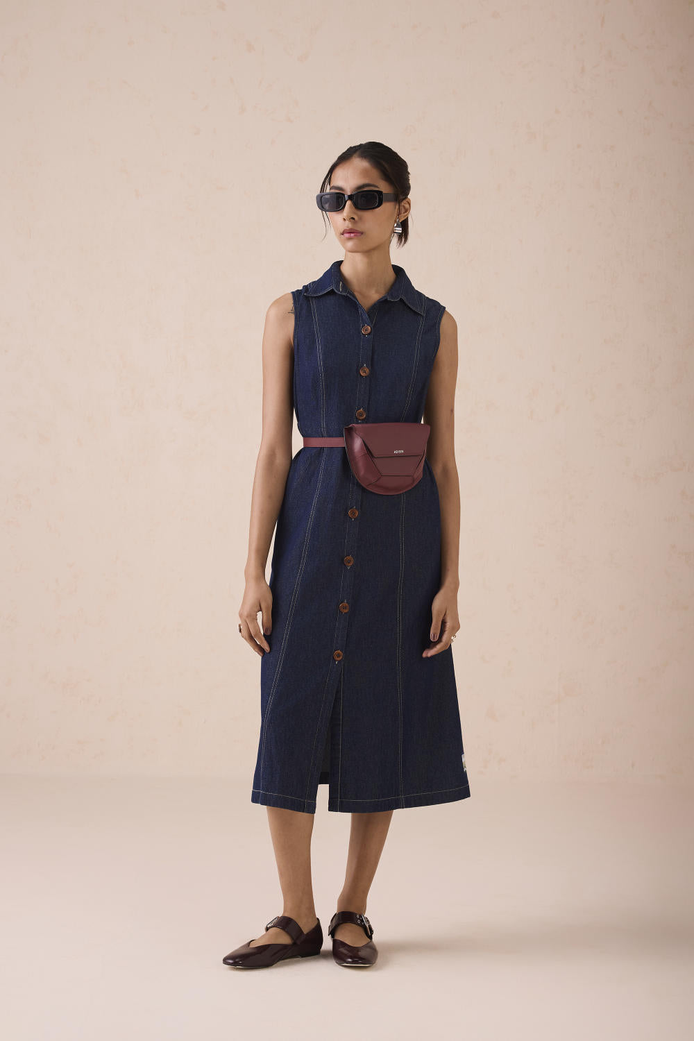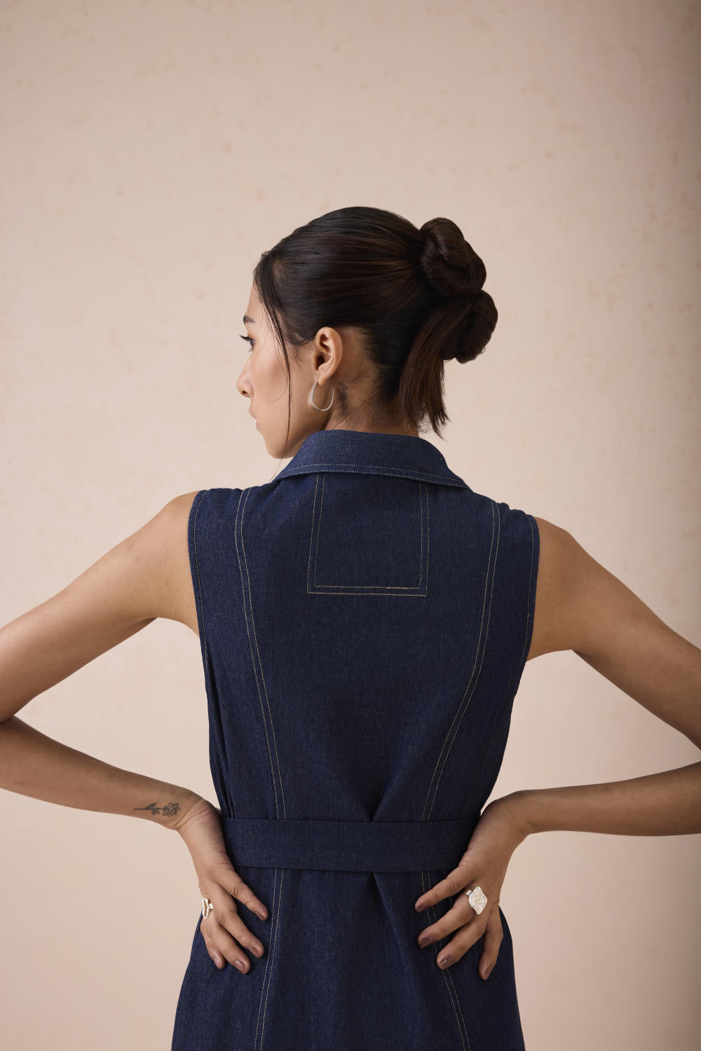 Fitted, collared, sleeveless midi dress that buttons at the front and is fitted at the waist, crafted in cotton denim fabric created with a blend of cotton and recycled cotton fibres, machine embroidered with a sunset motif. A staple comfortable dress is a must for any sustainable wardrobe - especially if its super versatile. This look can go from day to night, work to play, easily with just a few accessory changes.