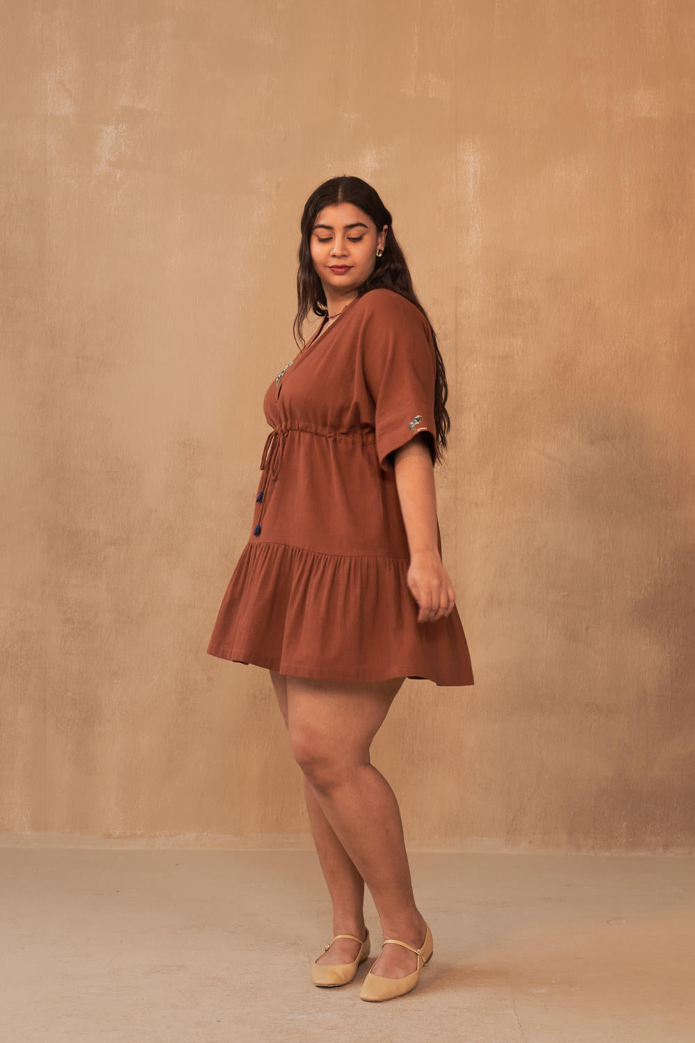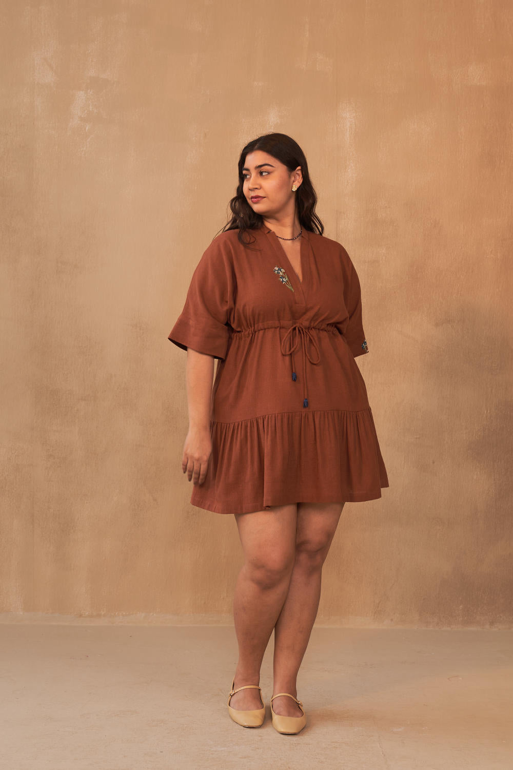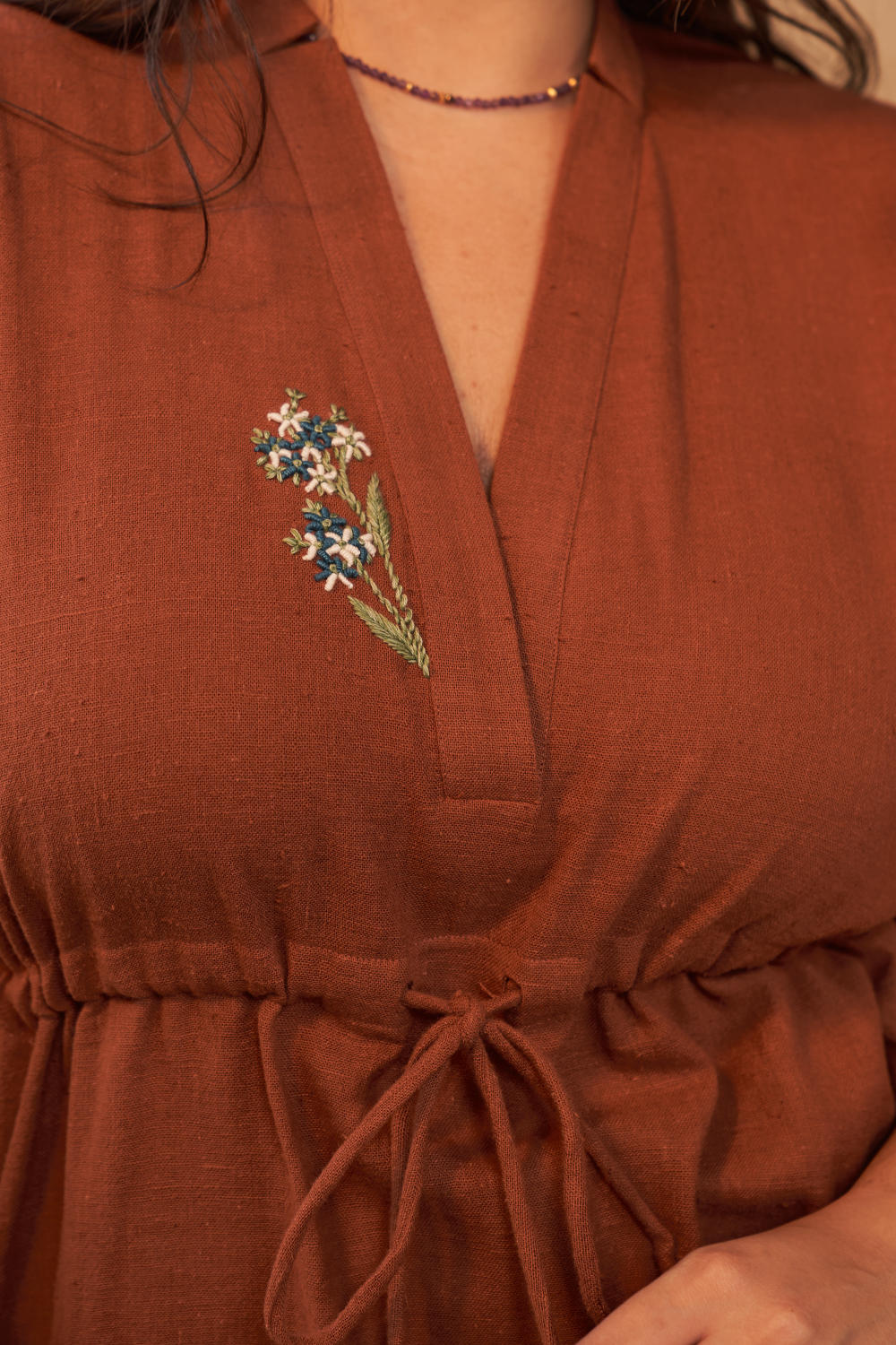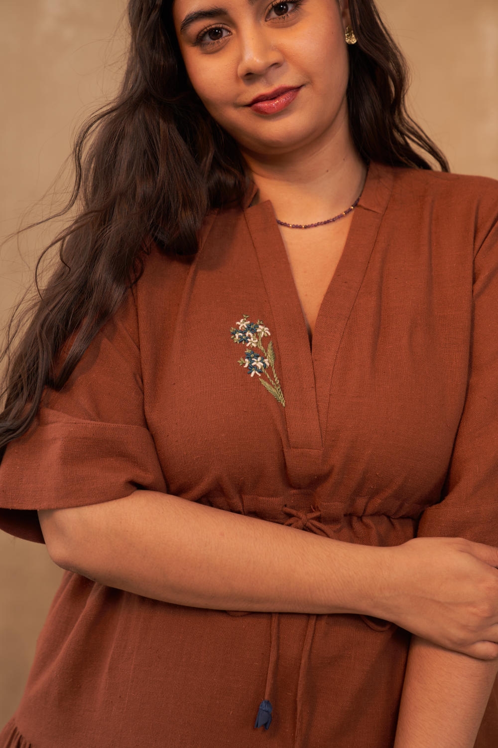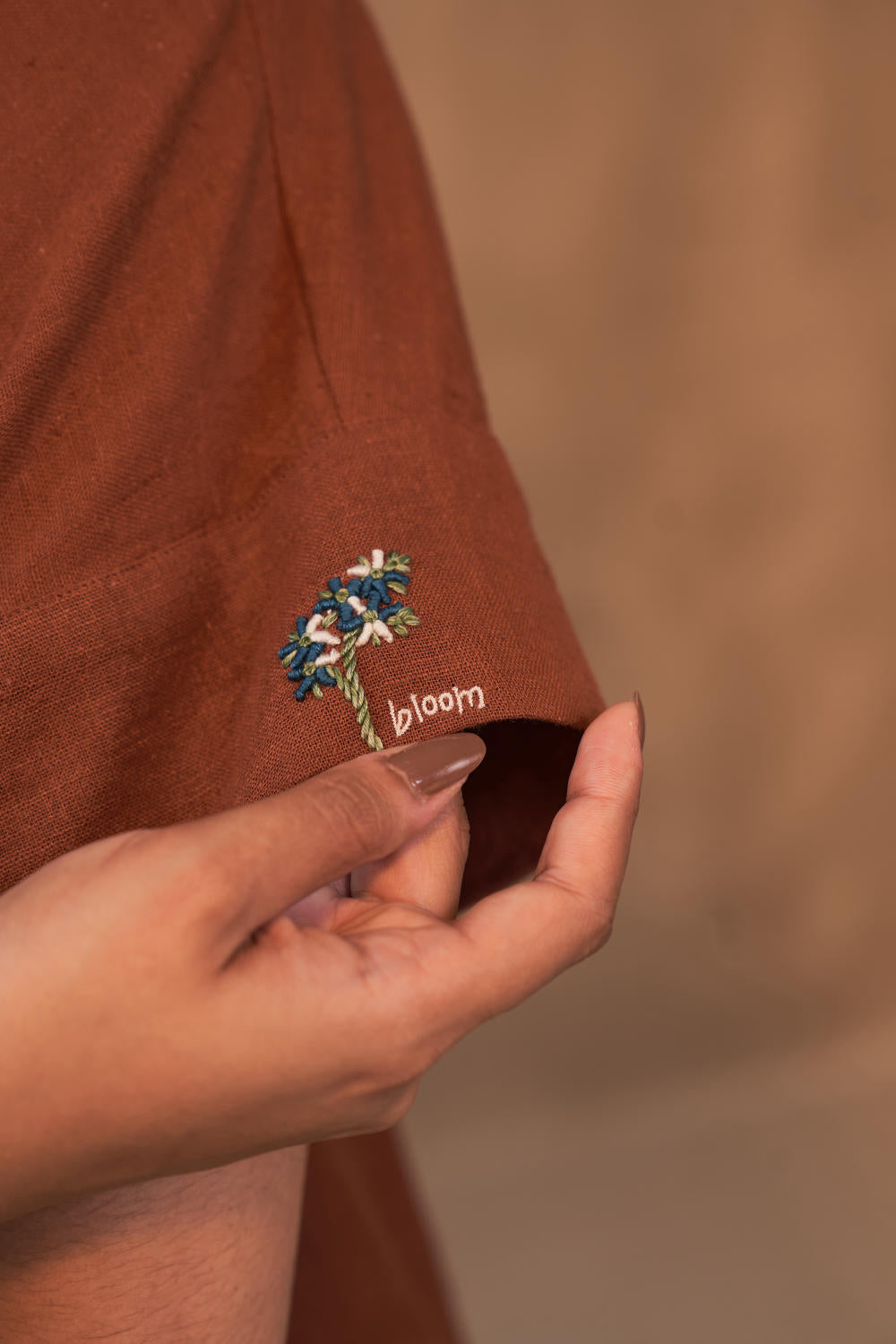 Relaxed fit, half-sleeve, v-neck dress crafted in azo-free dyed handwoven Kala cotton fabric, hand embroidered with wildflower motifs. A staple everyday dress is a must for any conscious closet, and this is one of our community favourites! Designed for ultimate comfort, wear this look out or to stay in.