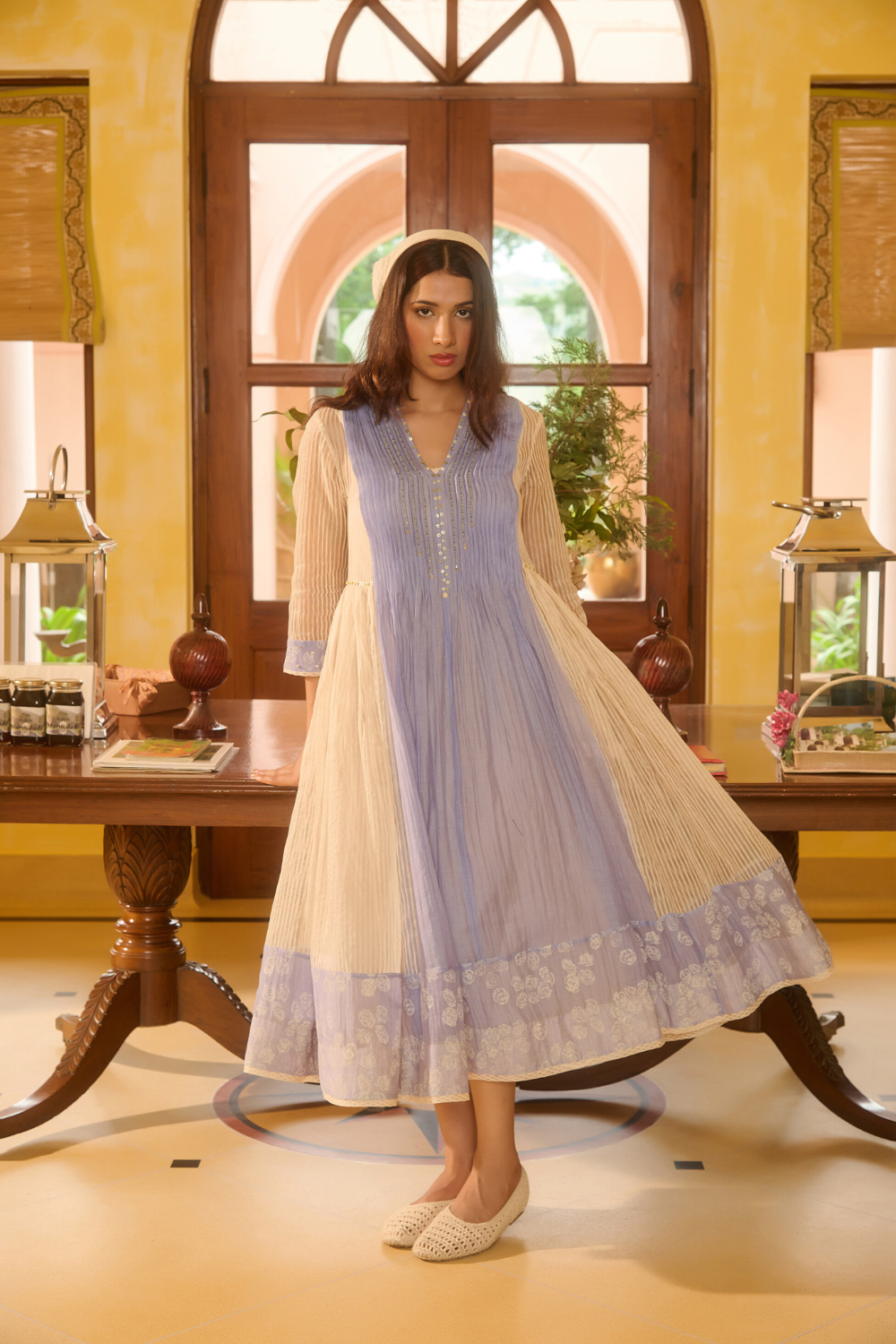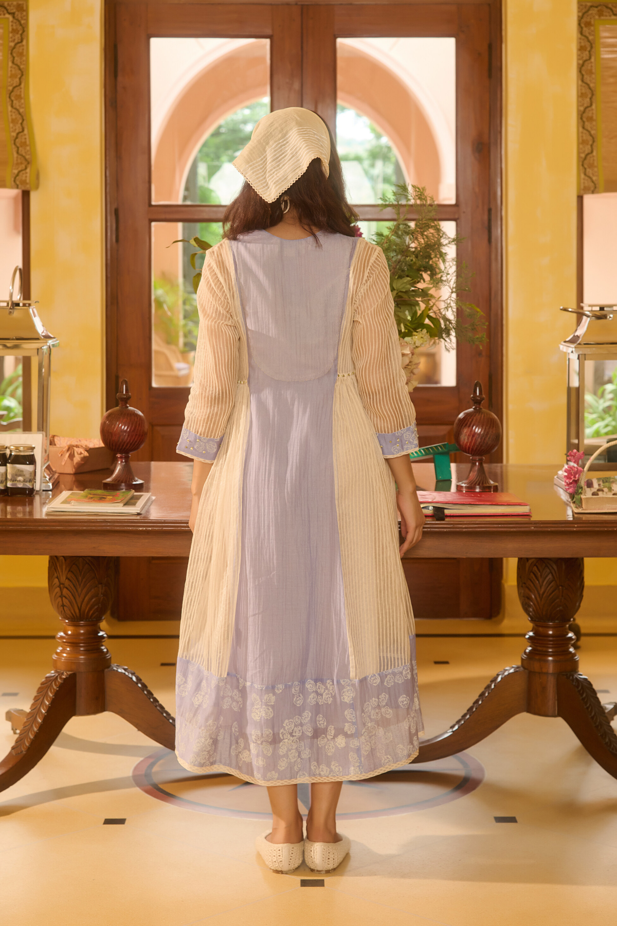 Her Chanderi carries its signature translucence and soft sheen, but with a subtlety that feels almost ethereal — printed slowly, consciously, through hand block printing that heightens the fabric's inherent delicacy.