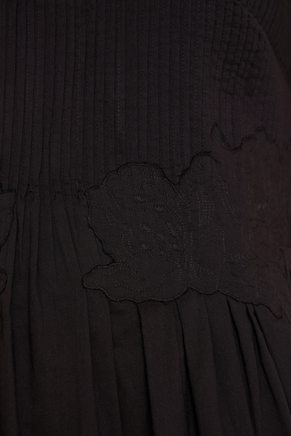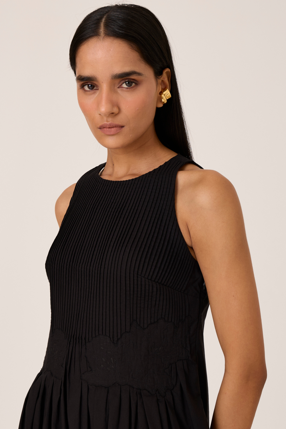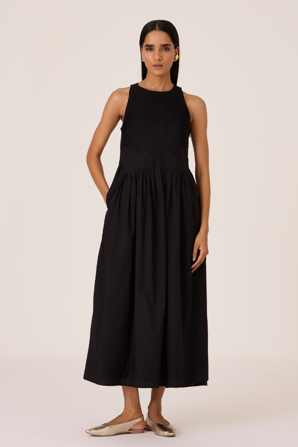 Gathered waist sleeveless dress with fine pintuck bodice. Waist gathers for gentle movement. Single rouleau button at the back. Side zip for ease. This garment is embroidered by hand in The Summer House studio. Slight differences in embroidery speak to the hand process involved.