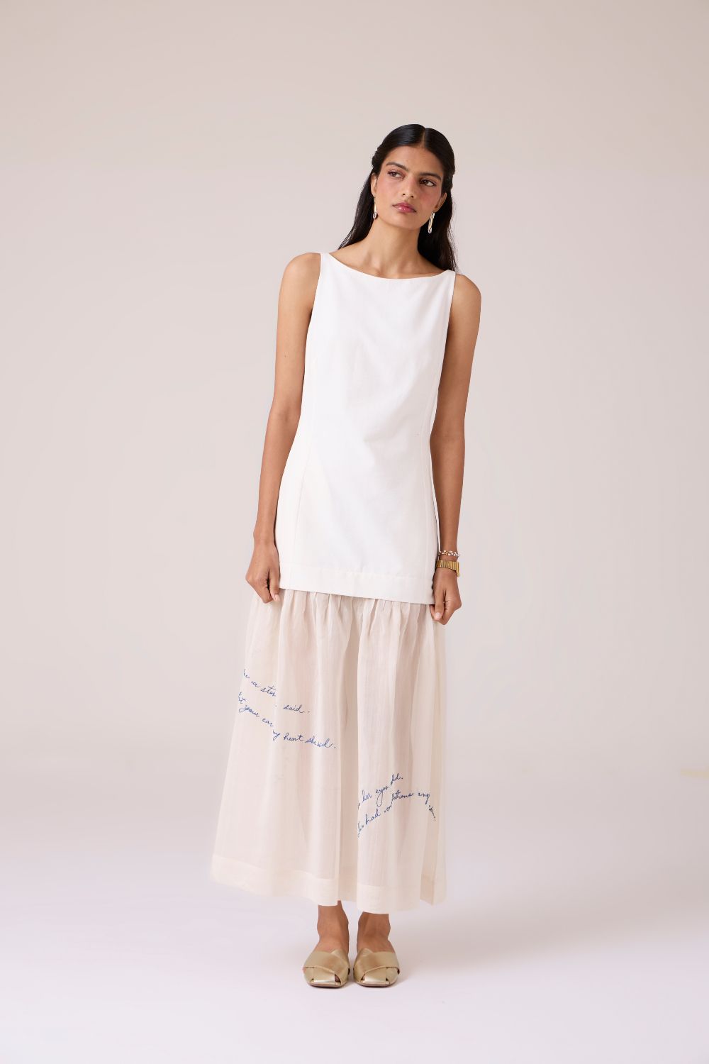 The lightness of being. Chanderi and handspun khadi merge in a layered dress where embroidery and sheerness frame the body in a quiet silhouette.
