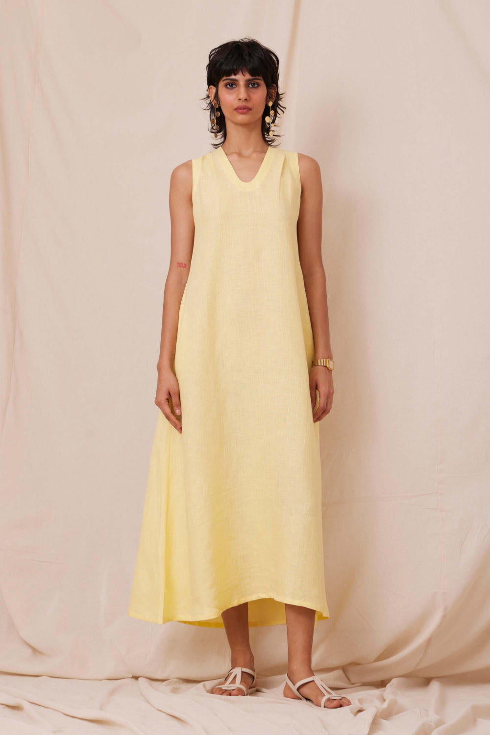 Suave linen dress, ideal for summer. Sleeveless with single pleat collar. In-seam pockets. Shipped with a slip.