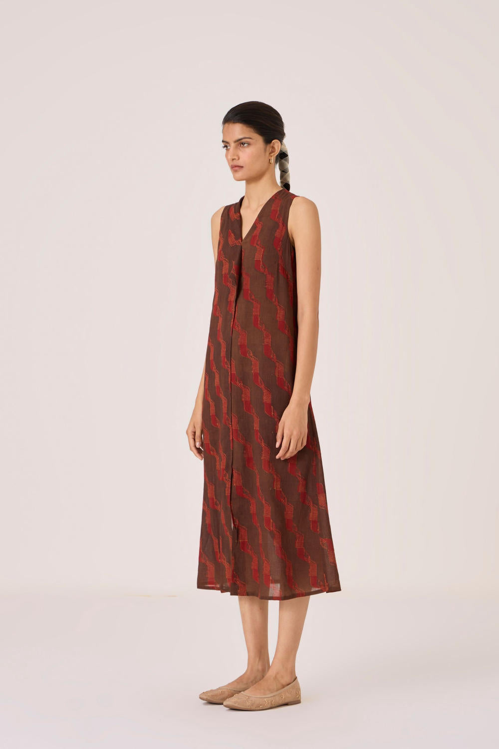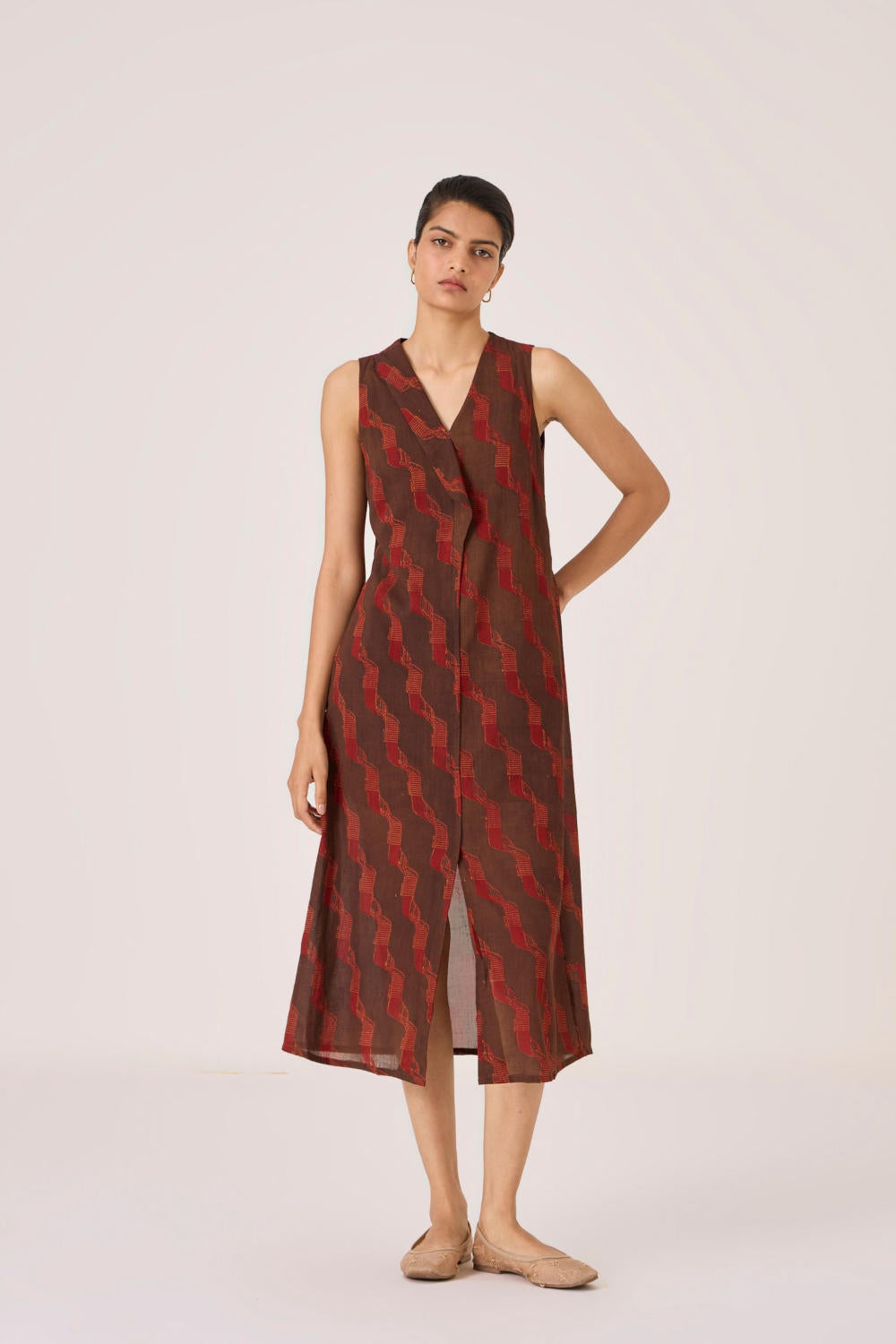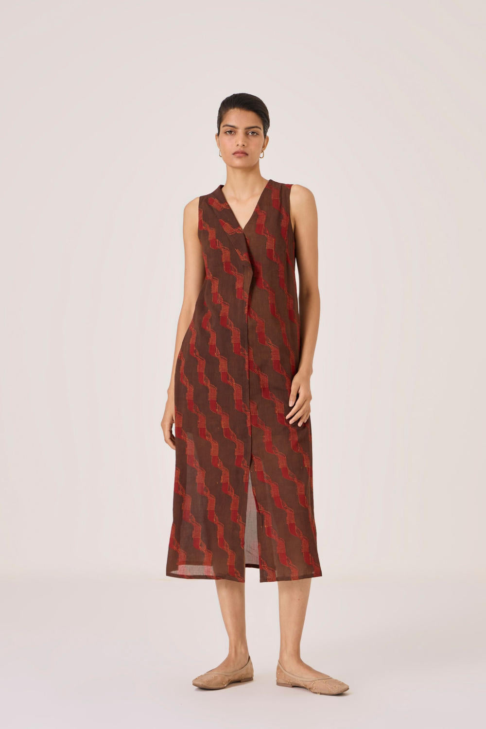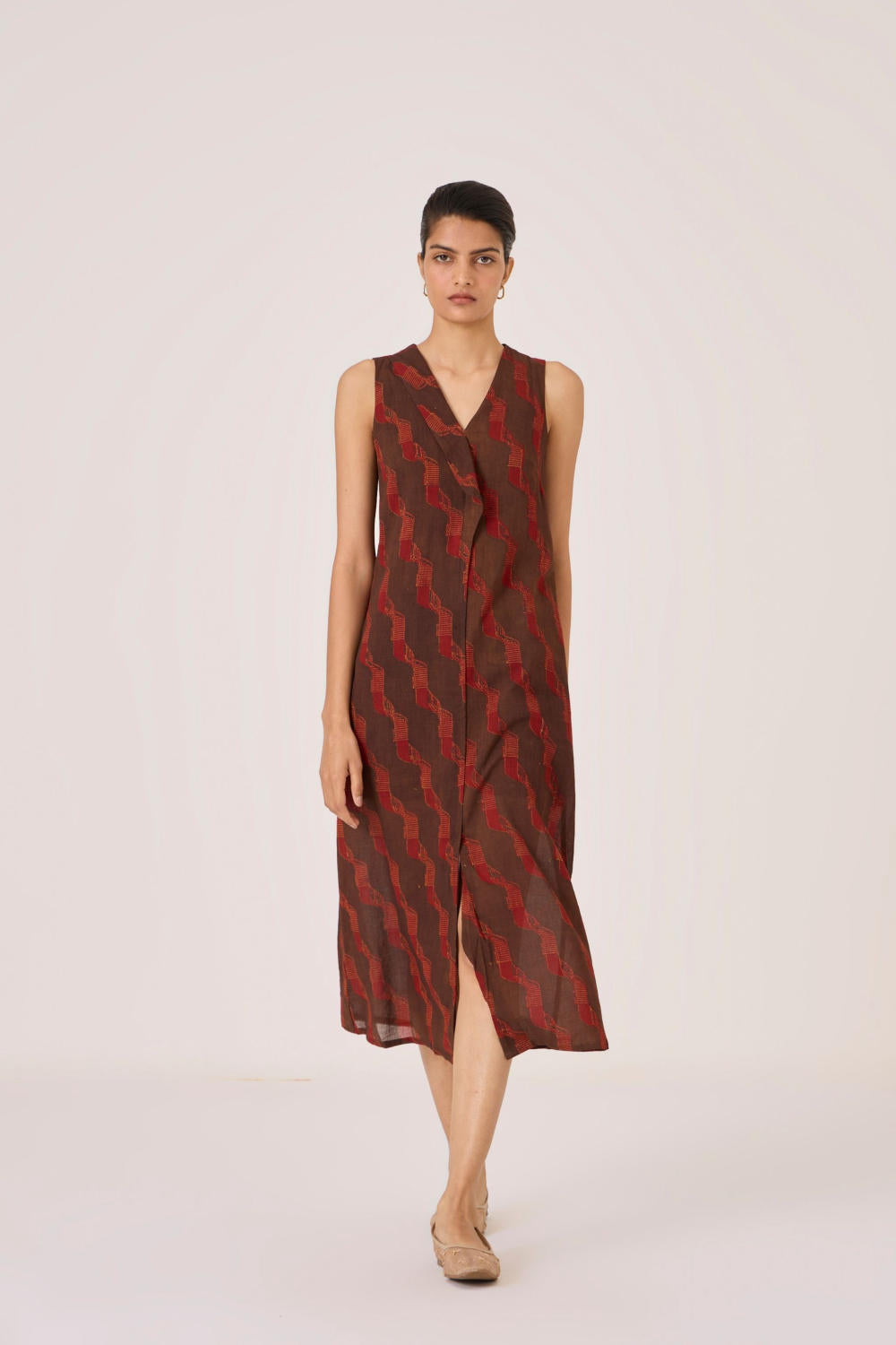 This signature ajrakh block print is designed in our studio and hand block printed by traditional artisans in Gujarat. Print placement may vary from garment to garment. Slight irregularities in print are common and speak to the hand processes involved.