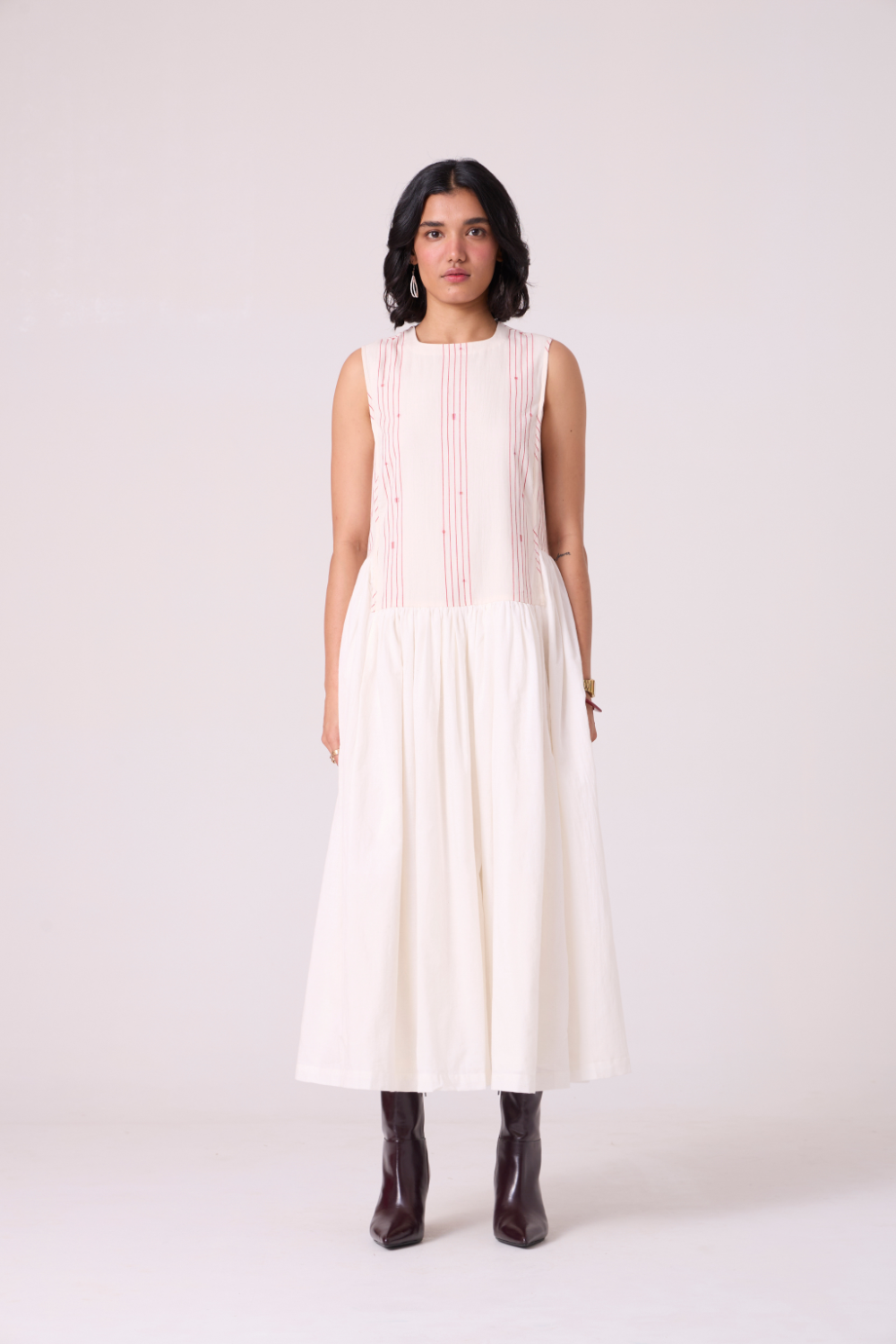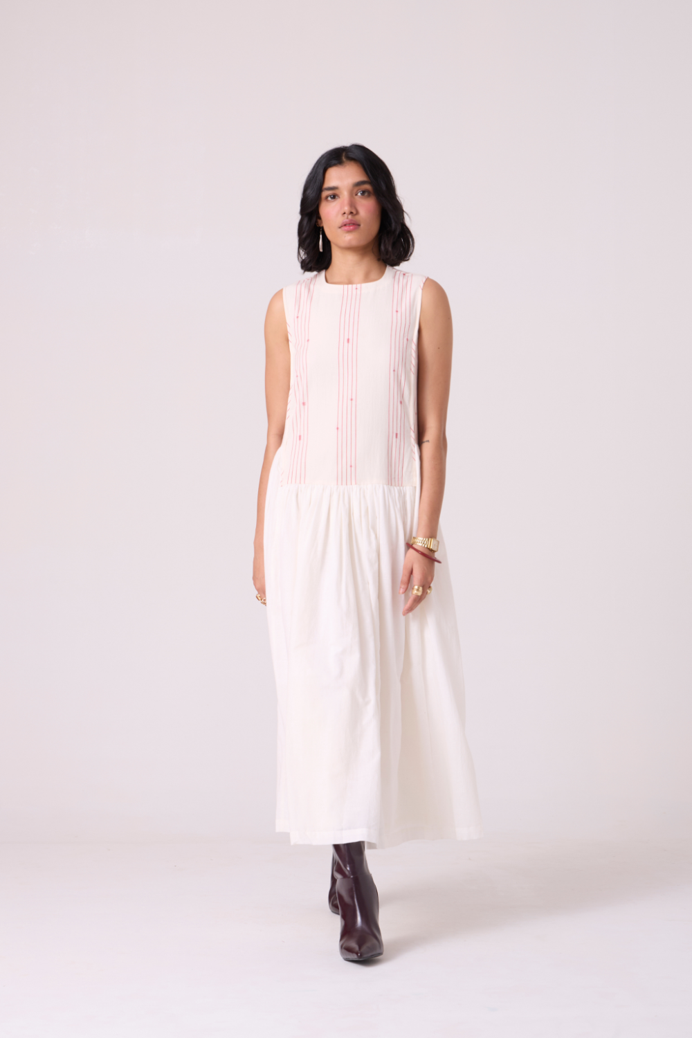A maxi silhouette with sculpted ease. The handwoven Jamdhani bodice draws the eye upward, while subtle gathers and a lifted waistline elongate the figure. Confident yet effortless