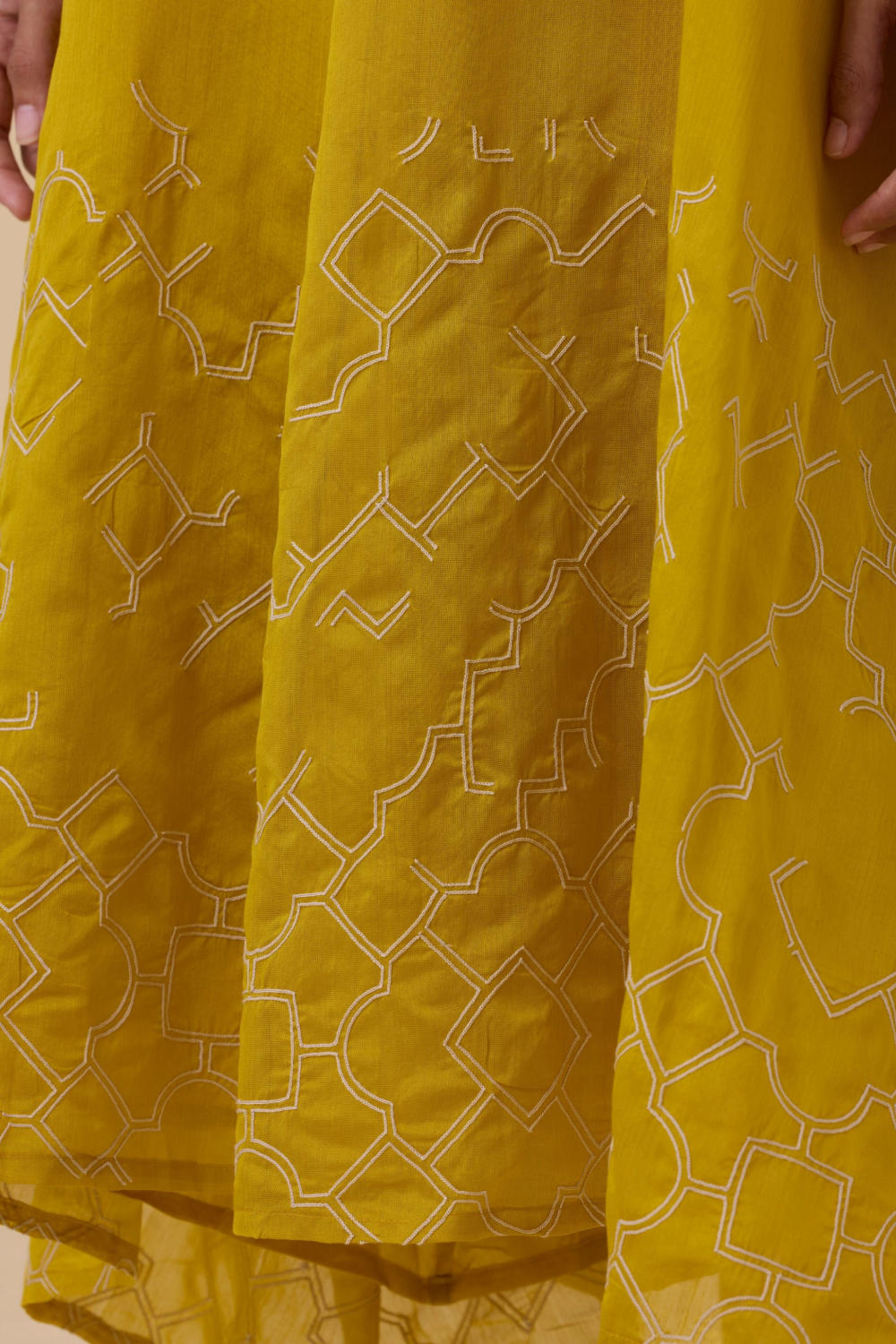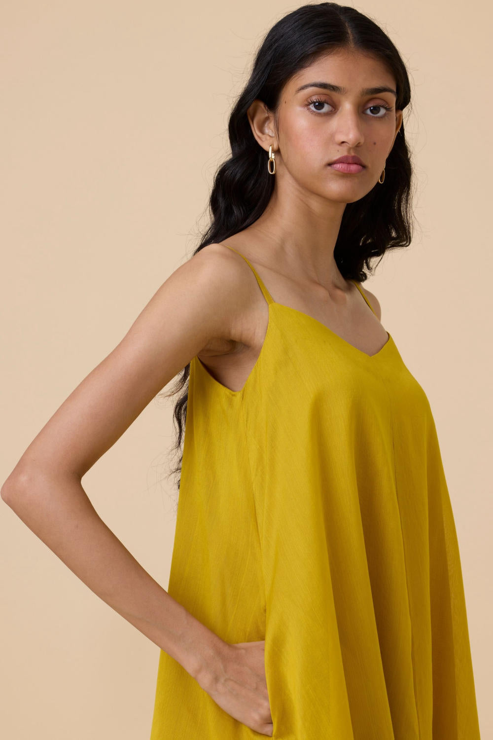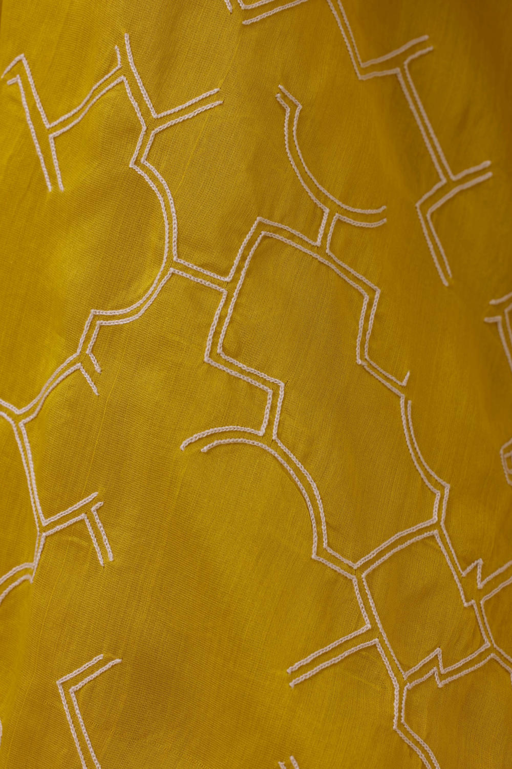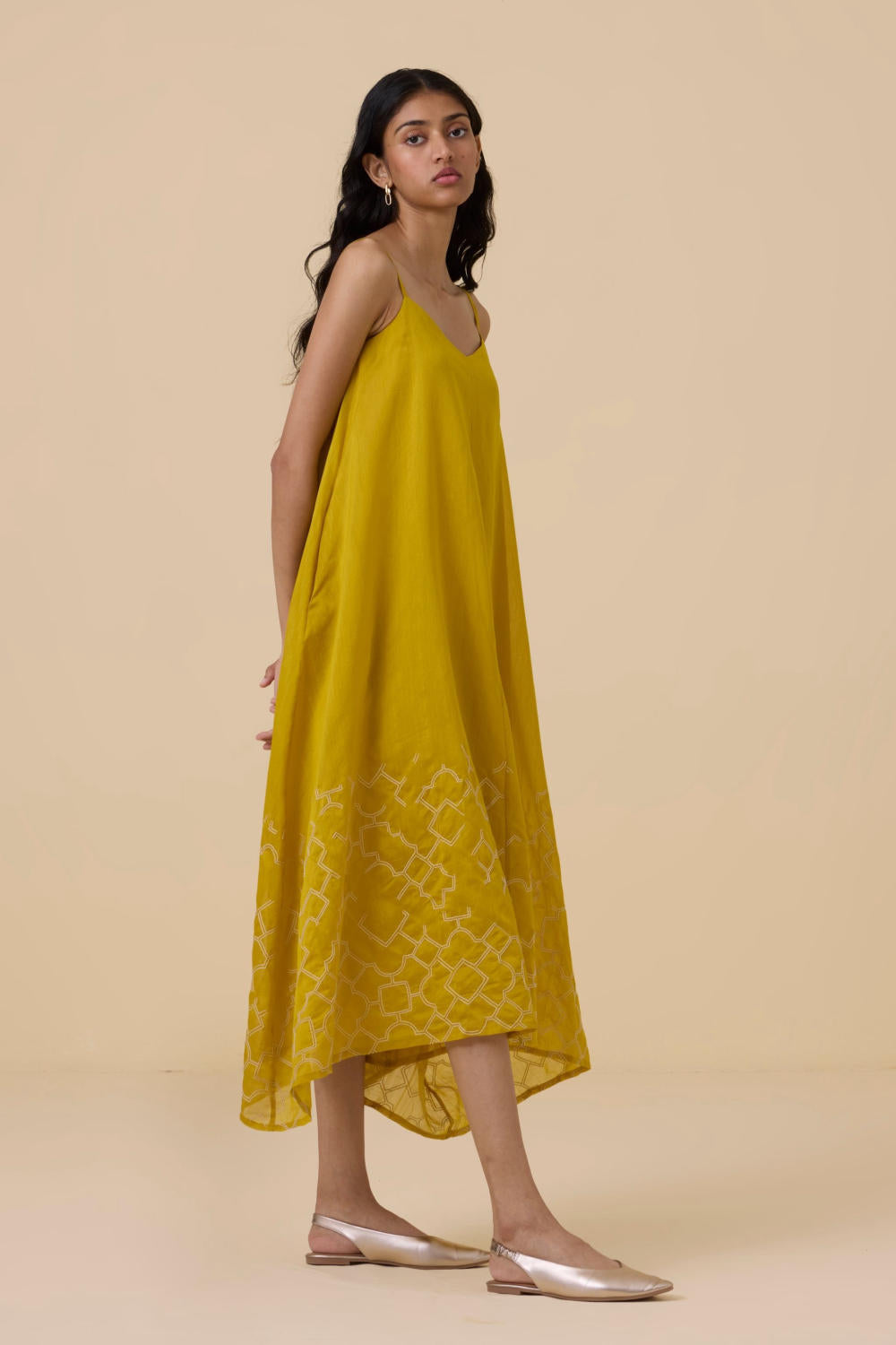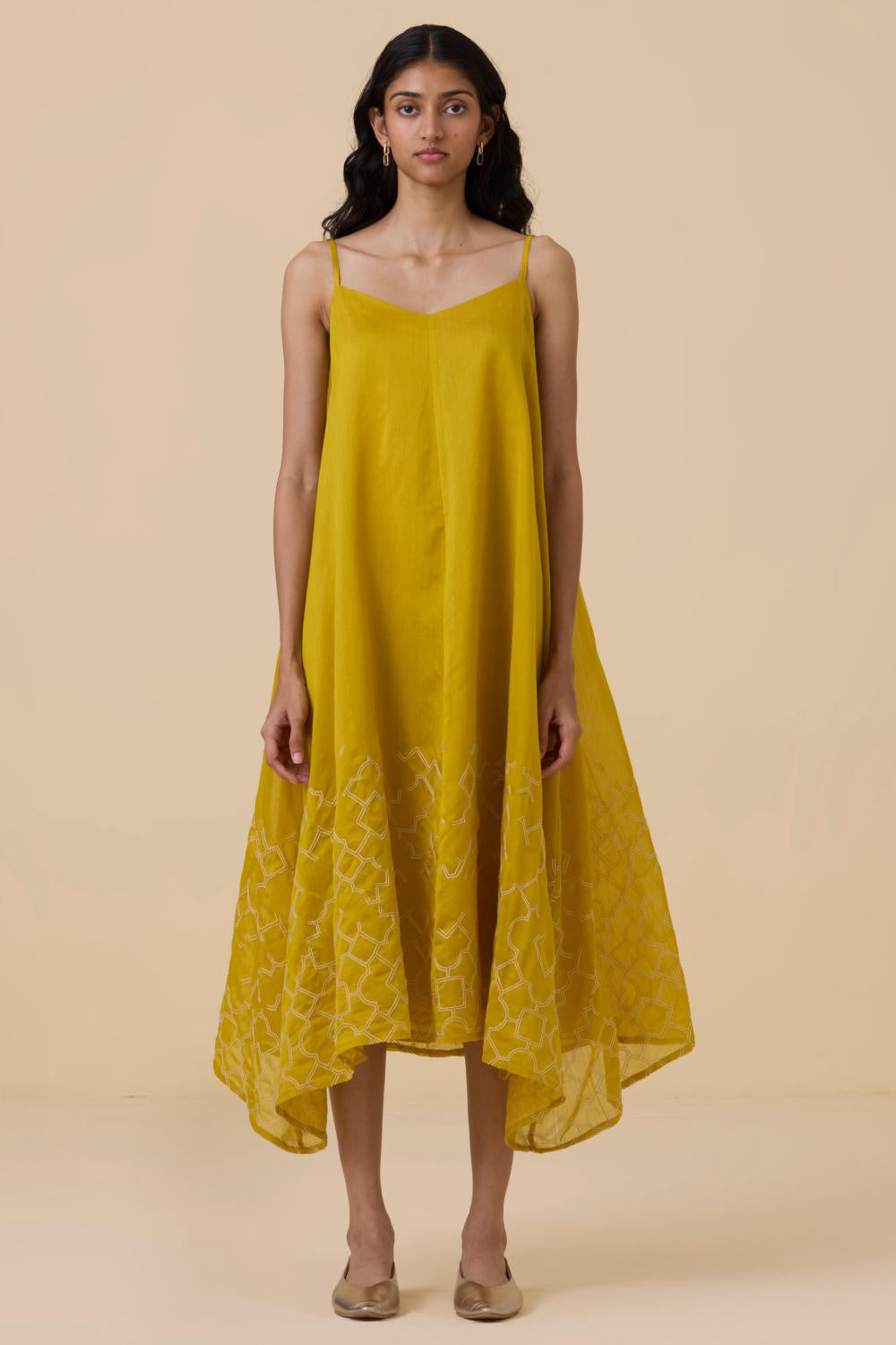 Hand embroidered maxi dress with handkerchief hem. Crafted from chanderi. Adjustable straps. In-seam pockets. This dress is fully lined. This garment is hand embroidered in The Summer House Studio. Note: Slight differences in embroidery speak to the hand processes involved.
