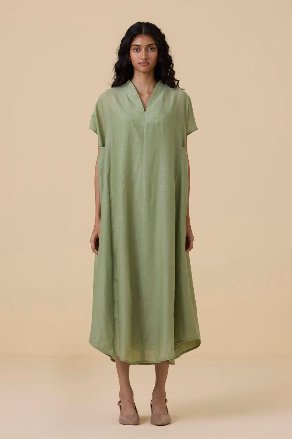 Kaftan-style dress designed with a resort state of mind. Sharp V neckline. Crafted in cotton silk. In-seam pockets. Slip included.