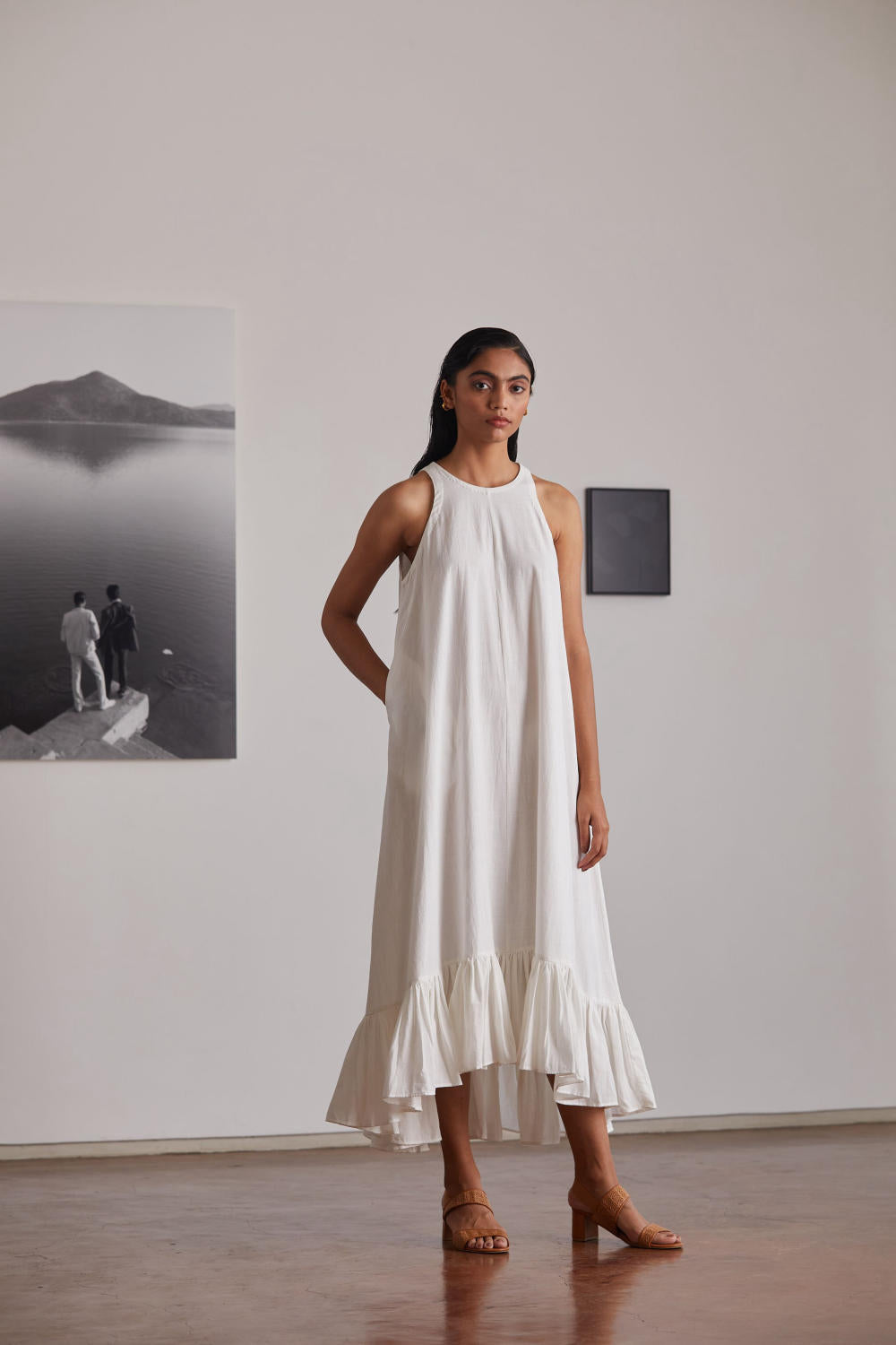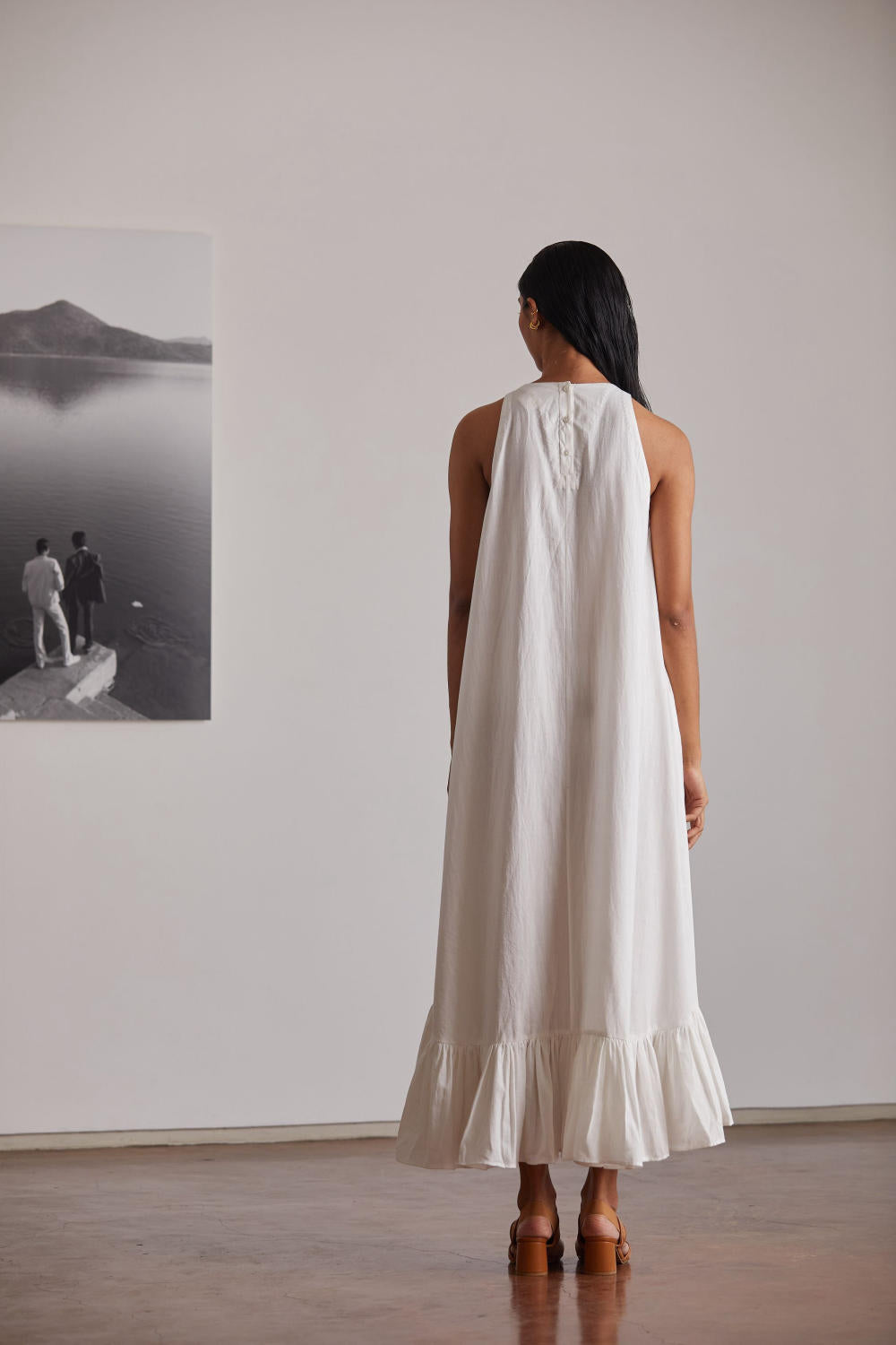Your favourite mid-calf length in a relaxed silhouette. Button opening in the back. Bold ruffle hemline. In-seam pockets.