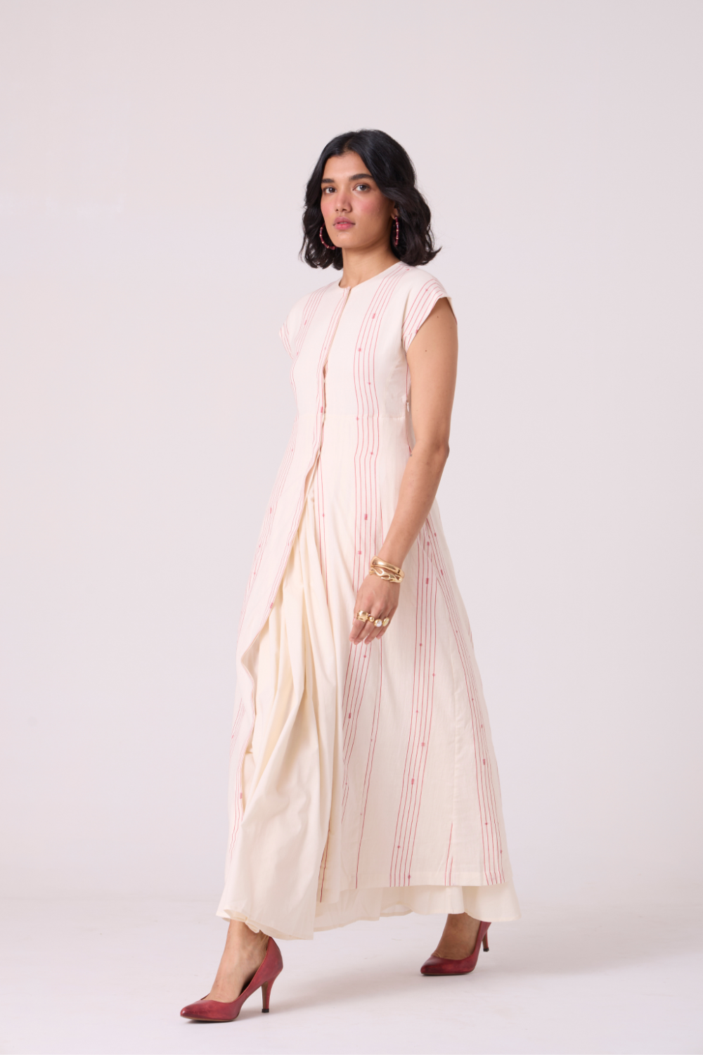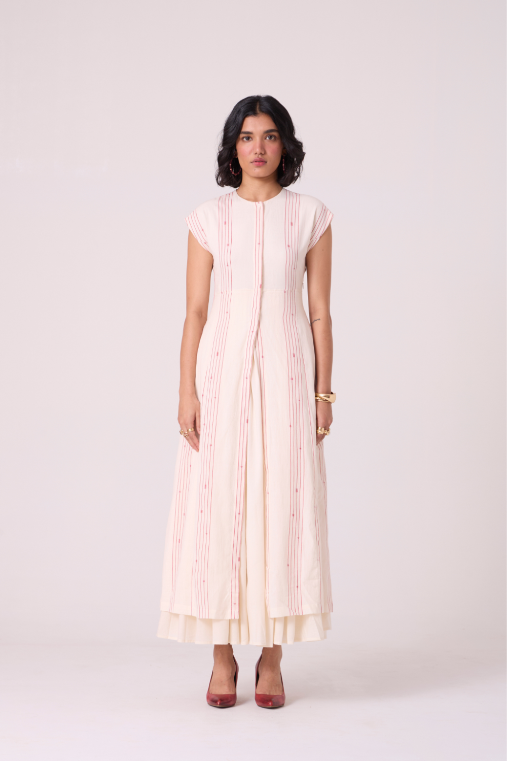 A double-layered maxi that frames the form with quiet structure. The striped outer layer defines the shoulders and neckline, while the softly gathered cotton beneath creates a graceful column through the body. A refined choice for plans that call for understated presence.