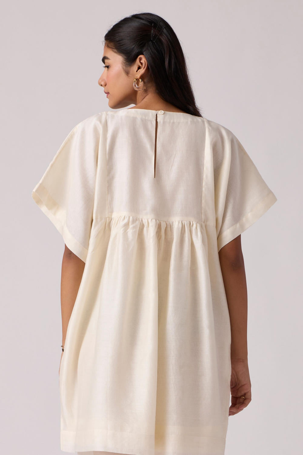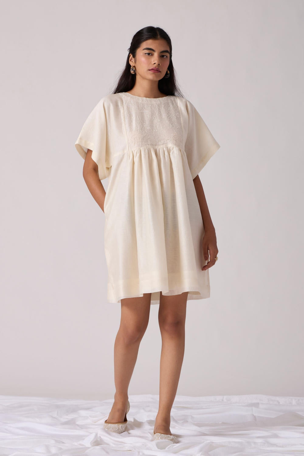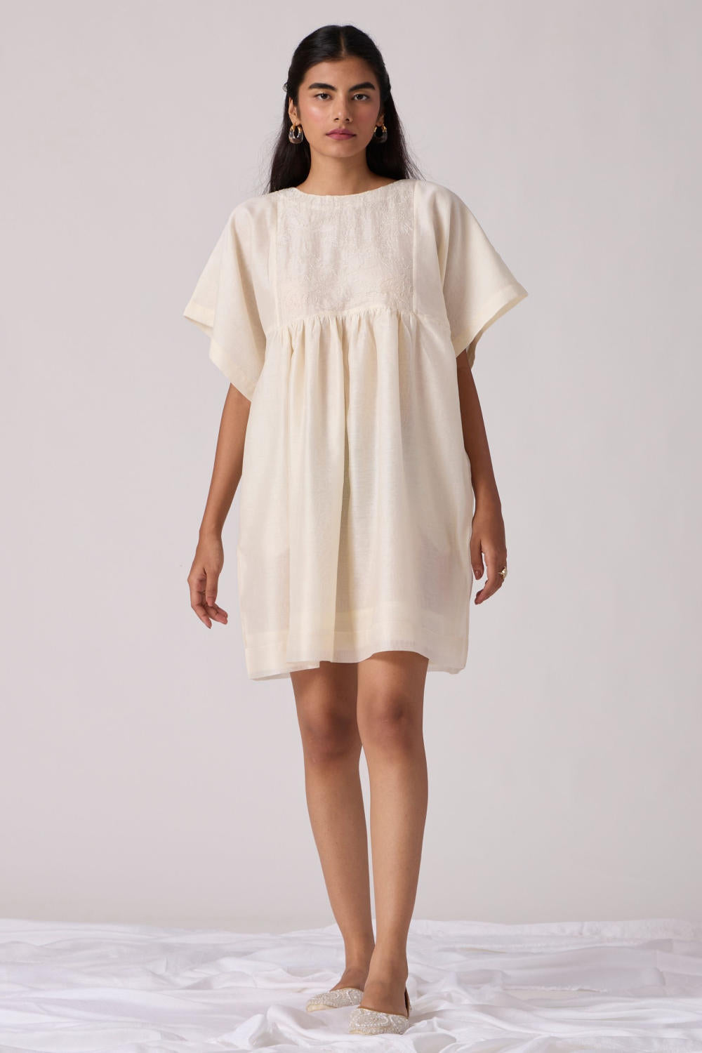 A charming knee-length dress meticulously crafted from handwoven chanderi fabric. This elegant piece showcases delicate embroidery on the yoke, subtle gathering along the yoke seam, and a sophisticated back loop button fastening. To enhance comfort and style, the dress is fully lined, making it perfect for any special occasion.Note : Slight irregularities in embroidery and subtle embroidery markings are inherent and speak to the hand processes involved.