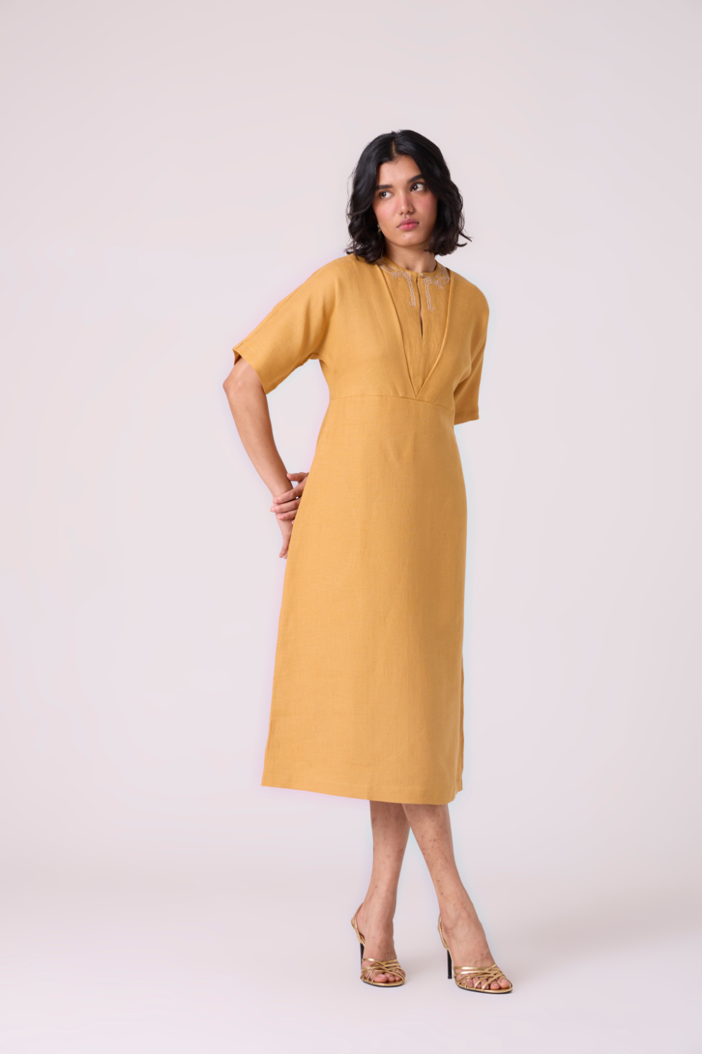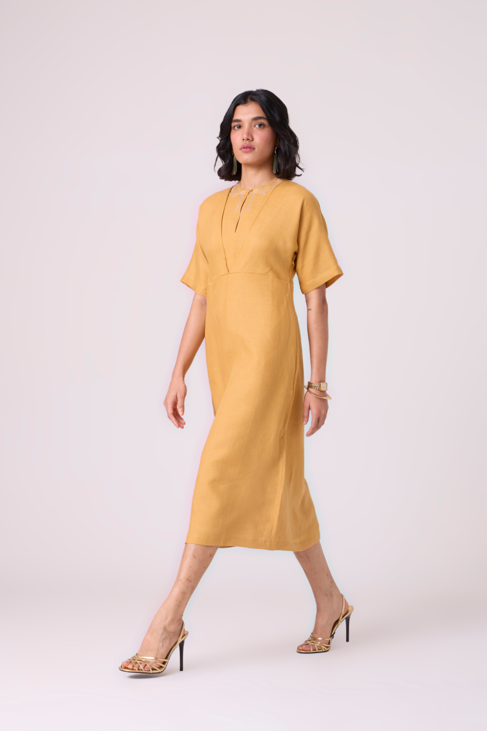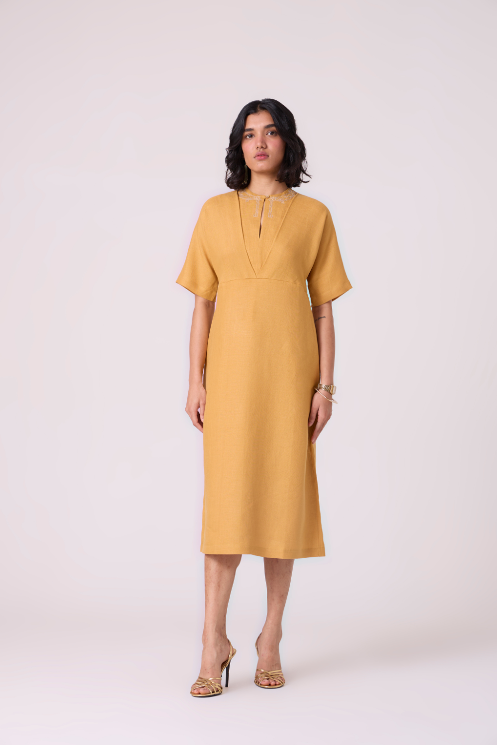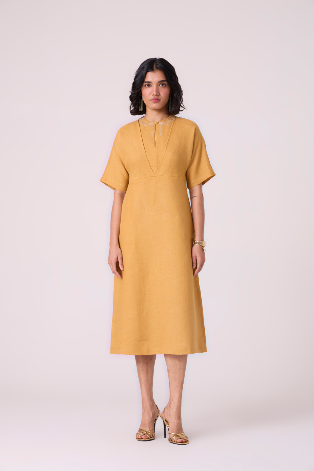 A drop-sleeve dress with a refined, hand-embroidered bodice. A single wide pleat at the waist adds structured ease for movement.