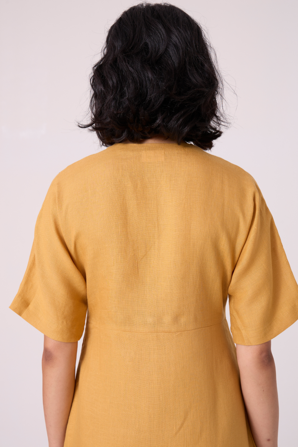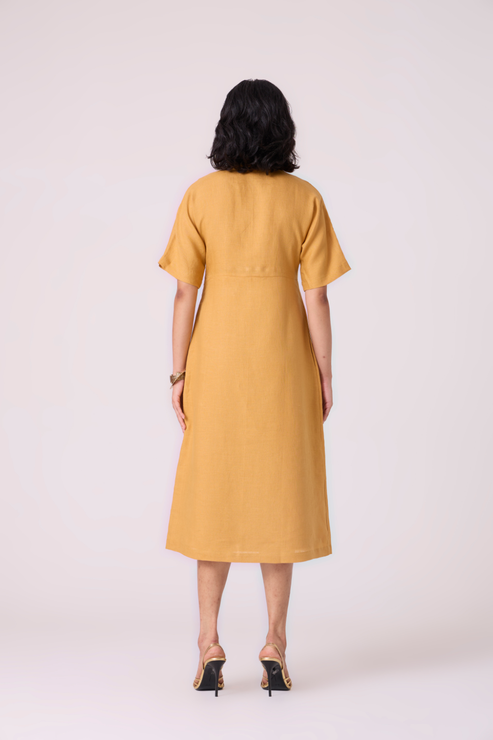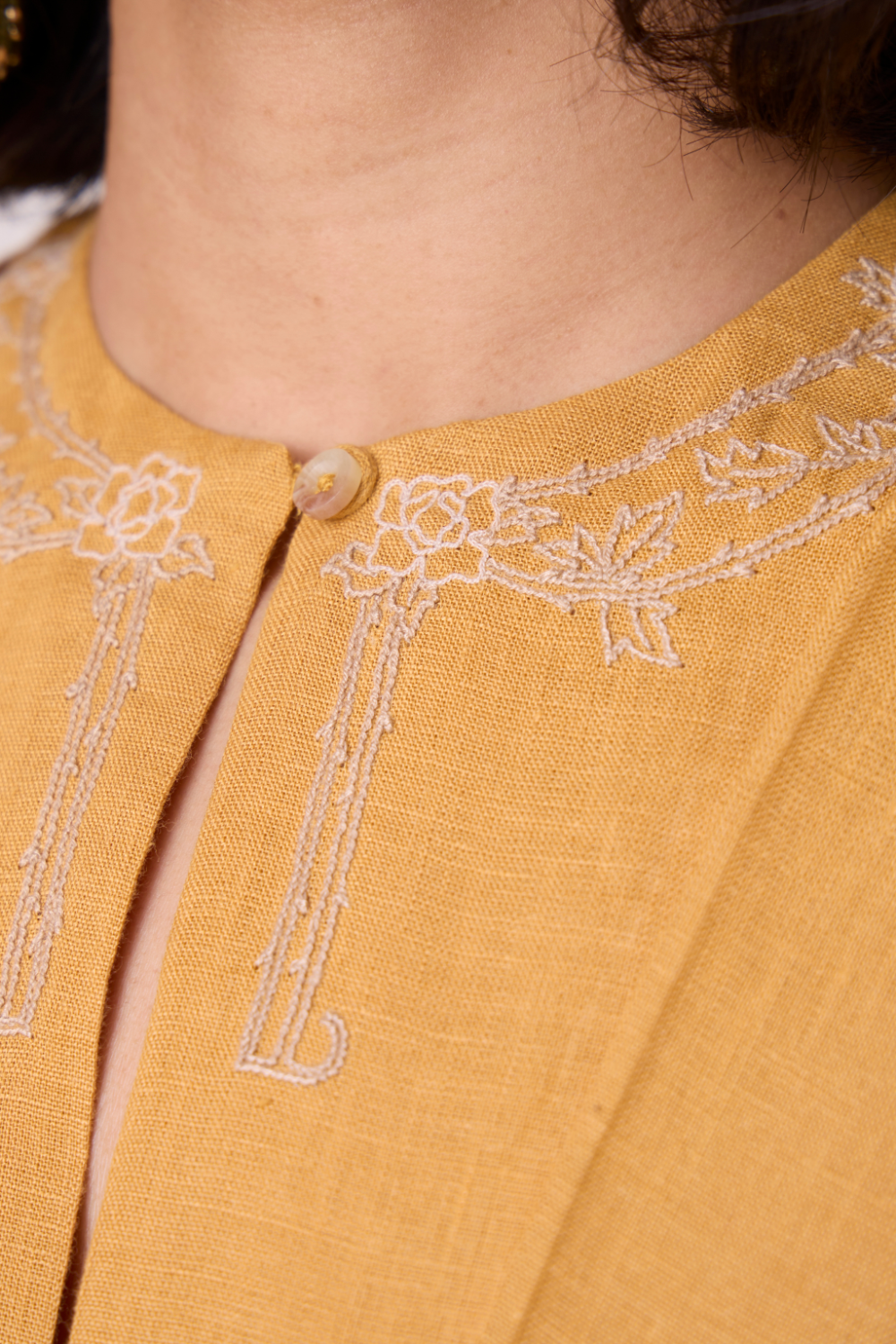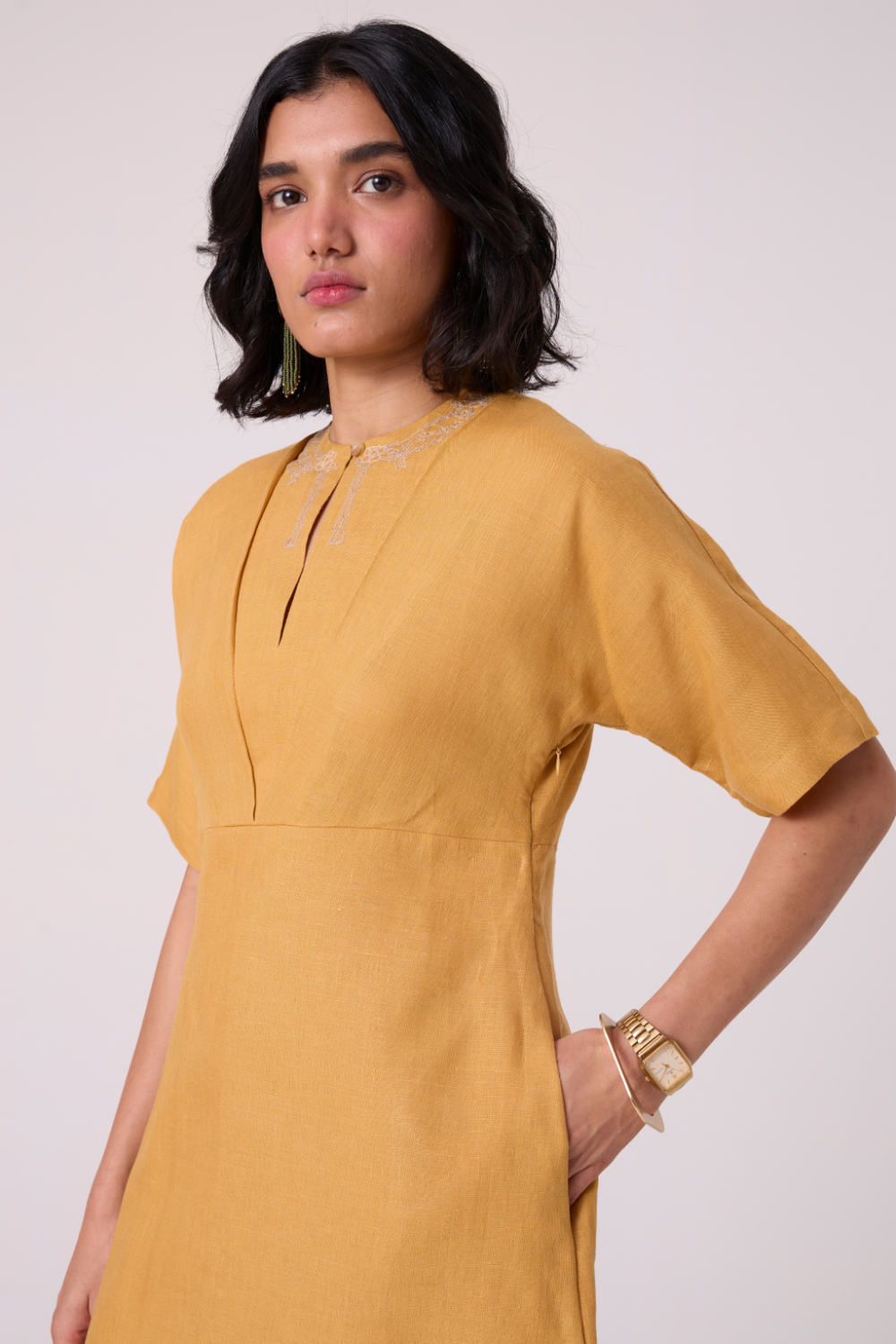 A drop-sleeve dress with a refined, hand-embroidered bodice. A single wide pleat at the waist adds structured ease for movement.