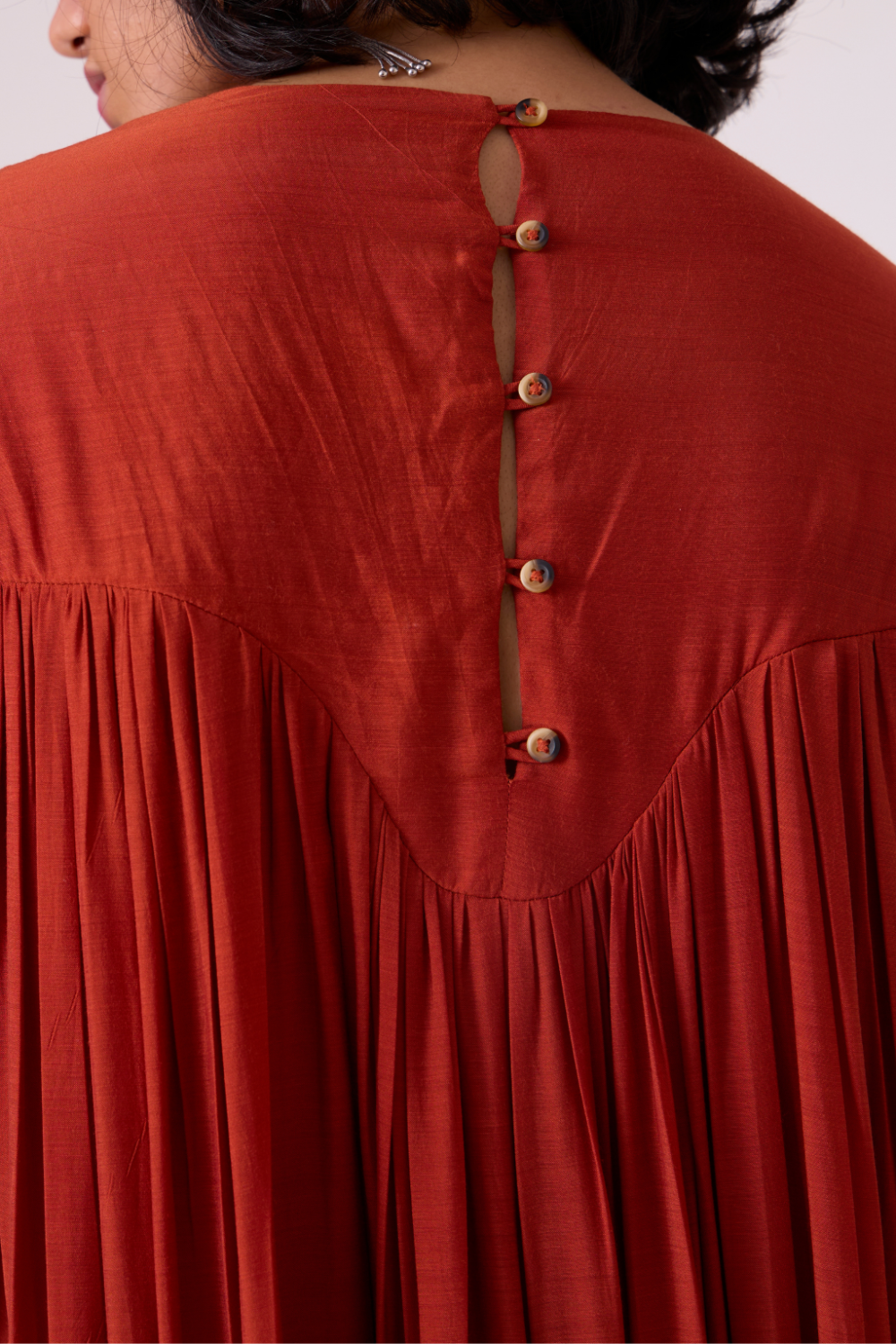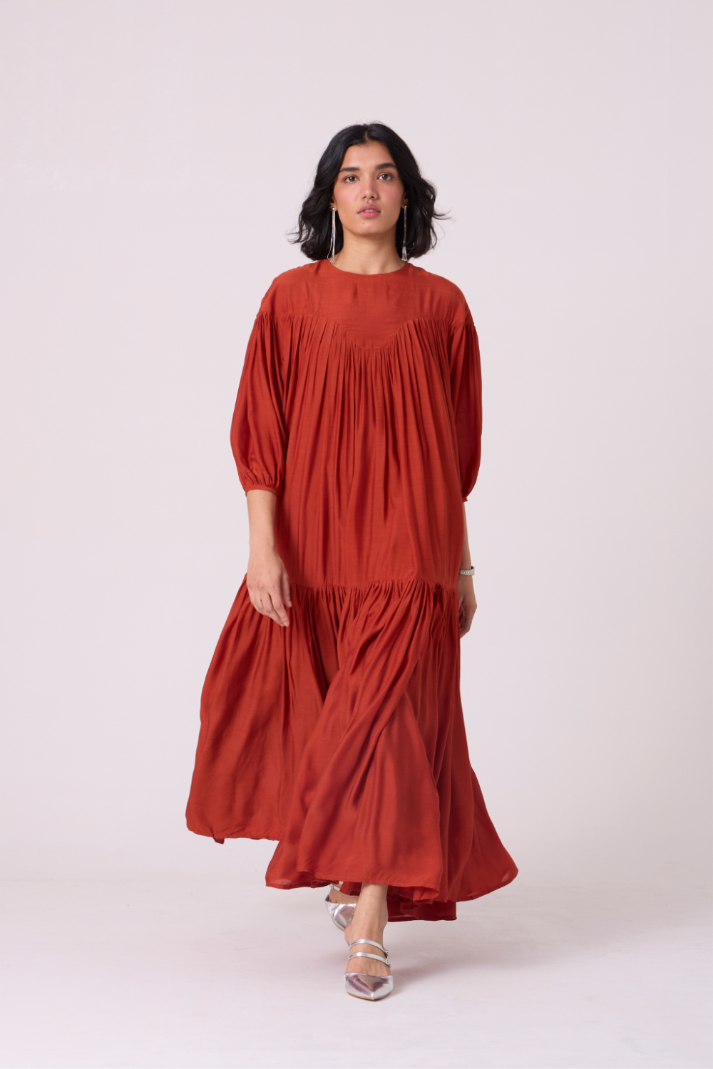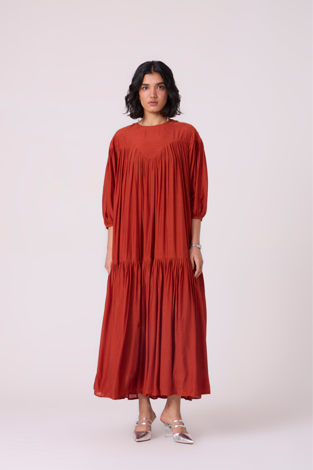 Soft tiers build graceful volume through the length, while gathered sleeves lend a touch of movement at the arms. A piece that holds presence gently. Wear it with a belt to accentuate the waist, though it is perfect as is too.